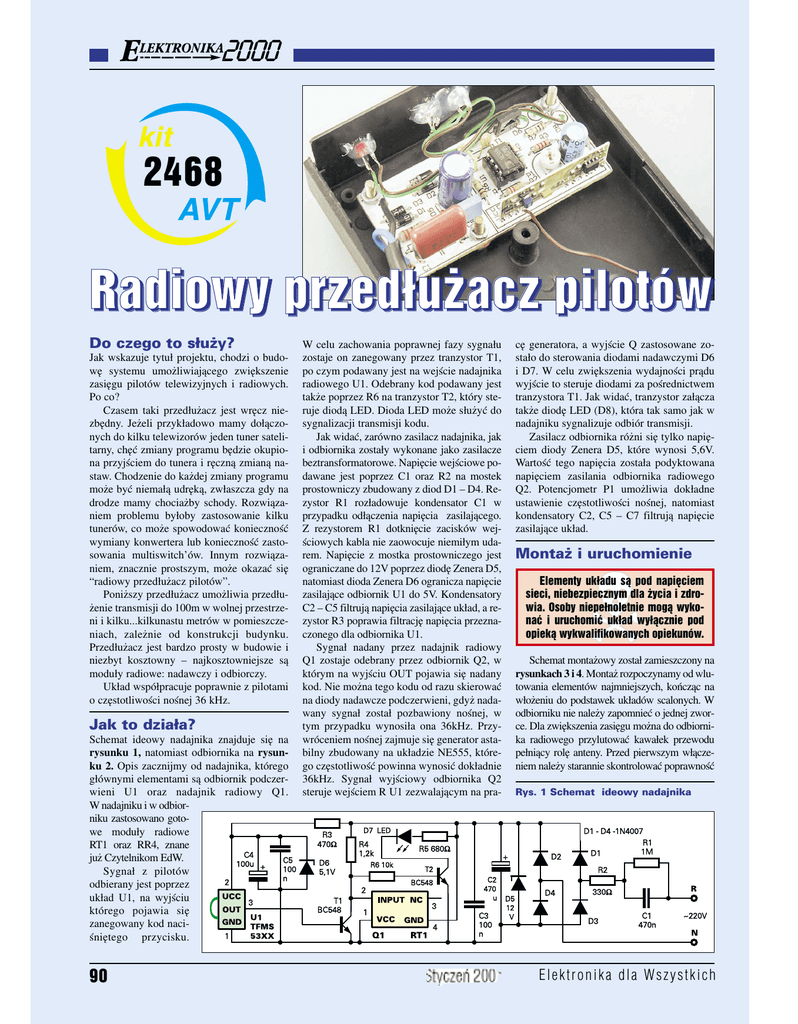 2468 Radiowy przedłużacz pilotów Do czego to służy? Jak wskazuje tytuł projektu, chodzi o budo− wę systemu umożliwiającego zwiększenie zasięgu pilotów telewizyjnych i radiowych. Po co? Czasem taki przedłużacz jest wręcz nie− zbędny. Jeżeli przykładowo mamy dołączo− nych do kilku telewizorów jeden tuner sateli− tarny, chęć zmiany programu będzie okupio− na przyjściem do tunera i ręczną zmianą na− staw. Chodzenie do każdej zmiany programu może być niemałą udręką, zwłaszcza gdy na drodze mamy chociażby schody. Rozwiąza− niem problemu byłoby zastosowanie kilku tunerów, co może spowodować konieczność wymiany konwertera lub konieczność zasto− sowania multiswitch’ów. Innym rozwiąza− niem, znacznie prostszym, może okazać się “radiowy przedłużacz pilotów”. Poniższy przedłużacz umożliwia przedłu− żenie transmisji do 100m w wolnej przestrze− ni i kilku...kilkunastu metrów w pomieszcze− niach, zależnie od konstrukcji budynku. Przedłużacz jest bardzo prosty w budowie i niezbyt kosztowny – najkosztowniejsze są moduły radiowe: nadawczy i odbiorczy. Układ współpracuje poprawnie z pilotami o częstotliwości nośnej 36 kHz. Jak to działa? Schemat ideowy nadajnika znajduje się na rysunku 1, natomiast odbiornika na rysun− ku 2. Opis zacznijmy od nadajnika, którego głównymi elementami są odbiornik podczer− wieni U1 oraz nadajnik radiowy Q1. W nadajniku i w odbior− niku zastosowano goto− we moduły radiowe RT1 oraz RR4, znane już Czytelnikom EdW. Sygnał z pilotów odbierany jest poprzez układ U1, na wyjściu którego pojawia się zanegowany kod naci− śniętego przycisku. 90 W celu zachowania poprawnej fazy sygnału zostaje on zanegowany przez tranzystor T1, po czym podawany jest na wejście nadajnika radiowego U1. Odebrany kod podawany jest także poprzez R6 na tranzystor T2, który ste− ruje diodą LED. Dioda LED może służyć do sygnalizacji transmisji kodu. Jak widać, zarówno zasilacz nadajnika, jak i odbiornika zostały wykonane jako zasilacze beztransformatorowe. Napięcie wejściowe po− dawane jest poprzez C1 oraz R2 na mostek prostowniczy zbudowany z diod D1 – D4. Re− zystor R1 rozładowuje kondensator C1 w przypadku odłączenia napięcia zasilającego. Z rezystorem R1 dotknięcie zacisków wej− ściowych kabla nie zaowocuje niemiłym uda− rem. Napięcie z mostka prostowniczego jest ograniczane do 12V poprzez diodę Zenera D5, natomiast dioda Zenera D6 ogranicza napięcie zasilające odbiornik U1 do 5V. Kondensatory C2 – C5 filtrują napięcia zasilające układ, a re− zystor R3 poprawia filtrację napięcia przezna− czonego dla odbiornika U1. Sygnał nadany przez nadajnik radiowy Q1 zostaje odebrany przez odbiornik Q2, w którym na wyjściu OUT pojawia się nadany kod. Nie można tego kodu od razu skierować na diody nadawcze podczerwieni, gdyż nada− wany sygnał został pozbawiony nośnej, w tym przypadku wynosiła ona 36kHz. Przy− wróceniem nośnej zajmuje się generator asta− bilny zbudowany na układzie NE555, które− go częstotliwość powinna wynosić dokładnie 36kHz. Sygnał wyjściowy odbiornika Q2 steruje wejściem R U1 zezwalającym na pra− cę generatora, a wyjście Q zastosowane zo− stało do sterowania diodami nadawczymi D6 i D7. W celu zwiększenia wydajności prądu wyjście to steruje diodami za pośrednictwem tranzystora T1. Jak widać, tranzystor załącza także diodę LED (D8), która tak samo jak w nadajniku sygnalizuje odbiór transmisji. Zasilacz odbiornika różni się tylko napię− ciem diody Zenera D5, które wynosi 5,6V. Wartość tego napięcia została podyktowana napięciem zasilania odbiornika radiowego Q2. Potencjometr P1 umożliwia dokładne ustawienie częstotliwości nośnej, natomiast kondensatory C2, C5 – C7 filtrują napięcie zasilające układ. Montaż i uruchomienie Elementy układu są pod napięciem sieci, niebezpiecznym dla życia i zdro− wia. Osoby niepełnoletnie mogą wyko− nać i uruchomić układ wyłącznie pod opieką wykwalifikowanych opiekunów. Schemat montażowy został zamieszczony na rysunkach 3 i 4. Montaż rozpoczynamy od wlu− towania elementów najmniejszych, kończąc na włożeniu do podstawek układów scalonych. W odbiorniku nie należy zapomnieć o jednej zwor− ce. Dla zwiększenia zasięgu można do odbiorni− ka radiowego przylutować kawałek przewodu pełniący rolę anteny. Przed pierwszym włącze− niem należy starannie skontrolować poprawność Rys. 1 Schemat ideowy nadajnika Elektronika dla Wszystkich montażu, ponieważ błędy mogą spowodować nieodwracalne uszkodzenie elementów, a na− wet wybuch. Uwaga! Ze względu na zastosowanie za− silaczy beztransformatorowych obwody nadajnika i odbiornika znajdują się pod nie− bezpiecznym dla życia napięciem sieci. Tylko dlatego projekt oznaczono trzema gwiazdka− mi – samo wykonanie i uruchomienie syste− mu nie jest trudne i nie powinno sprawić kło− potów średnio zaawansowanym hobbystom. Ze względów bezpieczeństwa przy uru− chamianiu i regulacjach stanowczo zaleca się zasilić oba układy z zasilaczy warsztatowych bądź wtyczkowych. Zasilacze te należy dołą− czyć zamiast diod D5 w odbiorniku, jak i w nadajniku. Należy pamiętać, że dołączone za− silacze powinny mieć napięcia równe napię− ciom jakie mają diody Zenera, oznaczone D5. Do prawidłowej pracy układ odbiornika wy− maga ustawienia potencjometrem P1 często− tliwości 36kHz. Należy dołączyć końcówkę 4 układu U1 do plusa zasilania, natomiast do wyjścia generatora dołączyć częstościomierz. Jeżeli nie posiadamy częstościomierza, może− my dokonać regulacji na największy zasięg działania. Do nadajnika należy zbliżyć pilot, Rys. 2 Schemat ideowy odbiornika Elektronika dla Wszystkich naciskając określony przycisk, natomiast odbiornik powinien być skierowany na odpo− wiedni odbi