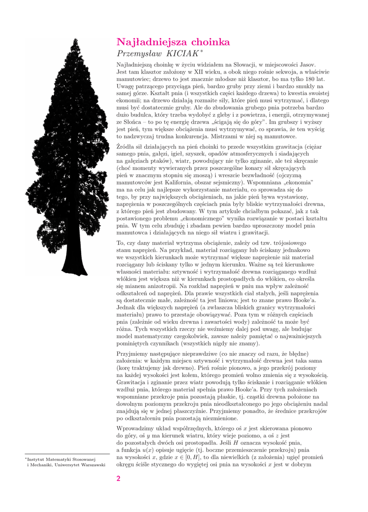 Najładniejsza choinka Przemysław KICIAK * Najładniejszą choinkę w życiu widziałem na Słowacji, w miejscowości Jasov. Jest tam klasztor założony w XII wieku, a obok niego rośnie sekwoja, a właściwie mamutowiec; drzewo to jest znacznie młodsze niż klasztor, bo ma tylko 180 lat. Uwagę patrzącego przyciąga pień, bardzo gruby przy ziemi i bardzo smukły na samej górze. Kształt pnia (i wszystkich części każdego drzewa) to kwestia swoistej ekonomii; na drzewo działają rozmaite siły, które pień musi wytrzymać, i dlatego musi być dostatecznie gruby. Ale do zbudowania grubego pnia potrzeba bardzo dużo budulca, który trzeba wydobyć z gleby i z powietrza, i energii, otrzymywanej ze Słońca – to po tę energię drzewa „ścigają się do góry”. Im grubszy i wyższy jest pień, tym większe obciążenia musi wytrzymywać, co sprawia, że ten wyścig to nadzwyczaj trudna konkurencja. Mistrzami w niej są mamutowce. Źródła sił działających na pień choinki to przede wszystkim grawitacja (ciężar samego pnia, gałęzi, igieł, szyszek, opadów atmosferycznych i siadających na gałęziach ptaków), wiatr, powodujący nie tylko zginanie, ale też skręcanie (choć momenty wywieranych przez poszczególne konary sił skręcających pień w znacznym stopniu się znoszą) i wreszcie bezwładność (ojczyzną mamutowców jest Kalifornia, obszar sejsmiczny). Wspomniana „ekonomia” ma na celu jak najlepsze wykorzystanie materiału, co sprowadza się do tego, by przy największych obciążeniach, na jakie pień bywa wystawiony, naprężenia w poszczególnych częściach pnia były bliskie wytrzymałości drewna, z którego pień jest zbudowany. W tym artykule chciałbym pokazać, jak z tak postawionego problemu „ekonomicznego” wynika rozwiązanie w postaci kształtu pnia. W tym celu zbuduję i zbadam pewien bardzo uproszczony model pnia mamutowca i działających na niego sił wiatru i grawitacji. To, czy dany materiał wytrzyma obciążenie, zależy od tzw. trójosiowego stanu naprężeń. Na przykład, materiał rozciągany lub ściskany jednakowo we wszystkich kierunkach może wytrzymać większe naprężenie niż materiał rozciągany lub ściskany tylko w jednym kierunku. Ważne są też kierunkowe własności materiału: sztywność i wytrzymałość drewna rozciąganego wzdłuż włókien jest większa niż w kierunkach prostopadłych do włókien, co określa się mianem anizotropii. Na rozkład naprężeń w pniu ma wpływ zależność odkształceń od naprężeń. Dla prawie wszystkich ciał stałych, jeśli naprężenia są dostatecznie małe, zależność ta jest liniowa; jest to znane prawo Hooke’a. Jednak dla większych naprężeń (a zwłaszcza bliskich granicy wytrzymałości materiału) prawo to przestaje obowiązywać. Poza tym w różnych częściach pnia (zależnie od wieku drewna i zawartości wody) zależność ta może być różna. Tych wszystkich rzeczy nie weźmiemy dalej pod uwagę, ale budując model matematyczny czegokolwiek, zawsze należy pamiętać o najważniejszych pominiętych czynnikach (wszystkich nigdy nie znamy). Przyjmiemy następujące nieprawdziwe (co nie znaczy od razu, że błędne) założenia: w każdym miejscu sztywność i wytrzymałość drewna jest taka sama (korę traktujemy jak drewno). Pień rośnie pionowo, a jego przekrój poziomy na każdej wysokości jest kołem, którego promień wolno zmienia się z wysokością. Grawitacja i zginanie przez wiatr powodują tylko ściskanie i rozciąganie włókien wzdłuż pnia, którego materiał spełnia prawo Hooke’a. Przy tych założeniach wspomniane przekroje pnia pozostają płaskie, tj. cząstki drewna położone na dowolnym poziomym przekroju pnia nieodkształconego po jego obciążeniu nadal znajdują się w jednej płaszczyźnie. Przyjmiemy ponadto, że średnice przekrojów po odkształceniu pnia pozostają niezmienione. ∗ Instytut Matematyki Stosowanej i Mechaniki, Uniwersytet Warszawski Wprowadzimy układ współrzędnych, którego oś x jest skierowana pionowo do góry, oś y ma kierunek wiatru, który wieje poziomo, a oś z jest do pozostałych dwóch osi prostopadła. Jeśli H oznacza wysokość pnia, a funkcja u(x) opisuje ugięcie (tj. boczne przemieszczenie przekroju) pnia na wysokości x, gdzie x ∈ [0, H], to dla niewielkich (z założenia) ugięć promień okręgu ściśle stycznego do wygiętej osi pnia na wysokości x jest w dobrym 2 przybliżeniu równy R(x) = 1/u′′ (x). Jeśli w tym miejscu przekrój pnia ma promień r(x), to maksymalne względne zmiany długości włókien, spowodowane przez wygięcie pnia, są równe ±r(x)/R(x) = ±r(x)u′′ (x). Wprowadźmy w płaszczyźnie przekroju pnia lokalny układ współrzędnych η, ζ, mający początek w środku przekroju i taki, że oś η przed odkształceniem pnia ma kierunek i zwrot osi y. Względne odkształcenie włókna przecinającego przekrój w punkcie (η, ζ) jest proporcjonalne do η. Z prawa Hooke’a wynika, że także naprężenie włókna jest proporcjonalne do η. Naprężenia włókien spowodowane przez zginanie pnia w rozważanym przekroju są zatem opisane przez funkcję η , σz (η, ζ) = σz max r(x) której wartość dodatnia oznacza, że włókno jest ściskane. Wypadkowy moment siły dla naprężeń w przekroju pnia na wysokości x możemy wyrazić za pomocą całki po kole K(x) – przekroju pnia na tej wysokości; całka ta jest objętością bryły pod wykresem funkcji ησz (η, ζ) (rys. 1), a oblicza się ją tak: Z Z σz max 2 M (x) = η dη dζ = ησz (η, ζ) dη dζ = K(x) K(x) r(x) π = r3 (x)σz max . 4 Z otrzymanego wyżej wzoru wynika, że wytrzymałość pnia na zginanie jest proporcjonalna do trzeciej potęgi promienia przekroju. Podobna zależność wytrzymałości od wielkości przekroju ma miejsce również dla belek, których przekroje mają kształt inny niż koło. Rys. 1 Rys. 2 Rys. 3 Pomińmy chwilowo naprężenia spowodowane prz
