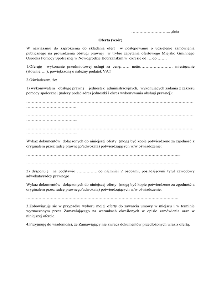 ……………………….. ,dnia Oferta (wzór) W nawiązaniu do zaproszenia do składania ofert w postępowaniu o udzielenie zamówienia publicznego na prowadzenia obsługi prawnej w trybie zapytania ofertowego Miejsko Gminnego Ośrodka Pomocy Społecznej w Nowogrodzie Bobrzańskim w okresie od ….do ……. 1.Oferuję wykonanie przedmiotowej usługi za cenę:…… netto…………………… miesięcznie (słownie…..), powiększoną o należny podatek VAT 2.Oświadczam, że: 1) wykonywałem obsługę prawną jednostek administracyjnych, wykonujących zadania z zakresu pomocy społecznej (należy podać adres jednostki i okres wykonywania obsługi prawnej): …………………………………………………………………………………………………………… ………………………………. …………………………………………………………………………………………………………… ……………………………….. …………………………………………………………………………………………………………… ……………………………….. Wykaz dokumentów dołączonych do niniejszej oferty (mogą być kopie potwierdzone za zgodność z oryginałem przez radcę prawnego/adwokata) potwierdzających w/w oświadczenie: …………………………………………………………………………………………………... ………………………………………………………………………………………………….. 2) dysponuję na podstawie …………….co najmniej 2 osobami, posiadającymi tytuł zawodowy adwokata/radcy prawnego Wykaz dokumentów dołączonych do niniejszej oferty (mogą być kopie potwierdzone za zgodność z oryginałem przez radcę prawnego/adwokata) potwierdzających w/w oświadczenie: …………………………………………………………………………………………………. 3.Zobowiązuję się w przypadku wyboru mojej oferty do zawarcia umowy w miejscu i w terminie wyznaczonym przez Zamawiającego na warunkach określonych w opisie zamówienia oraz w niniejszej ofercie. 4.Przyjmuję do wiadomości, że Zamawiający nie zwraca dokumentów przedłożonych wraz z ofertą.