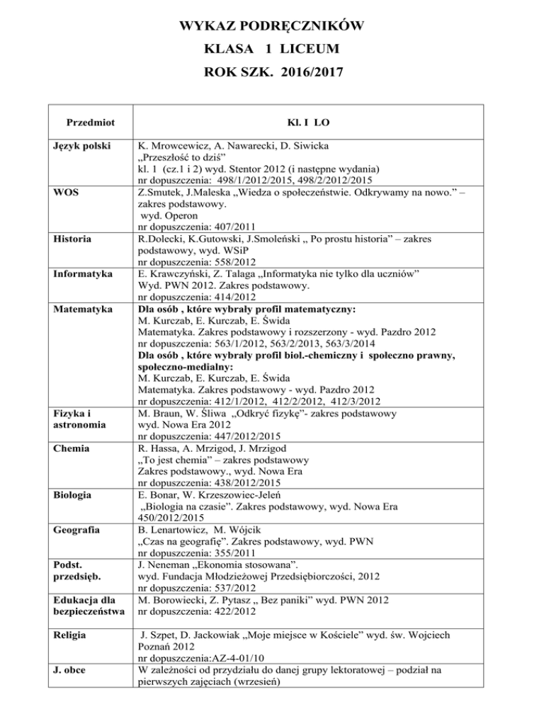 WYKAZ PODRĘCZNIKÓW KLASA 1 LICEUM ROK SZK. 2016/2017 Przedmiot Język polski WOS Historia Informatyka Matematyka Fizyka i astronomia Chemia Biologia Geografia Podst. przedsięb. Edukacja dla bezpieczeństwa Religia J. obce Kl. I LO K. Mrowcewicz, A. Nawarecki, D. Siwicka „Przeszłość to dziś” kl. 1 (cz.1 i 2) wyd. Stentor 2012 (i następne wydania) nr dopuszczenia: 498/1/2012/2015, 498/2/2012/2015 Z.Smutek, J.Maleska „Wiedza o społeczeństwie. Odkrywamy na nowo.” – zakres podstawowy. wyd. Operon nr dopuszczenia: 407/2011 R.Dolecki, K.Gutowski, J.Smoleński „ Po prostu historia” – zakres podstawowy, wyd. WSiP nr dopuszczenia: 558/2012 E. Krawczyński, Z. Talaga „Informatyka nie tylko dla uczniów” Wyd. PWN 2012. Zakres podstawowy. nr dopuszczenia: 414/2012 Dla osób , które wybrały profil matematyczny: M. Kurczab, E. Kurczab, E. Świda Matematyka. Zakres podstawowy i rozszerzony - wyd. Pazdro 2012 nr dopuszczenia: 563/1/2012, 563/2/2013, 563/3/2014 Dla osób , które wybrały profil biol.-chemiczny i społeczno prawny, społeczno-medialny: M. Kurczab, E. Kurczab, E. Świda Matematyka. Zakres podstawowy - wyd. Pazdro 2012 nr dopuszczenia: 412/1/2012, 412/2/2012, 412/3/2012 M. Braun, W. Śliwa „Odkryć fizykę”- zakres podstawowy wyd. Nowa Era 2012 nr dopuszczenia: 447/2012/2015 R. Hassa, A. Mrzigod, J. Mrzigod „To jest chemia” – zakres podstawowy Zakres podstawowy., wyd. Nowa Era nr dopuszczenia: 438/2012/2015 E. Bonar, W. Krzeszowiec-Jeleń „Biologia na czasie”. Zakres podstawowy, wyd. Nowa Era 450/2012/2015 B. Lenartowicz, M. Wójcik „Czas na geografię”. Zakres podstawowy, wyd. PWN nr dopuszczenia: 355/2011 J. Neneman „Ekonomia stosowana”. wyd. Fundacja Młodzieżowej Przedsiębiorczości, 2012 nr dopuszczenia: 537/2012 M. Borowiecki, Z. Pytasz „ Bez paniki” wyd. PWN 2012 nr dopuszczenia: 422/2012 J. Szpet, D. Jackowiak „Moje miejsce w Kościele” wyd. św. Wojciech Poznań 2012 nr dopuszczenia:AZ-4-01/10 W zależności od przydziału do danej grupy lektoratowej – podział na pierwszych zajęciach (wrzesień)