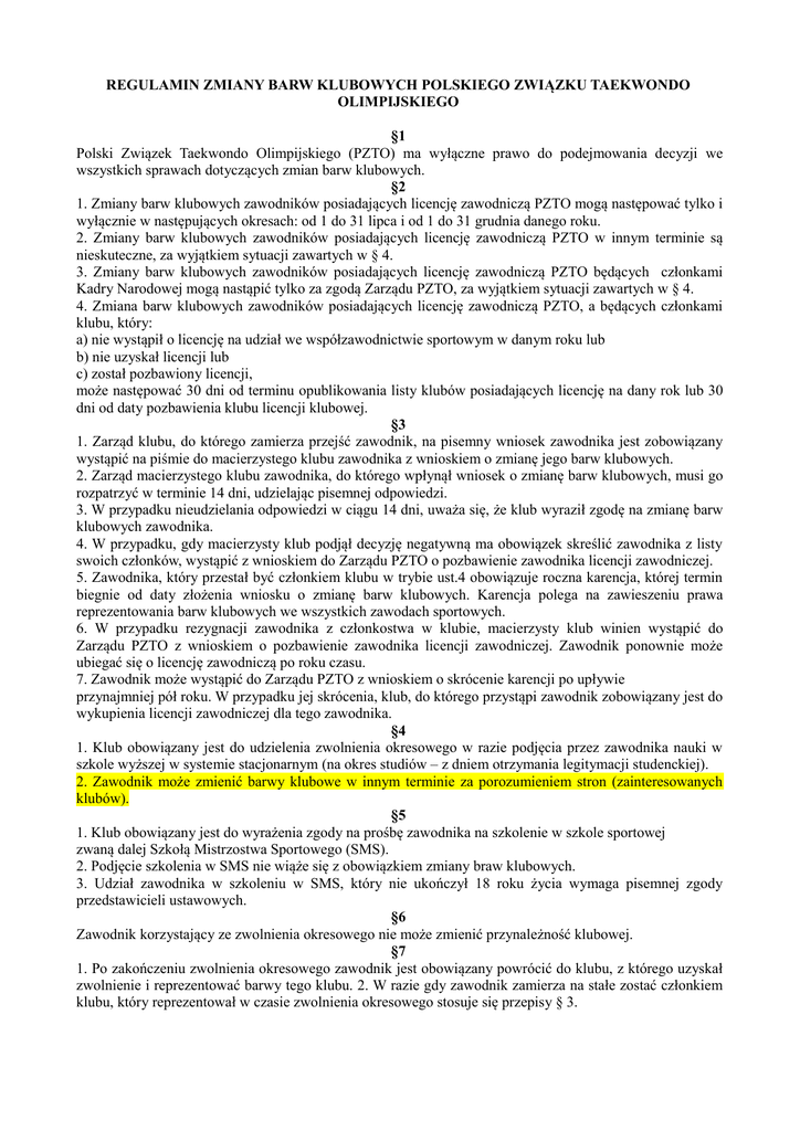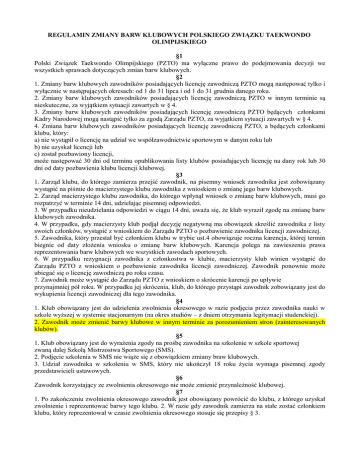 REGULAMIN ZMIANY BARW KLUBOWYCH POLSKIEGO ZWIĄZKU TAEKWONDO OLIMPIJSKIEGO §1 Polski Związek Taekwondo Olimpijskiego (PZTO) ma wyłączne prawo do podejmowania decyzji we wszystkich sprawach dotyczących zmian barw klubowych. §2 1. Zmiany barw klubowych zawodników posiadających licencję zawodniczą PZTO mogą następować tylko i wyłącznie w następujących okresach: od 1 do 31 lipca i od 1 do 31 grudnia danego roku. 2. Zmiany barw klubowych zawodników posiadających licencję zawodniczą PZTO w innym terminie są nieskuteczne, za wyjątkiem sytuacji zawartych w § 4. 3. Zmiany barw klubowych zawodników posiadających licencję zawodniczą PZTO będących członkami Kadry Narodowej mogą nastąpić tylko za zgodą Zarządu PZTO, za wyjątkiem sytuacji zawartych w § 4. 4. Zmiana barw klubowych zawodników posiadających licencję zawodniczą PZTO, a będących członkami klubu, który: a) nie wystąpił o licencję na udział we współzawodnictwie sportowym w danym roku lub b) nie uzyskał licencji lub c) został pozbawiony licencji, może następować 30 dni od terminu opublikowania listy klubów posiadających licencję na dany rok lub 30 dni od daty pozbawienia klubu licencji klubowej. §3 1. Zarząd klubu, do którego zamierza przejść zawodnik, na pisemny wniosek zawodnika jest zobowiązany wystąpić na piśmie do macierzystego klubu zawodnika z wnioskiem o zmianę jego barw klubowych. 2. Zarząd macierzystego klubu zawodnika, do którego wpłynął wniosek o zmianę barw klubowych, musi go rozpatrzyć w terminie 14 dni, udzielając pisemnej odpowiedzi. 3. W przypadku nieudzielania odpowiedzi w ciągu 14 dni, uważa się, że klub wyraził zgodę na zmianę barw klubowych zawodnika. 4. W przypadku, gdy macierzysty klub podjął decyzję negatywną ma obowiązek skreślić zawodnika z listy swoich członków, wystąpić z wnioskiem do Zarządu PZTO o pozbawienie zawodnika licencji zawodniczej. 5. Zawodnika, który przestał być członkiem klubu w trybie ust.4 obowiązuje roczna karencja, której termin biegnie od daty złożenia wniosku o zmianę barw klubowych. Karencja polega na zawieszeniu prawa reprezentowania barw klubowych we wszystkich zawodach sportowych. 6. W przypadku rezygnacji zawodnika z członkostwa w klubie, macierzysty klub winien wystąpić do Zarządu PZTO z wnioskiem o pozbawienie zawodnika licencji zawodniczej. Zawodnik ponownie może ubiegać się o licencję zawodniczą po roku czasu. 7. Zawodnik może wystąpić do Zarządu PZTO z wnioskiem o skrócenie karencji po upływie przynajmniej pół roku. W przypadku jej skrócenia, klub, do którego przystąpi zawodnik zobowiązany jest do wykupienia licencji zawodniczej dla tego zawodnika. §4 1. Klub obowiązany jest do udzielenia zwolnienia okresowego w razie podjęcia przez zawodnika nauki w szkole wyższej w systemie stacjonarnym (na okres studiów – z dniem otrzymania legitymacji studenckiej). 2. Zawodnik może zmienić barwy klubowe w innym terminie za porozumieniem stron (zainteresowanych klubów). §5 1. Klub obowiązany jest do wyrażenia zgody na prośbę zawodnika na szkolenie w szkole sportowej zwaną dalej Szkołą Mistrzostwa Sportowego (SMS). 2. Podjęcie szkolenia w SMS nie wiąże się z obowiązkiem zmiany braw klubowych. 3. Udział zawodnika w szkoleniu w SMS, który nie ukończył 18 roku życia wymaga pisemnej zgody przedstawicieli ustawowych. §6 Zawodnik korzystający ze zwolnienia okresowego nie może zmienić przynależność klubowej. §7 1. Po zakończeniu zwolnienia okresowego zawodnik jest obowiązany powrócić do klubu, z którego uzyskał zwolnienie i reprezentować barwy tego klubu. 2. W razie gdy zawodnik zamierza na stałe zostać członkiem klubu, który reprezentował w czasie zwolnienia okresowego stosuje się przepisy § 3. §8 Klub musi zwolnić zawodnika, gdy migrują przedstawiciele ustawowi zawodnika niepełnoletniego. §9 1. Klub z którego odchodzi zawodnik w wyniku zmiany przynależności klubowej może żądać od klubu, do którego zawodnik przechodzi ekwiwalentu za wyszkolenie zawodnika. 2. Ekwiwalent za wyszkolenia zawodnika może być ustalony w formie rzeczowej, finansowej, rzeczowofinansowej. 3. Wysokość ekwiwalentu za wyszkolenie zawodnika ustalają zainteresowane kluby w drodze pisemnego porozumienia. 4. Minimum transferu ustala się dla zawodników posiadających: a) klasę MM – 3 (trzy) średnie krajowe, b) klasę M – 2 (dwie) średnie krajowe, c) klasę I – 1 (jedna) średnia krajowa. W odniesieniu do średniej wynagrodzenia wg GUS w roku poprzedzającym. 5. Ekwiwalenty za wyszkolenie zawodnika nie mogą być wypłacone ze środków pochodzących ze środków budżetowych. §10 1. Wysokość ekwiwalentu za wyszkolenie zawodnika, który zmienił przynależność klubową po okresie karencji została ustalona wg posiadanej aktualnie klasy sportowej przez zawodnika w odniesieniu do średniej wynagrodzenia wg GUS w roku poprzednim: a) Klasa MM – 3 średnie krajowe, b) Klasa M – 2 średnie krajowe, c) Klasa I – 1 średnia krajowa. 2. Wysokość ekwiwalentu za wyszkolenie zawodnika, który po zwolnieniu okresowym zamierza pozostać na stałe w tym klubie ustala przedstawiciel Zarządu PZTO, przy uwzględnieniu opinii klubu, który wyszkolił zawodnika. §11 Ekwiwalent za wyszkolenie zawodnika nie przysługuje w razie zwolnienia okresowego §12 1.Klub, do którego przychodzi zawodnik, w wyniku zmiany przynależności klubowej obowiązany jest wpłacić na rzecz PZTO opłatę w wysokości 10% wartości umowy transferowej, ale nie mniej niż 10% minimalnej kwoty transferowej zgodnie z § 9 i §10. 2.Klub jest zwolniony z opłaty transferowej w sytuacji, gdy transfer zawodnika dokonywany jest bez pobierania ekwiwalentu za wyszkolenie. §13 1. Klub nie może wszcząć postępowania dyscyplinarnego w stosunku do zawodnika ani orzec wykonania zawieszonej uprzednio kary dyscyplinarnej po złożeniu wniosku o zmianę przynależności klubowej l