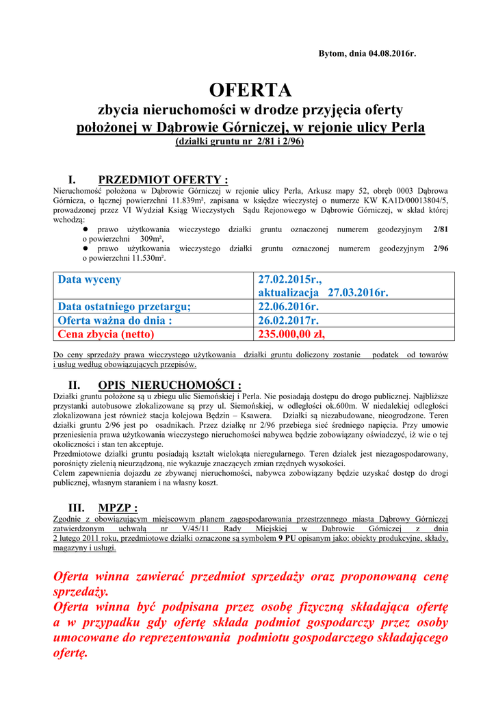 Bytom, dnia 04.08.2016r. OFERTA zbycia nieruchomości w drodze przyjęcia oferty położonej w Dąbrowie Górniczej, w rejonie ulicy Perla (działki gruntu nr 2/81 i 2/96) I. PRZEDMIOT OFERTY : Nieruchomość położona w Dąbrowie Górniczej w rejonie ulicy Perla, Arkusz mapy 52, obręb 0003 Dąbrowa Górnicza, o łącznej powierzchni 11.839m², zapisana w księdze wieczystej o numerze KW KA1D/00013804/5, prowadzonej przez VI Wydział Ksiąg Wieczystych Sądu Rejonowego w Dąbrowie Górniczej, w skład której wchodzą: prawo użytkowania wieczystego działki gruntu oznaczonej numerem geodezyjnym 2/81 o powierzchni 309m², prawo użytkowania wieczystego działki gruntu oznaczonej numerem geodezyjnym 2/96 o powierzchni 11.530m². Data wyceny Data ostatniego przetargu; Oferta ważna do dnia : Cena zbycia (netto) 27.02.2015r., aktualizacja 27.03.2016r. 22.06.2016r. 26.02.2017r. 235.000,00 zł, Do ceny sprzedaży prawa wieczystego użytkowania działki gruntu doliczony zostanie i usług według obowiązujących przepisów. II. podatek od towarów OPIS NIERUCHOMOŚCI : Działki gruntu położone są u zbiegu ulic Siemońskiej i Perla. Nie posiadają dostępu do drogo publicznej. Najbliższe przystanki autobusowe zlokalizowane są przy ul. Siemońskiej, w odległości ok.600m. W niedalekiej odległości zlokalizowana jest również stacja kolejowa Będzin – Ksawera. Działki są niezabudowane, nieogrodzone. Teren działki gruntu 2/96 jest po osadnikach. Przez działkę nr 2/96 przebiega sieć średniego napięcia. Przy umowie przeniesienia prawa użytkowania wieczystego nieruchomości nabywca będzie zobowiązany oświadczyć, iż wie o tej okoliczności i stan ten akceptuje. Przedmiotowe działki gruntu posiadają kształt wielokąta nieregularnego. Teren działek jest niezagospodarowany, porośnięty zielenią nieurządzoną, nie wykazuje znaczących zmian rzędnych wysokości. Celem zapewnienia dojazdu ze zbywanej nieruchomości, nabywca zobowiązany będzie uzyskać dostęp do drogi publicznej, własnym staraniem i na własny koszt. III. MPZP : Zgodnie z obowiązującym miejscowym planem zagospodarowania przestrzennego miasta Dąbrowy Górniczej zatwierdzonym uchwałą nr V/45/11 Rady Miejskiej w Dąbrowie Górniczej z dnia 2 lutego 2011 roku, przedmiotowe działki oznaczone są symbolem 9 PU opisanym jako: obiekty produkcyjne, składy, magazyny i usługi. Oferta winna zawierać przedmiot sprzedaży oraz proponowaną cenę sprzedaży. Oferta winna być podpisana przez osobę fizyczną składająca ofertę a w przypadku gdy ofertę składa podmiot gospodarczy przez osoby umocowane do reprezentowania podmiotu gospodarczego składającego ofertę. IV. Dokumenty niezbędne do złożenia oferty: 1/ oświadczenie o zapoznaniu się i akceptacji bez zastrzeżeń : o stanu prawnego i faktycznego, w tym technicznego przedmiotu sprzedaży, o postanowień “Regulaminu zbywania nieruchomości, kopalń, zakładów górniczych lub ich oznaczonych części przez Spółkę Restrukturyzacji Kopalń S.A.” o treści OFERTY zbycia nieruchomości w drodze przyjęcia oferty, położonej w Dąbrowie Górniczej przy ulicy Perla, dla działek gruntu nr 2/81 i 2/96. 2/ w przypadku gdy ofertę składa podmiot gospodarczy należy załączyć dodatkowo aktualny (z ostatnich 6-ciu miesięcy) wypis z rejestru handlowego albo aktualne (z ostatnich 6-ciu miesięcy) zaświadczenie o wpisie do ewidencji działalności gospodarczej oraz dokumenty, z których wynika umocowanie do reprezentowania podmiotu składającego ofertę, 3/ w przypadku gdy ofertę składa osoba fizyczna należy podać dokładny adres zamieszkania oferenta oraz ewentualnie załączyć umowę o rozdzielności majątkowej Dokumenty dołączone do oferty mogą być złożone w formie oryginałów lub kserokopii (kserokopie winy posiadać adnotację „za zgodność z oryginałem” podpisane przez osoby umocowane do reprezentowania podmiotu składającego ofertę) V. INFORMACJE DODATKOWE : Przedmiot oferty może być oglądany w dni robocze od poniedziałku do piątku w godzinach od 800–1400, po wcześniejszym ustaleniu terminu pod numerem telefonu (32) 289-32-60 wew. 103, 101. Dodatkowych informacji można uzyskać pod numerami telefonów: (32) 35-13-361, (32) 35-13-362, (32) 35 13 300 wew. 260 Oferent, którego oferta została wybrana jest zobowiązany do zapłaty całej ceny sprzedaży przed zawarciem umowy sprzedaży w formie aktu notarialnego, z uwzględnieniem postanowień § 17 ust. 2 i 3 oraz z zastrzeżeniem § 17 ust. 7 „Regulaminu zbywania nieruchomości, kopalń, zakładów górniczych lub ich oznaczonych części przez Spółkę Restrukturyzacji Kopalń S.A.”, przy czym co najmniej 30% ceny sprzedaży oferent zobowiązany jest uiścić w terminie do 14 dni licząc od dnia podjęcia przez Zarząd uchwały w sprawie przyjęcia oferty. Przepisu art. 394 § 1 Kodeksu Cywilnego nie stosuje się. W uzasadnionych przypadkach, na wniosek oferenta, którego oferta została wybrana Zarząd Spółki może wyrazić zgodę na zmianę terminu, o którym mowa powyżej. Powyższe postanowienia nie dotyczą przypadków gdy oferentem, którego oferta została wybrana jest jednostką samorządu terytorialnego lub oferent, który zaciąga kredyt bankowy z przeznaczeniem na zakup nieruchomości będącej przedmiotem oferty. W takim przypadku zastosowanie mają postanowienia “Regulaminu sprzedaży nieruchomości Spółki Restrukturyzacji Kopalń S.A.” ust. 8 – 13, z zastrzeżeniem ust. 11. Zbycie nieruchomości odbywa się na zasadach określonych w „Regulaminie zbywania nieruchomości, kopalń, zakładów górniczych lub ich oznaczonych części przez Spółkę Restrukturyzacji Kopalń S.A” W części nieuregulowanej w niniejszej ofercie obowiązują przepisy ujęte w “Regulaminie zbywania nieruchomości, kopalń, zakładów górniczych lub ich oznaczonych części przez Spółkę Restrukturyzacji Kopalń S.A.”, który jest do wglądu w si