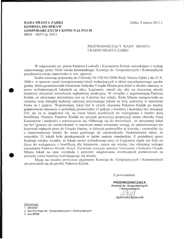 RADA MIASTA ZĄBKI KOMISJA DO SPRAW GOSPODARCZYCH I KOMUNALNYCH BRM- 0057/^6/2011 Ząbki, 4 marca 2011 r, PRZEWODNICZĄCY RADY MIASTA I RADNI MIASTA ZĄBKI W odpowiedzi na pisma Państwa Leokadii i Kazimierza Kielak wnioskujące o wykup zajmowanego przez Nich lokalu komunalnego, Komisja ds. Gospodarczych i Komunalnych przedstawia swoje stanowisko w ww. sprawie. Radni wnosząc poprawkę do Uchwały Nr YII/363/2006 Rady Miasta Ząbki z dn.25.X. 2006 r. w sprawie zasad wynajmowania lokali wchodzących w skład mieszkaniowego zasobu gminy, która gwarantowała lokatorom budynku Urzędu Miasta przydział w drodze zamiany w nowo wybudowanych lokalach na ulicy Legionów, starali się, aby na ówczesną chwilę lokatorzy otrzymali mieszkania najbardziej atrakcyjne. W związku z argumentacją Państwa Kielak, że otrzymane mieszkanie jest na 4 piętrze bez windy, Rada Miasta zasugerowała na ostatniej sesji ubiegłej kadencji zamianę przyznanego lokalu na inny położony w sąsiednim bloku na I piętrze. Wspomniany lokal był w chwili okazania Państwu Kielak po bardzo gruntownym remoncie o podobnej powierzchni (3 pokoje z kuchnią i łazienką) bez instalacji CO, ale za to znajdował się na liście lokali możliwych do wykupienia z bardzo dużą bonifikatą. Niestety Państwo Kielak nie przyjęli powyższej propozycji mimo choroby Pana Kazimierza i trudności z poruszaniem się. Odnosząc się do stwierdzeń , że otrzymany lokal nie był "gotowy do zamieszkania" w surowym stanie zwracamy uwagę, że zainteresowani nie kierowali żadnych pism do Urzędu Gminy, w których podnosiliby tę kwestię i zwracaliby się o doprowadzenie lokalu do stanu gotowego do zamieszkania. Nadmieniamy także, że wszystkie 12 lokali było przekazanych w takim samym standardzie. Z posiadanej przez Komisję wiedzy wynika, że lokale nowo wybudowane przy ul Legionów nigdy nie były na liście do wykupienia z bonifikatą dla lokatorów, zatem nie wiemy, kto obietnicę wykupu mieszkania Państwu Kielak złożył. Zaistniała sytuacja zamiany lokatorom z budynku Urzędu Miasta lokali na inne wynikała z potrzeby adaptowania zwolnionych pomieszczeń na potrzeby coraz bardziej rozwijającego się miasta. Mając na uwadze powyższe argumenty Komisja ds. Gospodarczych i Komunalnych nie przychyla się do prośby Państwa Kielak. Z poważaniem PRZEWODNICZĄCA Komisji ds. Gospodarczych i Komunalnych Otrzymują: 1. adresat 2. a/a Komisja ds. Gospodarczych i Komunalnych 3. a/a BRM