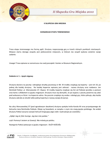 II SŁUPECKA GRA MIEJSKA SCENARIUSZ ETAPU TERENOWEGO Trasa etapu terenowego ma formę pętli. Drużyny rozpoczynają grę w trzech różnych punktach startowych. Miejsce startu danego zespołu jest jednocześnie miejscem, w którym ów zespół wykona ostatnie swoje zadanie. Uwaga! Trasa opisana w scenariuszu ma swój początek i koniec w Muzeum Regionalnym. Zadanie nr 1 – Język migowy Drużyna dociera na pocztę i odnajduje skrytkę pocztową nr 84. W środku znajdują się koperty – jest ich 19, po jednej dla każdej drużyny. Na każdej kopercie wpisany jest adresat - nazwa drużyny oraz nadawca: Jan Reinhold Patkul, ul. Warszawska 37, Słupca. W środku koperty znajduje się list od Patkula (prośba o pomoc) oraz karta z alfabetem w języku migowym. Drużyna musi się domyślid, że po wyjściu z poczty powinna się udad pod wskazany w liście i na kopercie adres. Na poczcie znajduje się osoba z obsługi gry, która pilnuje, aby każda drużyna zabrała ze skrytki tylko jedną kopertę (z nazwą swojej drużyny). Na ulicy Warszawskiej 37 (pod ogrodowym daszkiem) drużyna spotyka króla Karola XII oraz przywiązanego do łaocucha Jana Reinholda Patkula. Oboje są Szwedami, w związku z czym nie znają języka polskiego. Na widok drużyny Patkul zaczyna szarpad łaocuch krępujący jego ciało i wykrzykuje po szwedzku: „Hjälp! Jag är från Sverige. Jag kan inte polska.” czyli: Pomocy! Jestem ze Szwecji. Nie mówię po polsku. Następnie Patkul pokazuje w języku migowym: DUŻY KOŚCIÓŁ Drużyna musi się zorientowad, że w kopercie, którą otrzymała znajduje się alfabet w języku migowym, który pomoże rozszyfrowad słowa Patkula i wskaże dalszą drogę. Żeby nie przedłużad i nie wprowadzad zamieszania Patkul cały czas miga to samo, czyli DUŻY KOŚCIÓŁ. Nawet jeśli drużyna będzie mied na to ochotę, Patkul nie wdaje się w zbędne dyskusje w języku migowym. Król nie zna języka migowego, ale najwidoczniej chce się nauczyd polskiego. W związku z tym przegląda słownik polsko-szwedzki i od czasu do czasu wykrzykuje jakieś przekręcone polskie słowo. To co mówi nie ma znaczenia i nie jest żadną wskazówką. Jeżeli Patkul zauważy, że drużyna nie radzi sobie z językiem migowym, może im pomóc wyrywając królowi słownik, wertując go i wykrzykując dośd nieudolnie po polsku „duży kościół”. Drużyna musi się domyślid, że chodzi o kościół św. Wawrzyoca i tam należy się udad. Punkty: nie Zadanie nr 2 – Gotyk na dotyk Przy wejściu do kościoła św. Wawrzyoca od strony ul. Warszawskiej drużyna spotyka mnicha, który wręcza im kartę zadania. Na karcie wymienionych jest pięd elementów architektonicznych charakterystycznych dla budownictwa gotyckiego (m.in. przypory, witraże, ostrołukowe okna). Zadaniem drużyny jest uważne przyjrzenie się kościołowi z zewnątrz, znalezienie przykładów wymienionych elementów oraz sfotografowanie ich (jeden element = jedno zdjęcie). Mnich pilnuje, aby drużyna nie wchodziła do wnętrza kościoła. Po wykonaniu zadania drużyna wraca do mnicha, który sprawdza fotografie i przyznaje punkty. Mnich wskazuje drużynie dalszą drogę mówiąc: „udajcie się do kancelarii parafialnej”. Punkty: tak (po 2 punkty za każdy element) Zadanie nr 3 – Święty Wawrzyniec W kancelarii parafialnej na drużynę czeka ksiądz. Zadaniem drużyny jest udzielenie odpowiedzi na dwa pytania dotyczące historii św. Wawrzyoca. Z zadaniem bez trudu poradzą sobie Ci, którzy uważnie słuchali Radia Planeta (od poniedziałku do czwartku na antenie Radia Planeta, specjalnie dla uczestników II SGM czytana była biografia św. Wawrzyoca). Po udzieleniu odpowiedzi, ksiądz przyznaje punkty. Następnie ksiądz podaje drużynie Biblię i mówi: „udajcie się do miejsca wspomnianego w Biblii w wersecie Łk 4,15”. Drużyna nie zabiera Biblii ze sobą, lecz szuka wersetu na miejscu. W wersecie wspomniana jest synagoga – z mapy otrzymanej na starcie drużyna z łatwością odczyta jej położenie. Punkty: tak (po 5 punktów za pytanie) Zadanie nr 4 – Zmartwiony Żyd W pobliżu synagogi przy skrzyżowaniu drużyna spotyka grupę Żydów. Jeden z nich głośno lamentuje, bowiem zgubił monetę. Moneta wpadła do piasku i nie można jej odnaleźd. Żyd błaga o pomoc, a następnie wręcza przybyłym wykrywacz metali i tłumaczy zasady jego obsługi. Drużyny przy pomocy wykrywacza metali musi odnaleźd monetę i wyjąd ją z piasku. Po odzyskaniu monety Żyd nie ukrywa swojej radości i postanawia się odwdzięczyd. Drużyna otrzymuje od niego woreczek, w którym znajdują się cukierki oraz mała karteczka z instrukcją: „idźcie na ulicę sukienniczą”. Punkty: nie Zadanie nr 5 – Rzemieślnicy i ich wyroby Przy ulicy Sukienniczej na drużynę czeka sukiennik oraz zadanie, które dla nich przygotował. Sukiennik pokazuje dziesięd przedmiotów wytworzonych przez różnych rzemieślników (m.in. dzwon, pistolet, kafel, uzdę) oraz wręcza drużynie dziesięd kart z nazwami rzemieślników (m.in. płatnerz, ludwisarz, rymarz, rusznikarz, snycerz). Zadaniem drużyny jest przyporządkowanie do każdego przedmiotu nazwy rzemieślnika. Po wykonaniu zadania sukiennik przyznaje drużynie punkty oraz w nagrodę wręcza metalowy krążek. Sukiennik opowiada o mincerzu, którego spotkad można na rynku. Ów mincerz jeśli się ładnie go o to poprosi, pozwoli drużynie wybid z otrzymanego kawałka metalu monetę. Punkty: tak (po 1 punkcie za każdą parę) Zadanie nr 6 - Mincerz Drużyna dociera do mincerza, który znajduje się na rynku. Mincerz pozwala im samodzielnie wybid monetę z przyniesionego kawałka metalu. Nie ma jednak dobrych wiadomości – monetę szybko stracą, bowiem przebywanie w mieście wymaga uiszczenia opłaty w komorze celnej. Mincerz prosi drużynę, aby udała się w to miejsce (z mapy, którą każda drużyna otrzyma na starcie łatwo odczytad, że dawny urząd celny to obecne Staros
