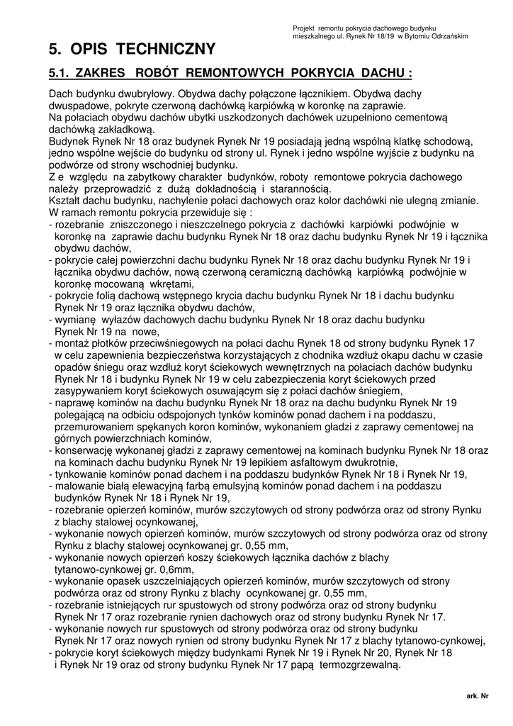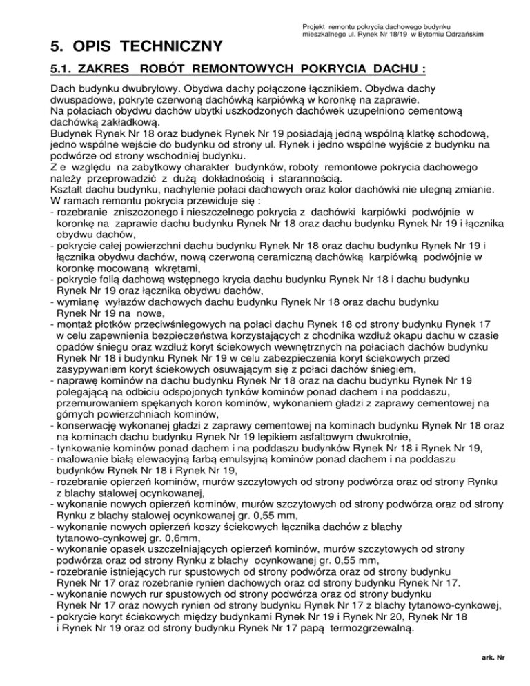 5. OPIS TECHNICZNY Projekt remontu pokrycia dachowego budynku mieszkalnego ul. Rynek Nr 18/19 w Bytomiu Odrzańskim 5.1. ZAKRES ROBÓT REMONTOWYCH POKRYCIA DACHU : Dach budynku dwubryłowy. Obydwa dachy połączone łącznikiem. Obydwa dachy dwuspadowe, pokryte czerwoną dachówką karpiówką w koronkę na zaprawie. Na połaciach obydwu dachów ubytki uszkodzonych dachówek uzupełniono cementową dachówką zakładkową. Budynek Rynek Nr 18 oraz budynek Rynek Nr 19 posiadają jedną wspólną klatkę schodową, jedno wspólne wejście do budynku od strony ul. Rynek i jedno wspólne wyjście z budynku na podwórze od strony wschodniej budynku. Z e względu na zabytkowy charakter budynków, roboty remontowe pokrycia dachowego należy przeprowadzić z dużą dokładnością i starannością. Kształt dachu budynku, nachylenie połaci dachowych oraz kolor dachówki nie ulegną zmianie. W ramach remontu pokrycia przewiduje się : - rozebranie zniszczonego i nieszczelnego pokrycia z dachówki karpiówki podwójnie w koronkę na zaprawie dachu budynku Rynek Nr 18 oraz dachu budynku Rynek Nr 19 i łącznika obydwu dachów, - pokrycie całej powierzchni dachu budynku Rynek Nr 18 oraz dachu budynku Rynek Nr 19 i łącznika obydwu dachów, nową czerwoną ceramiczną dachówką karpiówką podwójnie w koronkę mocowaną wkrętami, - pokrycie folią dachową wstępnego krycia dachu budynku Rynek Nr 18 i dachu budynku Rynek Nr 19 oraz łącznika obydwu dachów, - wymianę wyłazów dachowych dachu budynku Rynek Nr 18 oraz dachu budynku Rynek Nr 19 na nowe, - montaż płotków przeciwśniegowych na połaci dachu Rynek 18 od strony budynku Rynek 17 w celu zapewnienia bezpieczeństwa korzystających z chodnika wzdłuż okapu dachu w czasie opadów śniegu oraz wzdłuż koryt ściekowych wewnętrznych na połaciach dachów budynku Rynek Nr 18 i budynku Rynek Nr 19 w celu zabezpieczenia koryt ściekowych przed zasypywaniem koryt ściekowych osuwającym się z połaci dachów śniegiem, - naprawę kominów na dachu budynku Rynek Nr 18 oraz na dachu budynku Rynek Nr 19 polegającą na odbiciu odspojonych tynków kominów ponad dachem i na poddaszu, przemurowaniem spękanych koron kominów, wykonaniem gładzi z zaprawy cementowej na górnych powierzchniach kominów, - konserwację wykonanej gładzi z zaprawy cementowej na kominach budynku Rynek Nr 18 oraz na kominach dachu budynku Rynek Nr 19 lepikiem asfaltowym dwukrotnie, - tynkowanie kominów ponad dachem i na poddaszu budynków Rynek Nr 18 i Rynek Nr 19, - malowanie białą elewacyjną farbą emulsyjną kominów ponad dachem i na poddaszu budynków Rynek Nr 18 i Rynek Nr 19, - rozebranie opierzeń kominów, murów szczytowych od strony podwórza oraz od strony Rynku z blachy stalowej ocynkowanej, - wykonanie nowych opierzeń kominów, murów szczytowych od strony podwórza oraz od strony Rynku z blachy stalowej ocynkowanej gr. 0,55 mm, - wykonanie nowych opierzeń koszy ściekowych łącznika dachów z blachy tytanowo-cynkowej gr. 0,6mm, - wykonanie opasek uszczelniających opierzeń kominów, murów szczytowych od strony podwórza oraz od strony Rynku z blachy ocynkowanej gr. 0,55 mm, - rozebranie istniejących rur spustowych od strony podwórza oraz od strony budynku Rynek Nr 17 oraz rozebranie rynien dachowych oraz od strony budynku Rynek Nr 17. - wykonanie nowych rur spustowych od strony podwórza oraz od strony budynku Rynek Nr 17 oraz nowych rynien od strony budynku Rynek Nr 17 z blachy tytanowo-cynkowej, - pokrycie koryt ściekowych między budynkami Rynek Nr 19 i Rynek Nr 20, Rynek Nr 18 i Rynek Nr 19 oraz od strony budynku Rynek Nr 17 papą termozgrzewalną. ark. Nr 2 5.2. ZAKRES REMONTU ELEMENTÓW DACHU 5.2.1. Remont kominów ponad dachem : - odbić tynki kominów ponad dachem i na poddaszu budynku Rynek Nr 18 i Rynek Nr 19, - wykonać nowe tynki kominów ponad dachem i na poddaszu budynku Rynek Nr 18 i budynku Rynek Nr 19 z zaprawy cem.- wap. kat. II, - przemurować uszkodzone korony kominów ponad dachem budynku Rynek Nr 18 i Rynek Nr 19, - tynki kominów ponad dachem i na poddaszu budynków Rynek Nr 18 i Rynek Nr 19 pomalować dwukrotnie białą elewacyjną farbą emulsyjną, - wykonać gładzie z zaprawy cementowej na górnych powierzchniach kominów budynków Rynek Nr 18 i Rynek Nr 19, - zakonserwować wykonane gładzie na kominach budynku Rynek Nr 18 oraz budynku Rynek Nr 19 lepikiem asfaltowym dwukrotnie, 5.2.2. Remont opierzeń kominów i elementów dachu : - wykonać nowe opierzenia kominów, murów szczytowych od strony podwórza oraz od strony Rynku budynku Rynek Nr 18 oraz budynku Rynek Nr 19 z blachy stalowej ocynkowanej gr. 0,55 mm, - wykonać nowe opierzenia koszy ściekowych łącznika dachów z blachy tytanowo-cynkowej gr. 0,6mm - wykonać nowe opaski uszczelniające opierzeń kominów, murów szczytowych od strony podwórza oraz od strony Rynku budynku Rynek Nr 18 oraz budynku Rynek Nr 19 z blachy ocynkowanej gr. 0,55 mm, - opierzenia i opaski uszczelniające mocować kołkami, - wszystkie widoczne elementy opierzeń z blachy ocynkowanej zakonserwować dwukrotnie lepikiem na zimno dwukrotnie. 5.2.3. R e m o n t p o k r y c i a d a c h u : a/ Roboty rozbiórkowe : - rozebrać zniszczone i nieszczelne pokrycie z dachówki karpiówki podwójnie w koronkę na zaprawie dachu budynku Rynek Nr 18 oraz dachu budynku Rynek Nr 19 i łącznika dachów, - wykuć istniejące haki i maszty anten na połaciach dachów, - rozebrać łacenie dachu budynku Rynek Nr 18 oraz dachu budynku Rynek Nr 19 i łącznika obydwu dachów, - zdemontować istniejące wyłazy dachowe na połaciach dachów, - zdemontować pozostałe opierzenia i obróbki z blachy ocynkowanej, b/ Remont pokrycia dachowego z dachówki : - wyrównać powierzchnię połaci dachu budynku Rynek Nr 18 oraz dachu budynku Rynek Nr 19 i łącznika obydwu dachów poprzez nadbicie na krokwie łat drewnianych, - wykonać łacenie powierzchni dachu budynku Rynek Nr 18 oraz dachu budynku 