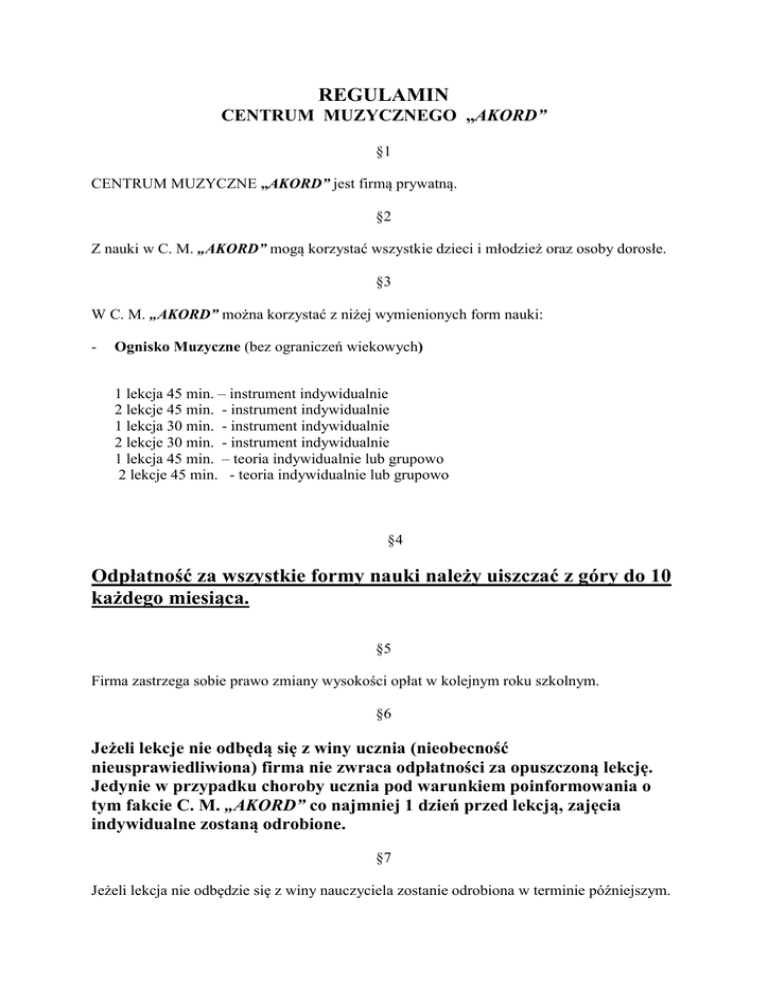 REGULAMIN CENTRUM MUZYCZNEGO „AKORD” §1 CENTRUM MUZYCZNE „AKORD” jest firmą prywatną. §2 Z nauki w C. M. „AKORD” mogą korzystać wszystkie dzieci i młodzież oraz osoby dorosłe. §3 W C. M. „AKORD” można korzystać z niżej wymienionych form nauki: - Ognisko Muzyczne (bez ograniczeń wiekowych) 1 lekcja 45 min. – instrument indywidualnie 2 lekcje 45 min. - instrument indywidualnie 1 lekcja 30 min. - instrument indywidualnie 2 lekcje 30 min. - instrument indywidualnie 1 lekcja 45 min. – teoria indywidualnie lub grupowo 2 lekcje 45 min. - teoria indywidualnie lub grupowo §4 Odpłatność za wszystkie formy nauki należy uiszczać z góry do 10 każdego miesiąca. §5 Firma zastrzega sobie prawo zmiany wysokości opłat w kolejnym roku szkolnym. §6 Jeżeli lekcje nie odbędą się z winy ucznia (nieobecność nieusprawiedliwiona) firma nie zwraca odpłatności za opuszczoną lekcję. Jedynie w przypadku choroby ucznia pod warunkiem poinformowania o tym fakcie C. M. „AKORD” co najmniej 1 dzień przed lekcją, zajęcia indywidualne zostaną odrobione. §7 Jeżeli lekcja nie odbędzie się z winy nauczyciela zostanie odrobiona w terminie późniejszym. §8 C. M. „AKORD” odpowiada za bezpieczeństwo ucznia TYLKO PODCZAS TRWANIA ZAJĘĆ. Za bezpieczeństwo ucznia w drodze do i ze szkoły odpowiadają Rodzice. §9 Wszelkie sprawy związane z w/w Regulaminem oraz oświatą muzyczną należy kontaktować się z Dyrektorem Centrum Muzycznego „AKORD”.