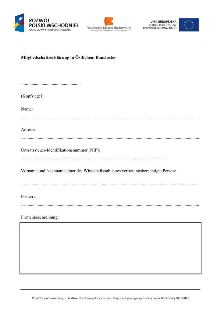Mitgliedschaftserklärung in Östlichem Baucluster ….................................................. (Kopfsiegel) Name: …............................................................................................................................................................ Adresse: …............................................................................................................................................................ Umsatzsteuer-Identifikationsnummer (NIP): ….............................................................................................................................. Vorname und Nachname einer des Wirtschaftssubjektes vertretungsberechtigte Person: …............................................................................................................................................................. Posten : …............................................................................................................................................................ Firmenbeschreibung: Projekt współfinansowany ze środków Unii Europejskiej w ramach Programu Operacyjnego Rozwój Polski Wschodniej 2007-2013 Hiermit bescheinige ich, dass ich die Teilnahmeabsicht in Östlichem Baucluster erkläre. Gleichzeitig erkläre ich, dass ich: Bestimmungen der Mitgliedschaftsordnung in Östlichem Baucluster Bestimmungen des Ethikgesetzbuches Östliches Bauclusters zur Kenntnis genommen habe und akzeptiere. …................................................... …........................................................................... (Ort und Datum) (Unterschrift der Vertretungsberechtigten) Projekt współfinansowany ze środków Unii Europejskiej w ramach Programu Operacyjnego Rozwój Polski Wschodniej 2007-2013