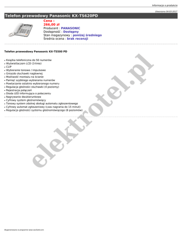 Informacje o produkcie Utworzono 04-03-2017 Telefon przewodowy Panasonic KX-TS620PD Cena : 266,00 zł Producent : PANASONIC Dostępność : Dostępny Stan magazynowy : poniżej średniego Średnia ocena : brak recenzji ● ● ● ● ● ● ● ● ● ● ● ● ● el ek ● Książka telefoniczna do 50 numerów Wyświetlaczem LCD (3-linie) CLIP Wybieranie tonowe / impulsowe Gniazdo słuchawki nagłownej Możliwość montażu na ścianie Pamięć szybkiego wybierania numerów Powtarzanie ostatnio wybieranego numeru Regulacja głośności słuchawki (4 poziomy) Rejestracja połączeń Dioda LED informująca o połaczeniu Nagrywanie dwukierunkowe Cyfrowy system głośnomówiący Tonowy system zdalnej obsługi automatu zgłoszeniowego Cyfrowy automat zgłoszeniowy (czas nagrania do 15 minut) Regulacja głośności systemu głośnomówiącego (8 poziomów) te ● tr o ● l.p l Telefon przewodowy Panasonic KX-TS500 PD Wygenerowano w programie www.oscGold.com