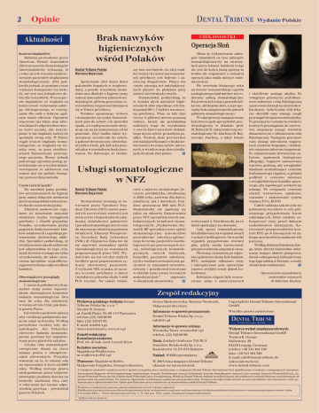 2 Opinie Aktualności Kariera implantów Badania prowadzone przez American Dental Association (Stowarzyszenie Stomatologów Amerykańskich) wykazują, iż z roku na rok wzrasta zainteresowanie pacjentów implantami stomatologicznymi. ADA podkreśla jednak, że pomimo coraz większej dostępności tej metody, nie jest ona jednakowo dobra dla wszystkich. Wszczepienie implantów, ze względu na konieczność wykonania zabiegu chirurgicznego, to rozwiązanie dla osób o dobrym ogólnym stanie zdrowia. Ogromne znaczenie ma także stan zdrowia dziąseł i odpowiednio mocne kości szczęki, aby wszczepione w nie implanty należycie spełniały swoją rolę. W Polsce ciągle jeszcze implanty stomatologiczne, ze względu na wysoką cenę, są poza możliwościami finansowymi przeciętnego pacjenta. Biorąc jednak pod uwagę ogromny postęp, jaki dokonuje się w tej dziedzinie, rozwiązanie to niebawem ma szanse stać się ogólnie dostępną i powszechną metodą. Czym czyścić język? Do szerokiej gamy produktów przeznaczonych do higieny jamy ustnej dołączyła niedawno pierwsza na polskim rynku szczoteczka do czyszczenia języka. Zdaniem naukowców regularne jej stosowanie znacznie zmniejsza ryzyko wystąpienia próchnicy i chorób przyzębia. Ponadto, szczotkowanie języka poprawia funkcjonowanie kubków smakowych i zapobiega powstawaniu nieświeżego oddechu. Specjaliści podkreślają, że zwykła szczoteczka do zębów nie jest odpowiednia do tego celu. Język bowiem wymaga nie tylko szczotkowania, ale także czyszczenia specjalnie wyprofilowaną powierzchnią oodpowiednim kształcie. Obowiązkowe przeglądy stomatologiczne U naszych południowych sąsiadów mają zostać wprowadzone obowiązkowe kontrolne badania stomatologiczne dwa razy do roku dla młodzieży w wieku od 5 do 15 lat, jak donosi gazeta Pravo. Już wkrótce posłowie niższej izby czeskiego parlamentu mają się zająć tą kwestią. Według prezydenta czeskiej izby stomatologów, Jiri Pekareka, okresowe badania stomatologiczne powinny być organizowane przez placówki szkolne. Czeska izba stomatologów energicznie działa na rzecz zmiany prawa o ubezpieczeniach zdrowotnych. Wszystko wskazuje na to, że zmiany uda się wprowadzić w życie od 2005 roku. Według nowego prawa niedopełnienie przez rodziców obowiązku posłania dziecka na kontrolę uzębienia dwa razy w roku może być karane odpowiednią grzywną – powiedział gazecie Pekarek. Brak nawyków higienicznych wśród Polaków Dental Tribune Polska Marzena Bojarczuk Spożywanie zbyt dużej ilości pokarmów bogatych w węglowodany, a przede wszystkim niedostateczna dbałość o higienę jamy ustnej i stan zębów to zdaniem stomatologów, główna przyczyna coraz bardziej rozpowszechniającej się w Polsce próchnicy. Pomimo ogromnego wyboru i dostępności na rynku różnorodnych past do zębów, ich sprzedaż spada, a w najlepszym razie utrzymuje się na niezmienionym od lat poziomie. Zbyt rzadko także wymieniamy szczoteczki do zębów, a gabinet dentystyczny odwiedzamy tylko wtedy, gdy ból zęba przeszkadza w normalnym funkcjonowaniu. Nic dziwnego, że chodzi- my tam niechętnie, bo zbyt rzadkie wizyty i leczenie zaawansowanej próchnicy jest bolesne i zazwyczaj długotrwałe. Polacy nie często używają też antybakteryjnych płynów do płukania jamy ustnej i nici dentystycznych. Stomatolodzy podkreślają, że w wyniku złych nawyków higienicznych albo zupełnego ich braku ponad 90% 7-latków ma znaczną próchnicę. Winę za taki stan rzeczy w głównej mierze ponoszą rodzice, którzy nie przykładają należytej wagi do wyrabiania u swych dzieci nawyków dokładnego mycia zębów po każdym posiłku. Niestety, dość powszechne jest nadal przekonanie o braku konieczności leczenia zębów mlecznych, wwyniku czego dzieci trafiają do dentysty zbyt późno. CIEKAWOSTKI Operacja Słoń Mimo że wykonywanie zabiegów lekarskich (w tym zabiegów stomatologicznych) na zwierzętach przez lekarzy ludzkich wciąż nie jest do końca jasną sprawą to trudno nie wspomnieć o ciekawej operacji jaka miała miejsce ostatniej jesieni. We wrześniu bieżącego roku na terenie warszawskiego ogrodu zoologicznego miał miejsce niecodzienny zabieg stomatologiczny. Pacjentem był ważący przeszło kilka ton, afrykański słoń, a jego specjalny boks adaptowano do potrzeb gabinetu stomatologicznego. W całą operację zaangażowane były dwa zespoły specjalistów, anestezjologiczny w składzie: prof. M. Ryba i dr M. Jakuciński oraz stomatologiczny: M. Aluchna i B. Bujnowska Aluchna, a także lekarz Usługi stomatologiczne w NFZ Dental Tribune Polska Marzena Bojarczuk Stomatolodzy uważają, że zawieranie przez Narodowy Fundusz Zdrowia (NFZ) umów poniżej ich rzeczywistej wartości jest nieuczciwe i doprowadzi do załamania działalności gabinetów i poradni stomatologicznych oraz do znacznego obniżenia poziomu świadczeń. Zdaniem Wiceprezesa Naczelnej Rady Lekarskiej (NRL) dr Zbigniewa Żaka nie da się zapewnić normalnej opieki stomatologicznej na warunkach proponowanych przez NFZ. Wydzielenie na ten cel zbyt małych środków grozi pogorszeniem sytuacji zdrowotnej pacjentów. Z wyliczeń NRL wynika, że na samo leczenie próchnicy u dzieci i młodzieży potrzeba około 1 mld PLN rocznie. Na całość świad- czeń z zakresu stomatologii (leczenie, profilaktyka, ortodoncja) w 2004 roku, zarówno dla dzieci, młodzieży, jak i dorosłych, Fundusz przeznacza 966 mln PLN. Stomatolodzy nie zgadzają się także na odmowę finansowania przez NFZ specjalistycznych ambulatoryjnych świadczeń stomatologicznych. „Pozbawienie obywateli RP specjalistycznej opieki stomatologicznej uniemożliwi prowadzenie interdyscyplinarnego leczenia pacjentów kardiologicznych (po przeszczepach serca), nefrologicznych, hematologicznych, ostrych białaczek, hemofilii, pacjentów młodocianych z wadami rozwojowymi, pacjentów ze zmianami nowotworowymi i przednowotworowymi w obrębie