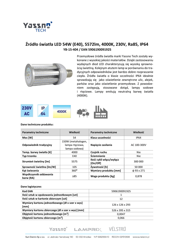 Źródło światła LED 54W (E40), 5572lm, 4000K, 230V, Ra85, IP64 YB-15-404 / EAN 5906190091925 Przemysłowe źródła światła marki Yassno Tech zostały wykonane z wysokiej jakości materiałów. Dzięki zastosowaniu wydajnych diod LED charakteryzują się wysoką sprawnością świetlną. Kolejnym atutem lamp w porównaniu do tradycyjnych odpowiedników jest bardzo dobre rozpraszanie ciepła. Źródła światła o klasie szczelności IP64 idealnie sprawdzają się jako oświetlenie zewnętrzne ulic, alejek, parków oraz jako oświetlenie przemysłowe. Z powodzeniem zastępują, stosowane dotąd, lampy sodowe i rtęciowe. Lampy emitują neutralną barwę światła (4000K). Dane techniczne produktu: Parametry techniczne Moc [W] Odpowiednik tradycyjny Temp. barwy światła [K] Typ trzonka Wielkość 54 150W (metahalogen, lampa rtęciowa, lampa sodowa) 4000 E40 Parametry techniczne Klasa szczelności IP64 Napięcie zasilania AC 100-300V Strumień świetlny [lm] 5575 Sprawność świetlna [lm/W] Kąt świecenia Współczynnik oddawania barw (RA) 105 360ᴼ Czujnik ruchu Ściemnianie Ilość cykli włącz/wyłącz [On/Off] Żywotność [h] Wymiary produktu [mm] ≥85 Waga produktu [kg] Dane logistyczne: Kod EAN Ilość sztuk w opakowaniu jednostkowym [szt] Ilość sztuk w kartonie zbiorczym [szt] Wymiary kartonu jednostkowego [dł x szer x wys] [mm] Wymiary kartonu zbiorczego [dł x szer x wys] [mm] Objętość kartonu jednostkowego [m3] Objętość kartonu zbiorczego [m3] Wielkość 5906190091925 1 12 126 x 126 x 293 526 x 395 x 315 0,0047 0,066 Nie Nie 300 000 50 000 φ 93 x 271 0,878 Krzywa rozsyłu światła: Etykieta energetyczna: Rysunek techniczny: