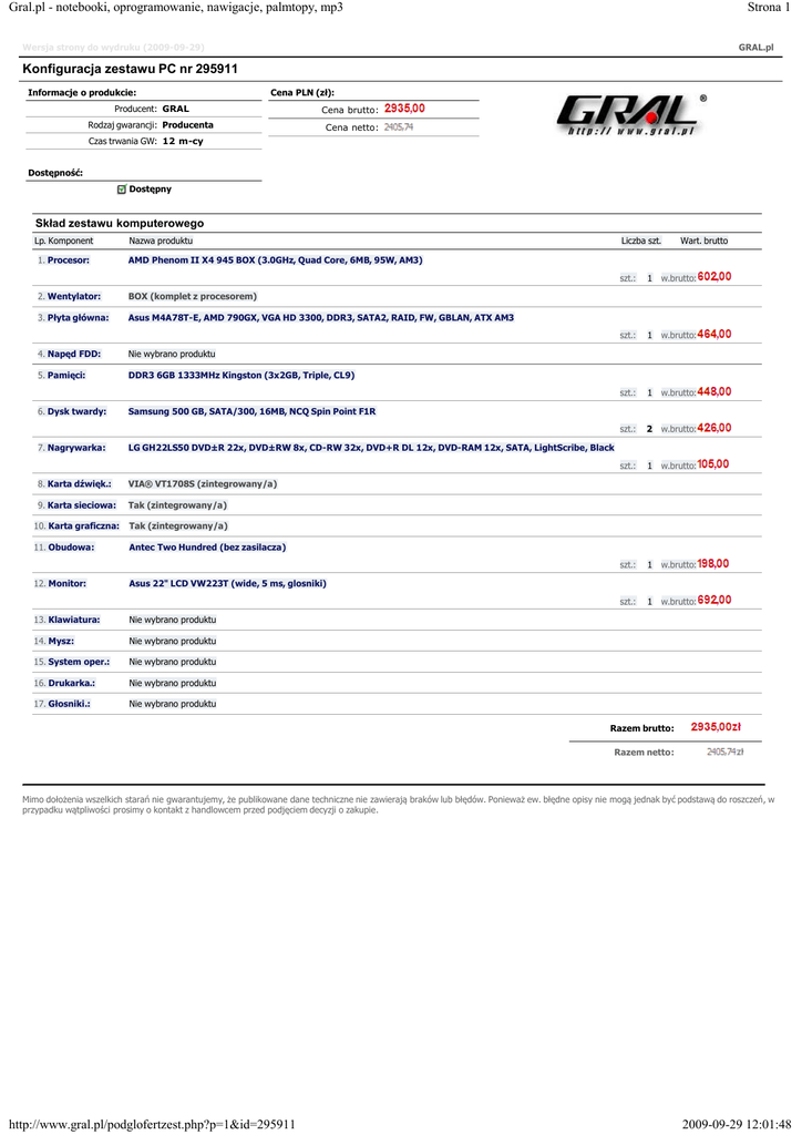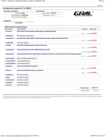 Gral.pl - notebooki, oprogramowanie, nawigacje, palmtopy, mp3 Strona 1 Wersja strony do wydruku (2009-09-29) GRAL.pl Konfiguracja zestawu PC nr 295911 Informacje o produkcie: Cena PLN (zł): Producent: GRAL Cena brutto: Rodzaj gwarancji: Producenta Cena netto: Czas trwania GW: 12 m-cy Dostępność: Dostępny Skład zestawu komputerowego Lp. Komponent Nazwa produktu 1. Procesor: AMD Phenom II X4 945 BOX (3.0GHz, Quad Core, 6MB, 95W, AM3) 2. Wentylator: BOX (komplet z procesorem) 3. Płyta główna: Asus M4A78T-E, AMD 790GX, VGA HD 3300, DDR3, SATA2, RAID, FW, GBLAN, ATX AM3 Liczba szt. 4. Napęd FDD: Nie wybrano produktu 5. Pamięci: DDR3 6GB 1333MHz Kingston (3x2GB, Triple, CL9) 6. Dysk twardy: Samsung 500 GB, SATA/300, 16MB, NCQ Spin Point F1R 7. Nagrywarka: LG GH22LS50 DVD±R 22x, DVD±RW 8x, CD-RW 32x, DVD+R DL 12x, DVD-RAM 12x, SATA, LightScribe, Black 8. Karta dźwięk.: VIA® VT1708S (zintegrowany/a) 9. Karta sieciowa: Tak (zintegrowany/a) 10. Karta graficzna: Tak (zintegrowany/a) 11. Obudowa: Antec Two Hundred (bez zasilacza) 12. Monitor: Asus 22" LCD VW223T (wide, 5 ms, glosniki) 13. Klawiatura: Nie wybrano produktu 14. Mysz: Nie wybrano produktu 15. System oper.: Nie wybrano produktu 16. Drukarka.: Nie wybrano produktu 17. Głosniki.: Nie wybrano produktu Wart. brutto szt.: 1 w.brutto: szt.: 1 w.brutto: szt.: 1 w.brutto: szt.: 2 w.brutto: szt.: 1 w.brutto: szt.: 1 w.brutto: szt.: 1 w.brutto: Razem brutto: Razem netto: Mimo dołożenia wszelkich starań nie gwarantujemy, że publikowane dane techniczne nie zawierają braków lub błędów. Ponieważ ew. błędne opisy nie mogą jednak być podstawą do roszczeń, w przypadku wątpliwości prosimy o kontakt z handlowcem przed podjęciem decyzji o zakupie. http://www.gral.pl/podglofertzest.php?p=1&id=295911 2009-09-29 12:01:48