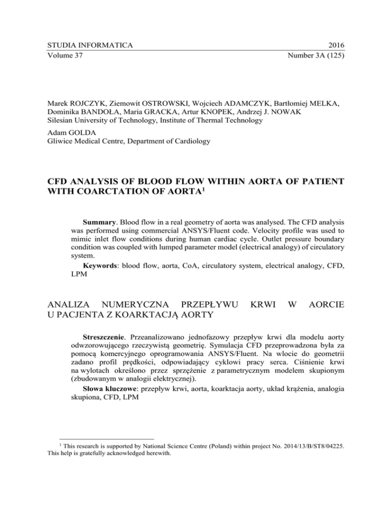 STUDIA INFORMATICA Volume 37 2016 Number 3A (125) Marek ROJCZYK, Ziemowit OSTROWSKI, Wojciech ADAMCZYK, Bartłomiej MELKA, Dominika BANDOŁA, Maria GRACKA, Artur KNOPEK, Andrzej J. NOWAK Silesian University of Technology, Institute of Thermal Technology Adam GOLDA Gliwice Medical Centre, Department of Cardiology CFD ANALYSIS OF BLOOD FLOW WITHIN AORTA OF PATIENT WITH COARCTATION OF AORTA1 Summary. Blood flow in a real geometry of aorta was analysed. The CFD analysis was performed using commercial ANSYS/Fluent code. Velocity profile was used to mimic inlet flow conditions during human cardiac cycle. Outlet pressure boundary condition was coupled with lumped parameter model (electrical analogy) of circulatory system. Keywords: blood flow, aorta, CoA, circulatory system, electrical analogy, CFD, LPM ANALIZA NUMERYCZNA PRZEPŁYWU U PACJENTA Z KOARKTACJĄ AORTY KRWI W AORCIE Streszczenie. Przeanalizowano jednofazowy przepływ krwi dla modelu aorty odwzorowującego rzeczywistą geometrię. Symulacja CFD przeprowadzona była za pomocą komercyjnego oprogramowania ANSYS/Fluent. Na wlocie do geometrii zadano profil prędkości, odpowiadający cyklowi pracy serca. Ciśnienie krwi na wylotach określono przez sprzężenie z parametrycznym modelem skupionym (zbudowanym w analogii elektrycznej). Słowa kluczowe: przepływ krwi, aorta, koarktacja aorty, układ krążenia, analogia skupiona, CFD, LPM 1 This research is supported by National Science Centre (Poland) within project No. 2014/13/B/ST8/04225. This help is gratefully acknowledged herewith. 44 M. Rojczyk et al. 1. Introduction CFD (Computational Fluid Dynamics) is branch of fluid mechanics that uses numerical analysis and algorithms to solve and analyze problems that involve fluid flows. As such, it is a technique that is widely used in many areas for design and analysis - in wide range of engineering problems and for (bio)medical devices design as well. It is a primary method to perform easy and low-cost verification of assumptions that allows to avoid high costs of laboratory tests. CFD is also very promising tool for minimally-invasive patient assessment [1], where a lot of problems could not be validated against measurements due to ethical aspect. In addition, it should be stressed that CFD model, similarly to other numerical models, can be used as a direct problem solver within inverse analysis. Such analysis is used when direct measurements are not available, e.g. for tumor recognition in a different localizations in a human body [2-5]. CFD technics can also support pre-surgery activities, for better problem understanding helping to choose better treatment [6]. In area of biomedical applications of CFD, a cardiovascular medicine is a field, where usage of CFD can significantly enhance diagnosis, device design and clinical trials. The recent review of possible applications of CFD modelling in cardiovascular medicine is in [1]. Numerical analysis can also help with understanding atherogenesis problem with unexplainable before creation hard and soft atherosclerotic plaque in the specific places [7]. Unfortunately, except of many advantages, the CFD methods are still not ready for clinical use. This is mainly caused by time demanding pre-processing of medical images, geometry model creation, time consuming simulations due to very unstable flow phenomena which require using of complex unsteady solvers which despite very effective and fast computers. The work presents modelling a blood flow within aorta of patient with CoA (coarctation of aorta) - narrowing of the descending aorta opposite to the site of the ductus arteriosus insertion. The untreated CoA causes premature death of the patients. The negative effect on the cardiovascular system comes from exposure of the upper part of the human body to hypertension and blood flow disturbances with all consequences. According to the American College of Cardiology and American Heart Association guidelines for treatment patients with congenital heart disease indications for the therapeutic intervention in CoA require invasive blood pressure measurement before and after the narrowed site. Blood consist of approx. 55% of blood plasma and 45% different types of blood cells. Over 90% of blood plasma is water, remaining 10% are another substances, mostly proteins. In current work the simplified model of blood is presented: single phase medium with rheological character of average density and viscosity for all parts [8, 9]. Research works usually describe detailed blood flow modelling within selected parts of human circulatory system [10-13]. However, due to the complexity of human circulatory CFD analysis of blood flow within aorta of patient with coarctation of aorta 45 system, none of them analyze the whole system. Instead, isolated sections of the circulatory system (vessels) and/or internal organs are modelled in detail using CFD technique, while the rest of circulatory system, namely vascular tree, are usually modelled as lumped parameter models. Such models, coupled to CFD solution as boundary conditions, are using blood flow analogy to the electrical current in basic circuits, allow to mimic the response of the whole circulatory system [6, 14, 15]. 2. CFD modelling of aorta blood flow Complete CFD analysis can be divided into several independent tasks, showing the typical work flow for cardiovascular application: medical imagining; most often used imaging modalities are CT (Computer Tomography) i.e. AngioCT (Angiography CT) or MRI (Magnetic Resonance Angiography - MRA), image segmentation; i.e. identification of a vessel’s lumen for each image, reconstruction of real, patient-specific 3D vessel (artery) geometry; i.e. creation of STL (STereoLithography) model (the raw unstructured triangulated surface geometry of a three-dimensional object) and post-segmentation activities, like: smoothing, ROI (region of interest) selection, etc. discretization of the model; i.e. creation of numerical mesh in a