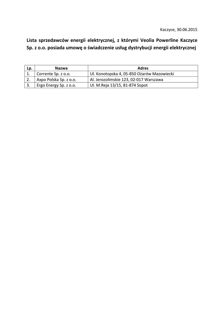Kaczyce, 30.06.2015 Lista sprzedawców energii elektrycznej, z którymi Veolia Powerline Kaczyce Sp. z o.o. posiada umowę o świadczenie usług dystrybucji energii elektrycznej Lp. Nazwa 1. Corrente Sp. z o.o. 2. Axpo Polska Sp. z o.o. 3. Ergo Energy Sp. z o.o. Adres Ul. Konotopska 4, 05-850 Ożarów Mazowiecki Al. Jerozolimskie 123, 02-017 Warszawa Ul. M.Reja 13/15, 81-874 Sopot