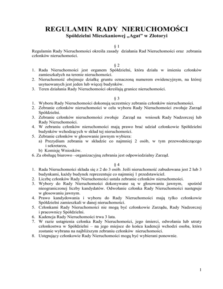 REGULAMIN RADY NIERUCHOMOŚCI Spółdzielni Mieszkaniowej „Agat” w Złotoryi §1 Regulamin Rady Nieruchomości określa zasady działania Rad Nieruchomości oraz zebrania członków nieruchomości. §2 1. Rada Nieruchomości jest organem Spółdzielni, która działa w imieniu członków zamieszkałych na terenie nieruchomości. 2. Nieruchomość obejmuje działkę gruntu oznaczoną numerem ewidencyjnym, na której usytuowanych jest jeden lub więcej budynków. 3. Teren działania Rady Nieruchomości określają granice nieruchomości. §3 1. Wyboru Rady Nieruchomości dokonują uczestnicy zebrania członków nieruchomości. 2. Zebranie członków nieruchomości w celu wyboru Rady Nieruchomości zwołuje Zarząd Spółdzielni. 3. Zebranie członków nieruchomości zwołuje Zarząd na wniosek Rady Nadzorczej lub Rady Nieruchomości. 4. W zebraniu członków nieruchomości mają prawo brać udział członkowie Spółdzielni budynków wchodzących w skład tej nieruchomości. 5. Zebranie członków w głosowanie jawnym wybiera: a) Prezydium zebrania w składzie co najmniej 2 osób, w tym przewodniczącego i sekretarza, b) Komisję Wniosków. 6. Za obsługę biurowo –organizacyjną zebrania jest odpowiedzialny Zarząd. 1. 2. 3. 4. 5. 6. 7. 8. §4 Rada Nieruchomości składa się z 2 do 3 osób. Jeśli nieruchomość zabudowana jest 2 lub 3 budynkami, każdy budynek reprezentuje co najmniej 1 przedstawiciel. Liczbę członków Rady Nieruchomości ustala zebranie członków nieruchomości. Wybory do Rady Nieruchomości dokonywane są w głosowaniu jawnym, spośród nieograniczonej liczby kandydatów. Odwołanie członka Rady Nieruchomości następuje w głosowaniu jawnym. Prawo kandydowania i wyboru do Rady Nieruchomości mają tylko członkowie Spółdzielni zamieszkali w danej nieruchomości. Członkami Rady Nieruchomości nie mogą być członkowie Zarządu, Rady Nadzorczej i pracownicy Spółdzielni. Kadencja Rady Nieruchomości trwa 3 lata. W razie ustąpienia członka Rady Nieruchomości, jego śmierci, odwołania lub utraty członkostwa w Spółdzielni – na jego miejsce do końca kadencji wchodzi osoba, która zostanie wybrana na najbliższym zebraniu członków nieruchomości. Ustępujący członkowie Rady Nieruchomości mogą być wybierani ponownie. 1 §5 Do zadań i kompetencji Rady Nieruchomości należy: 1. Opiniowanie planowanych robót remontowych w sytuacjach braku równowagi finansowej funduszy i planowanych kosztów remontów. 2. Wnioskowanie o uwzględnienie w Planach remontów zakresu robót, które wynikając ze złego stanu technicznego budynku i infrastruktury towarzyszącej oraz potrzeb mieszkańców. 3. Wnioskowanie w sprawach dotyczących utrzymania i eksploatacji budynku, w sprawach międzysąsiedzkich, utrzymania ładu i porządku oraz w sprawach dotyczących osiedla, na którym znajduje się dana nieruchomość. 4. Informowanie administracji i Zarządu Spółdzielni o sprawach, które naruszają dobrze pojęty interes Spółdzielni i jej członków, niszczenia mienia Spółdzielni. 5. Uczestnictwo w pracach Zarządu i Rady Nieruchomości wg potrzeb. 6. Uczestnictwo w Komisyjnych odbiorach robót remontowych (co najmniej jeden członek Rady Nieruchomości). 7. Zgłaszanie do Zarządu Spółdzielni skarg i uwag dotyczących pracy administracji Spółdzielni oraz naruszania przez członków Spółdzielni i użytkowników lokali Regulaminu porządku domowego. §6 1. Rada Nieruchomości spośród swoich członków dokonuje wyboru Przewodniczącego i Sekretarza. 2. Wykonywanie czynności przez członków Rady Nieruchomości wymienionych w § 5 pkt. 1-4 i pkt. 7 wymaga formy pisemnej. §7 1. Rada Nieruchomości może wnosić o zwołanie zebrania członków nieruchomości, co wymaga formy pisemnej z podaniem porządku zebrania. 2. Zebranie członków nieruchomości zwołuje Zarząd Spółdzielni w terminie 14 dni od złożenia wniosku. 3. Członków nieruchomości należy powiadomić pisemnie poprzez skrzynki pocztowe w terminie nie później nić 5 dni przed zebraniem §8 Rada Nieruchomości współpracuje z administracją i Zarządem Spółdzielni wg potrzeb. §9 Niniejszy regulamin został uchwalony przez Radę Nadzorczą Spółdzielni Mieszkaniowej „Agat” w Złotoryi uchwałą nr 9/2010 z dnia 19.04.2010r., stosowanie do § 72a ust. 4 Statutu Spółdzielni z mocą obowiązującą od dnia uchwalenia. 2