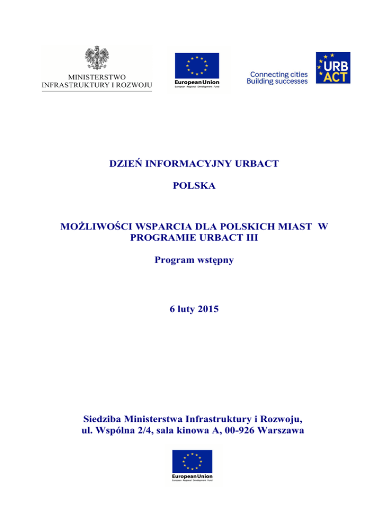 DZIEŃ INFORMACYJNY URBACT POLSKA MOŻLIWOŚCI WSPARCIA DLA POLSKICH MIAST W PROGRAMIE URBACT III Program wstępny 6 luty 2015 Siedziba Ministerstwa Infrastruktury i Rozwoju, ul. Wspólna 2/4, sala kinowa A, 00-926 Warszawa Jak przyśpieszyć rozwój i zaoszczędzić czas? Sesja dla miast, metropolii, Instytucji Zarządzających środkami UE oraz aktorów polityk miejskich 10.00 – 10.15 Przywitanie i wprowadzenie - Marceli Niezgoda, Podsekretarz stanu w Ministerstwie Infrastruktury i Rozwoju URBACT III – korzyści ze zintegrowanego rozwoju miejskiego 10.15 – 11.45 Dlaczego warto prowadzić zintegrowaną politykę? - Jan Olbrycht, poseł do parlamentu europejskiego, przewodniczący intergrupy URBAN Zintegrowana polityka miejska w nowym okresie programowaniaprzedstawiciel Komisji Europejskiej Praca MIiR w zakresie polityk rozwoju miast - Paweł Orłowski, podsekretarz stanu, MIiR Główne założenia Programu URBACT III – Emmanuel Moulin, dyrektor Sekretariatu URBACT 11.45 – 12.15 Przerwa kawowa URBACT II wyniki – doświadczenia miast partnerskich 12.15 – 13.30 Wprowadzenie – Piotr Wołkowiński Wartość dodana sieci URBACT II w Polsce - Aldo Vargas Tetmajer koordynator Krajowego Punktu Kontaktowego URBACT Wnioski z zastosowania metody URBACT - panel dyskusyjny przedstawicieli miast URBACT w Polsce Pytania i odpowiedzi Moderator URBACT Piotr Wołkowiński URBACT III – wspieranie miast we wdrażaniu zintegrowanego rozwoju miejskiego 13.30 – 14.15 • Prezentacja głównych narzędzi i harmonogram – sekretariat URBACT • Możliwości wsparcia miast realizujących Zintegrowane Inwestycje Terytorialne przez Program URBACT III - Joanna Zarzecka-Mazur, Departament Koordynacji Polityki Strukturalnej i Polityk Rozwoju, MIiR Pytania i odpowiedzi 14.15 – 14.45 Wnioski 14.45 Obiad