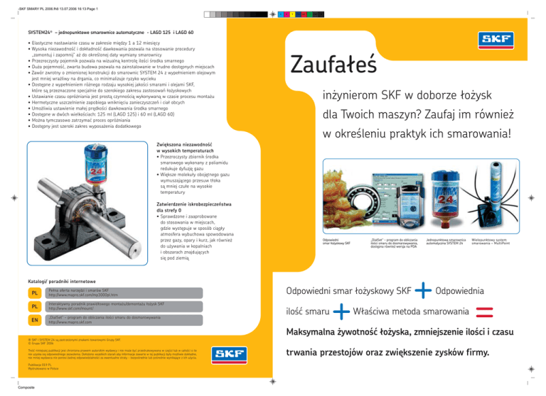 -SKF SMARY PL 2006.fh8 13.07.2006 16:13 Page 1 C M Y CM MY CY CMY K SYSTEM24® – jednopunktowe smarownice automatyczne - LAGD 125 i LAGD 60 • Elastyczne nastawianie czasu w zakresie między 1 a 12 miesięcy • Wysoka niezawodność i dokładność dawkowania pozwala na stosowanie procedury • „zamontuj i zapomnij” aż do określonej daty wymiany smarownicy • Przezroczysty pojemnik pozwala na wizualną kontrolę ilości środka smarnego • Duża pojemność, zwarta budowa pozwala na zainstalowanie w trudno dostępnych miejscach • Zawór zwrotny o zmienionej konstrukcji do smarownic SYSTEM 24 z wypełnieniem olejowym • jest mniej wrażliwy na drgania, co minimalizuje ryzyko wycieku • Dostępne z wypełnieniem różnego rodzaju wysokiej jakości smarami i olejami SKF, • które są przeznaczone specjalnie do szerokiego zakresu zastosowań łożyskowych • Ustawianie czasu opróżniania jest prostą czynnością wykonywaną w czasie procesu montażu • Hermetyczne uszczelnienie zapobiega wniknięciu zanieczyszczeń i ciał obcych • Umożliwia ustawienie małej prędkości dawkowania środka smarnego • Dostępne w dwóch wielkościach: 125 ml (LAGD 125) i 60 ml (LAGD 60) • Można tymczasowo zatrzymać proces opróżniania • Dostępny jest szeroki zakres wyposażenia dodatkowego Zaufałeś inżynierom SKF w doborze łożysk dla Twoich maszyn? Zaufaj im również w określeniu praktyk ich smarowania! Zwiększona niezawodność w wysokich temperaturach • Przezroczysty zbiornik środka • smarowego wykonany z poliamidu • redukuje dyfuzję gazu • Większe molekuły obojętnego gazu • wymuszającego przesuw tłoka • są mniej czułe na wysokie • temperatury Zatwierdzenie iskrobezpieczeństwa dla strefy 0 • Sprawdzone i zaaprobowane • do stosowania w miejscach, • gdzie występuje w sposób ciągły • atmosfera wybuchowa spowodowana • przez gazy, opary i kurz, jak również • do używania w kopalniach • i obszarach znajdujących • się pod ziemią Odpowiedni smar łożyskowy SKF „DialSet” - program do obliczania ilości smaru do dosmarowywania, dostępna również wersja na PDA Katalogi/ poradniki internetowe PL Pełna oferta narzędzi i smarów SKF http://www.mapro.skf.com/mp3000pl.htm PL Interaktywny poradnik prawidłowego montażu/demontażu łożysk SKF http://www.skf.com/mount/ EN „DialSet” - program do obliczania ilości smaru do dosmarowywania http://www.mapro.skf.com Odpowiedni smar łożyskowy SKF ilość smaru + Jednopunktowa smarownica automatyczna SYSTEM 24 + Wielopunktowy system smarowania – MultiPoint Odpowiednia Właściwa metoda smarowania = Maksymalna żywotność łożyska, zmniejszenie ilości i czasu ® SKF i SYSTEM 24 są zastrzeżonymi znakami towarowymi Grupy SKF. © Grupa SKF 2006 Treść niniejszej publikacji jest chroniona prawem autorskim wydawcy i nie może być przedrukowywana w części lub w całości o ile nie uzyska się odpowiedniego zezwolenia. Dołożono wszelkich starań aby informacje zawarte w tej publikacji były możliwie dokładne, nie mniej wydawca nie ponosi żadnej odpowiedzialności za ewentualne straty - bezpośrednie lub pośrednie wynikające z ich użycia. Publikacja 019 PL Wydrukowano w Polsce Composite trwania przestojów oraz zwiększenie zysków firmy. -SKF SMARY PL 2006.fh8 13.07.2006 16:13 Page 2 Composite H – wysoka VL – bardzo niska M – średnia (*4) LGGB 2 może pracować chwilowo w temp. 120 °C / 250 °F (*5) LGWA 2 może pracować chwilowo w temp. 220 °C / 428 °F (*6) LGHB 2 może pracować chwilowo w temp. 200 °C / 392 °F (*7) Zapytaj SKF o okresy pracy smaru do wymiany Zalecany L do M VH LGET 2 H do VH L do M M do H M do H LGHP 2 VL do M H do VH M do H LGHB 2 H M do H LGWA 2 L do M L do M L do M LGWM 1 H L do M L do M LGGB 2 M do H L M do EH L do M LGLT 2 H do VH VL M LGEV 2 H do VH VL M LGEM 2 L do M M M LGFP 2 H L do M M LGEP 2 L do M M M LGMT 3 L do M M M (*1) GPF – współczynnik korekcyjny smaru (*2) LTL – dolna temperatura graniczna (*2) HTPL – górna temperatura zalecana (*3) mm2/s w 40 °C / 104 °F = cSt. Silne drgania Ruchy oscylacyjne Obciążenie Wał pionowy LGMT 2 Dlaczego właściwy dobór smaru jest tak ważny? Smary ogólnego zastosowania nie nadają się do przypadków specjalnych i raczej mogą powodować problemy niż dawać korzyści. Zastosowania łożysk różnią się w zakresie obciążeń, prędkości, temperatury, warunków otoczenia, a właściwe smarowanie oznacza precyzyjny dobór smaru do danego przypadku. Tabela doboru smarów łożyskowych Dlaczego smary SKF mają szczególne własności? SKF jako pionier w projektowaniu i produkcji łożysk najlepiej rozumie potrzebę smarowania łożysk w różnych warunkach pracy. SKF rozumie także, że wyjątkowa jakość produkowanych łożysk, która jest znana na świecie, musi być zabezpieczana przez smary o równie wysokiej jakości. Intensywne badania, testy i praktyczne doświadczenia są częścią składową formuł wszystkich smarów SKF - to zapewnia, że smary SKF są najlepszymi jakie można dostać w jakiejkolwiek części świata. Właściwy dobór smaru ma zasadnicze znaczenie dla bezproblemowej pracy Waszych urządzeń. Wysoka prędkość pierścienia zewnętrznego Właściwe smarowanie łożysk jest krytycznym elementem bezproblemowej pracy maszyny. Znaczenie używania właściwych smarów łożyskowych do odpowiednich zastosowań nie może być niedoceniane. Smar w łożysku ma znaczenie w trzech spośród czterech krytycznych czynników bezproblemowej pracy. Poprzez dobór właściwego smaru SKF uzyskuje się maksymalną długość życia łożyska, co w efekcie daje wydłużenie czasu i obniżenie kosztów produkcji. L – niska Odpowiedni (*7) Obciążenie udarowe Niski poziom hałasu Niskie tarcie lub częsty rozruch Zawsze gdy maszyna jest przeciążona, niewłaściwie obsługiwana lub zaniedbywana – łożyska są narażone na pracę w nieodpowiednich warun