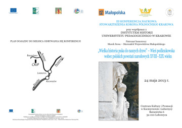 III KONFERENCJA NAUKOWA STOWARZYSZENIA KORONA PÓŁNOCNEGO KRAKOWA przy współpracy z INSTYTUTEM HISTORII UNIWERSYTETU PEDAGOGICZNEGO W KRAKOWIE PLAN DOJAZDU DO MIEJSCA ODBYWANIA SIĘ KONFERENCJI Patronat honorowy: Marek Sowa – Marszałek Województwa Małopolskiego „Wielka historia puka do naszych drzwi” – Wieś podkrakowska wobec polskich powstań narodowych XVIII–XIX wieku 24 maja 2013 r. Europejski Fundusz Rolny na rzecz Rozwoju Obszarów Wiejskich Europa inwestująca w obszary wiejskie. Publikacja współfinansowana ze środków Unii Europejskiej w ramach Oś 4 LEADER w ramach Programu Rozwoju Obszarów Wiejskich na lata 2007–2013 Instytucja Zarządzająca Programem Rozwoju Obszarów Wiejskich na lata 2007–2013 – Ministerstwo Rolnictwa i Rozwoju Wsi Centrum Kultury i Promocji w Kocmyrzowie–Luborzycy Baranówka 6 32-010 Luborzyca Szanowni Państwo, Stowarzyszenie Korona Północnego Krakowa oraz Instytut Historii Uniwersytetu Pedagogicznego im. Komisji Edukacji Narodowej w Krakowie mają zaszczyt zaprosić Państwa na trzecią już konferencję naukową. Tym razem poświęcona jest ona tematyce podkrakowskiej wsi w czasach polskich powstań narodowych XVIII–XIX wieku. PROGRAM 8.30–9.00 – rejestracja uczestników 9.00–11.00 – powitanie uczestników i słowo wstępne : mgr inż. – Piotr Adamczuk – Prezes Stowarzyszenia Korona Północnego Krakowa mgr inż. – Marek Jamborski – Wójt Gminy Kocmyrzów–Luborzyca mgr Monika Wołek – Członek Zarządu LGD „Stowarzyszenia Korony Północnego Krakowa”, historyk – „ Wielka historia w kronikach najstarszych szkół Korony Północnego Krakowa” mgr Elżbieta Kwaśniewska – „Stowarzyszenie Przyjaciół Ziemi Michałowickiej”, regionalista, – „ Okruchy XIX-wiecznych wspomnień z michałowickiej ziemi” mgr inż. Sławomir Korzonek – regionalista – „Polskie powstania narodowe oraz ich ślady w dolinie Rudawy” Dyskusja. 13.00 – 13.30 – Poczęstunek regionalny. dr Mateusz Wyżga – Instytut Historii Uniwersytetu Pedagogicznego w Krakowie – „Echa Konfederacji Barskiej pod Krakowem” 13.30 – 15.00 mgr Jarosław Duda – regionalista – „Powstanie Styczniowe w podaniach i legendach ludowych wsi podkrakowskich na przykładzie gminy Igołomia–Wawrzeńczyce” dr hab. Krzysztof Ślusarek – Instytut Historii Uniwersytetu Jagiellońskiego w Krakowie – „Wieś podkrakowska w dobie Powstania Kościuszkowskiego i Księstwa Warszawskiego” mgr Julita Wawrowska – historyk, regionalista – „Z działalności Kieleckiej Komisji Likwidacyjnej. Uwłaszczenie chłopów w dobrach skrzeszowickich (gmina Kocmyrzów–Luborzyca)” dr hab. Tomasz Kargol – Instytut Historii Uniwersytetu Jagiellońskiego w Krakowie – „Galicja w Powstaniu Styczniowym na przykładzie wsi podkrakowskich” mgr Iwona Opałka – „Kultura pamięci – promocja dziedzictwa historycznego na przykładzie gminy Zielonki – miejsca, osoby, legendy” dr Konrad Meus – Instytut Historii Uniwersytetu Pedagogicznego w Krakowie – „Wieś podkrakowska a kwestia narodowa w XIX wieku” Dyskusja. 11.15–11.30 – Przerwa kawowa. 11.30–13.00 mgr Jerzy St. Kozik – Członek Rady Programowej LGD „Stowarzyszenia Korony Północnego Krakowa”, historyk – „ Ludwik Mazaraki (1813–1880) – zapominany powstaniec” Podsumowanie i zakończenie konferencji. Przewodniczący Komitetu Organizacyjnego: Jerzy St. Kozik tel. 691 533 433, e-mail : [email protected] Biuro LGD „Stowarzyszenie Korona Północnego Krakowa” tel. 664 067 821, e- mail : [email protected] Sekretariat Komitetu Organizacyjnego: Barbara Kawa, Małgorzata Fugiel-Kmita, Joanna Murek, Stanisław Myjak, Jarosław Sadowski, Monika Wołek, Mateusz Wyżga