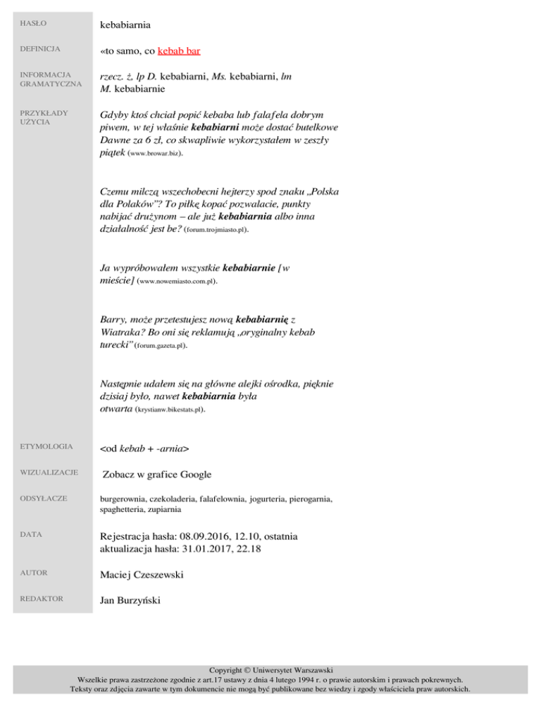 HASŁO kebabiarnia DEFINICJA «to samo, co kebab bar» INFORMACJA GRAMATYCZNA rzecz. ż, lp D. kebabiarni, Ms. kebabiarni, lm M. kebabiarnie PRZYKŁADY UŻYCIA Gdyby ktoś chciał popić kebaba lub falafela dobrym piwem, w tej właśnie kebabiarni może dostać butelkowe Dawne za 6 zł, co skwapliwie wykorzystałem w zeszły piątek (www.browar.biz). Czemu milczą wszechobecni hejterzy spod znaku „Polska dla Polaków”? To piłkę kopać pozwalacie, punkty nabijać drużynom – ale już kebabiarnia albo inna działalność jest be? (forum.trojmiasto.pl). Ja wypróbowałem wszystkie kebabiarnie [w mieście] (www.nowemiasto.com.pl). Barry, może przetestujesz nową kebabiarnię z Wiatraka? Bo oni się reklamują „oryginalny kebab turecki” (forum.gazeta.pl). Następnie udałem się na główne alejki ośrodka, pięknie dzisiaj było, nawet kebabiarnia była otwarta (krystianw.bikestats.pl). ETYMOLOGIA WIZUALIZACJE <od kebab + -arnia> Zobacz w grafice Google ODSYŁACZE burgerownia, czekoladeria, falafelownia, jogurteria, pierogarnia, spaghetteria, zupiarnia DATA Rejestracja hasła: 08.09.2016, 12.10, ostatnia aktualizacja hasła: 31.01.2017, 22.18 AUTOR Maciej Czeszewski REDAKTOR Jan Burzyński Copyright © Uniwersytet Warszawski Wszelkie prawa zastrzeżone zgodnie z art.17 ustawy z dnia 4 lutego 1994 r. o prawie autorskim i prawach pokrewnych. Teksty oraz zdjęcia zawarte w tym dokumencie nie mogą być publikowane bez wiedzy i zgody właściciela praw autorskich. Powered by TCPDF (www.tcpdf.org)