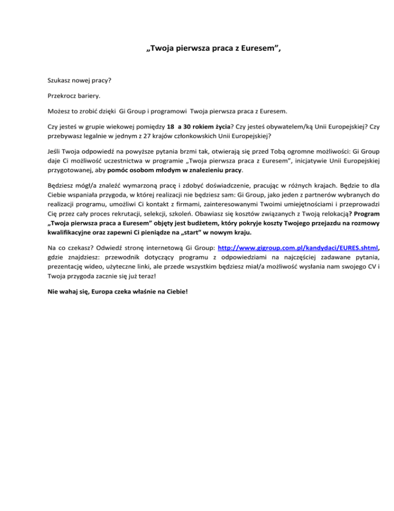 „Twoja pierwsza praca z Euresem”, Szukasz nowej pracy? Przekrocz bariery. Możesz to zrobić dzięki Gi Group i programowi Twoja pierwsza praca z Euresem. Czy jesteś w grupie wiekowej pomiędzy 18 a 30 rokiem życia? Czy jesteś obywatelem/ką Unii Europejskiej? Czy przebywasz legalnie w jednym z 27 krajów członkowskich Unii Europejskiej? Jeśli Twoja odpowiedź na powyższe pytania brzmi tak, otwierają się przed Tobą ogromne możliwości: Gi Group daje Ci możliwość uczestnictwa w programie „Twoja pierwsza praca z Euresem”, inicjatywie Unii Europejskiej przygotowanej, aby pomóc osobom młodym w znalezieniu pracy. Będziesz mógł/a znaleźć wymarzoną pracę i zdobyć doświadczenie, pracując w różnych krajach. Będzie to dla Ciebie wspaniała przygoda, w której realizacji nie będziesz sam: Gi Group, jako jeden z partnerów wybranych do realizacji programu, umożliwi Ci kontakt z firmami, zainteresowanymi Twoimi umiejętnościami i przeprowadzi Cię przez cały proces rekrutacji, selekcji, szkoleń. Obawiasz się kosztów związanych z Twoją relokacją? Program „Twoja pierwsza praca a Euresem” objęty jest budżetem, który pokryje koszty Twojego przejazdu na rozmowy kwalifikacyjne oraz zapewni Ci pieniądze na „start” w nowym kraju. Na co czekasz? Odwiedź stronę internetową Gi Group: http://www.gigroup.com.pl/kandydaci/EURES.shtml, gdzie znajdziesz: przewodnik dotyczący programu z odpowiedziami na najczęściej zadawane pytania, prezentację wideo, użyteczne linki, ale przede wszystkim będziesz miał/a możliwość wysłania nam swojego CV i Twoja przygoda zacznie się już teraz! Nie wahaj się, Europa czeka właśnie na Ciebie!