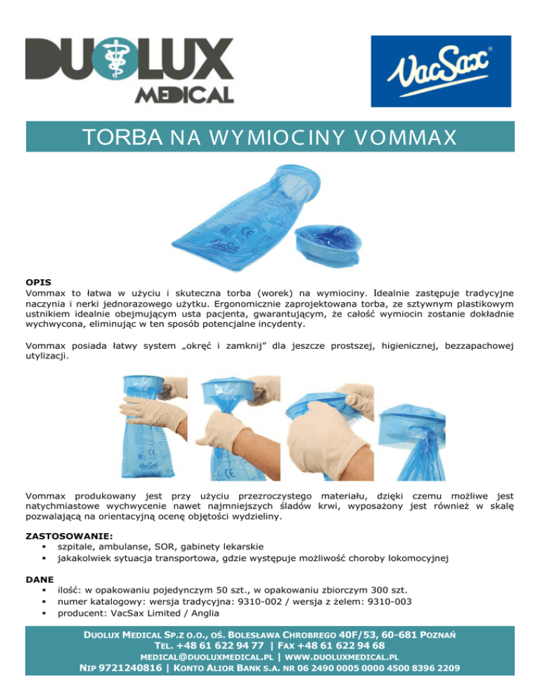 TORBA NA WY MIOC INY V OMMAX OPIS Vommax to łatwa w użyciu i skuteczna torba (worek) na wymiociny. Idealnie zastępuje tradycyjne naczynia i nerki jednorazowego użytku. Ergonomicznie zaprojektowana torba, ze sztywnym plastikowym ustnikiem idealnie obejmującym usta pacjenta, gwarantującym, że całość wymiocin zostanie dokładnie wychwycona, eliminując w ten sposób potencjalne incydenty. Vommax posiada łatwy system „okręć i zamknij” dla jeszcze prostszej, higienicznej, bezzapachowej utylizacji. Vommax produkowany jest przy użyciu przezroczystego materiału, dzięki czemu możliwe jest natychmiastowe wychwycenie nawet najmniejszych śladów krwi, wyposażony jest również w skalę pozwalającą na orientacyjną ocenę objętości wydzieliny. ZASTOSOWANIE: szpitale, ambulanse, SOR, gabinety lekarskie jakakolwiek sytuacja transportowa, gdzie występuje możliwość choroby lokomocyjnej DANE ilość: w opakowaniu pojedynczym 50 szt., w opakowaniu zbiorczym 300 szt. numer katalogowy: wersja tradycyjna: 9310-002 / wersja z żelem: 9310-003 producent: VacSax Limited / Anglia DUOLUX MEDICAL SP.Z O.O., OŚ. BOLESŁAWA CHROBREGO 40F/53, 60-681 POZNAŃ TEL. +48 61 622 94 77 | FAX +48 61 622 94 68 [email protected] | WWW.DUOLUXMEDICAL.PL NIP 9721240816 | KONTO ALIOR BANK S.A. NR 06 2490 0005 0000 4500 8396 2209