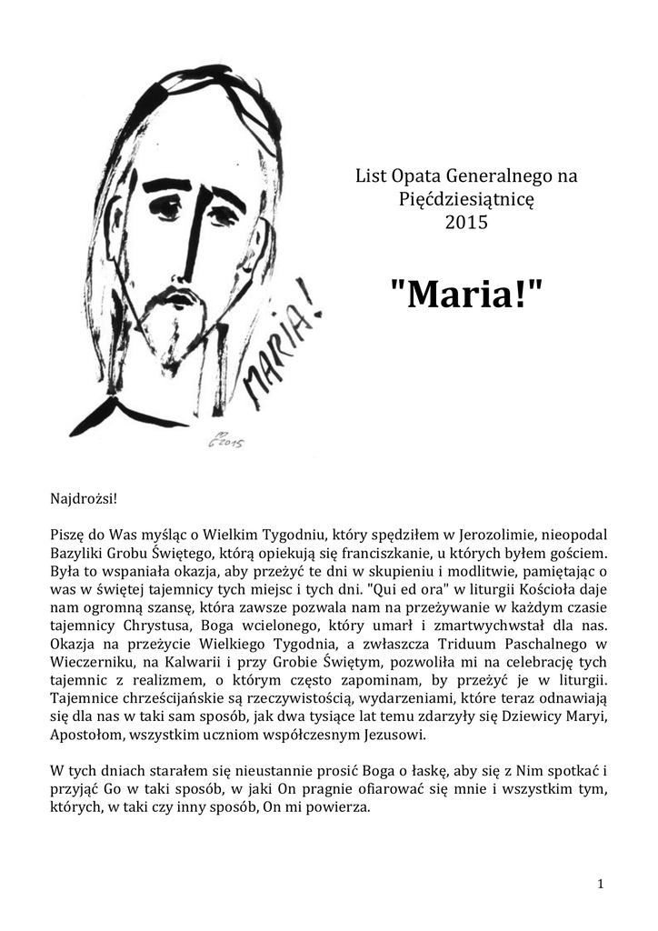 ! ! ! ! ! List!Opata!Generalnego!na! Pięćdziesiątnicę! 2015! ! ! "Maria!"' ! ! ! Najdrożsi!! ! Piszę!do!Was!myśląc!o!Wielkim!Tygodniu,!który!spędziłem!w!Jerozolimie,!nieopodal! Bazyliki!Grobu!Świętego,!którą!opiekują!się!franciszkanie,!u!których!byłem!gościem.! Była!to!wspaniała!okazja,!aby!przeżyć!te!dni!w!skupieniu!i!modlitwie,!pamiętając!o! was!w!świętej!tajemnicy!tych!miejsc!i!tych!dni.!"Qui!ed!ora"!w!liturgii!Kościoła!daje! nam!ogromną!szansę,!która!zawsze!pozwala!nam!na!przeżywanie!w!każdym!czasie! tajemnicy! Chrystusa,! Boga! wcielonego,! który! umarł! i! zmartwychwstał! dla! nas.! Okazja! na! przeżycie! Wielkiego! Tygodnia,! a! zwłaszcza! Triduum! Paschalnego! w! Wieczerniku,! na! Kalwarii! i! przy! Grobie! Świętym,! pozwoliła! mi! na! celebrację! tych! tajemnic! z! realizmem,! o! którym! często! zapominam,! by! przeżyć! je! w! liturgii.! Tajemnice!chrześcijańskie!są!rzeczywistością,!wydarzeniami,!które!teraz!odnawiają! się!dla!nas!w!taki!sam!sposób,!jak!dwa!tysiące!lat!temu!zdarzyły!się!Dziewicy!Maryi,! Apostołom,!wszystkim!uczniom!współczesnym!Jezusowi.! ! W!tych!dniach!starałem!się!nieustannie!prosić!Boga!o!łaskę,!aby!się!z!Nim!spotkać!i! przyjąć! Go! w! taki! sposób,! w! jaki! On! pragnie! ofiarować! się! mnie! i! wszystkim! tym,! których,!w!taki!czy!inny!sposób,!On!mi!powierza.! ! ! ! ! 1! ' Pierwsze'spotkanie'ze'Zmartwychwstałym' ! Fragment!ewangeliczny,!który!szczególnie!do!mnie!przemówił!w!tych!dniach,!jest!to! spotkanie! zmartwychwstałego! Chrystusa! z! Marią! Magdaleną! w! Ewangelii! według! św.! Jana! (20,11\18).! Każdego! wieczora! franciszkanie! opiekujący! się! Grobem! Świętym!powracają!do!miejsc!Męki!i!Zmartwychwstania!Pańskiego!znajdujących!się! w! bazylice,! idąc! w! procesji,! podczas! której! zachowują! antyczny! rytuał! i! śpiew.! Kończy! się! ona! w! miejscu,! który! tradycja! wskazuje,! jako! punkt! ukazania! się! zmartwychwstałego! Pana! Marii! Magdalenie.! Za! każdym! razem! przeżywałem! ten! ostatni! etap! procesji! ze! szczególnym! wzruszeniem,! ponieważ! tutaj! miało! miejsce! fundamentalne! wydarzenie! naszej! chrześcijańskiej! wiary,! powstanie! Chrystusa! z! martwych,! po! raz! pierwszy! stało! się! spotkaniem,! osobistym! doświadczeniem! zmysłów! i! serca! człowieka! takiego,! jak! my.! To! od! spotkania! z! Marią! Magdaleną,! Zmartwychwstały! zaczął! "czynić! wszystko! nowe"! (por.! Ap! 21,! 5).! Jak! nastąpiło! zmartwychwstanie,! nikt! nie! wie,! nikt! nie! może! tego! opisać,! ale! zmartwychwstanie! jest! faktem,! prawdziwym! wydarzeniem,! ponieważ! Zmartwychwstały! naprawdę! spotkał!swoich!uczniów,!a!pierwszą!była!Maria!Magdalena.! ! Z!tego!powodu!spotkanie!z!Marią!Magdaleną!ma!zasadnicze!znaczenie!dla!każdego!z! nas,!jest!paradygmatem!jak!wydarzenie,!które!nadaje!sens!całej!naszej!wierze,!może! stać!się!doświadczeniem!dla!wszystkich.!Bo!jeśli!Zmartwychwstały!zwyciężył!naszą! śmierć!i!nasz!grzech,!fakt!spotkania!z!Nim!jest!dla!każdego!z!nas!jedynym!ratunkiem,! jedynym!doświadczeniem,!które!może!wypełnić!nasze!życie!szczęściem.!Spotkanie!z! Marią!Magdaleną!jest!pierwszym,!które!się!wydarzyło!i!które!jako!pierwsze!opisane! jest! w! Ewangelii,! dlatego! że! w! nim! zostało! nam! objawione! doświadczenie,! które! możemy! i! musimy! przeżyć,! jeśli! chcemy! w! pełni! zaspokoić! pragnienie! zbawienia! naszego!serca.! ! W! moich! ostatnich! listach! podkreślałem! znaczenie! odkrycia! mistycznego! wymiaru! naszego! powołania! chrześcijańskiego! i! zakonnego,! wraz! z! wymiarem! wspólnotowym,! w! którym! dar! komunii! z! Chrystusem! promieniuje! i! staje! się! prawdziwym.! Od! tego! zależy! głębia! i! autentyczność! naszego! chrześcijańskiego! powołania!i!naszego!powołania,!jako!ludzi!wezwanych!do!przezywania!Roku!Życia! Konsekrowanego,!do!konkretnego!nawrócenia!w!przeżywaniu!swojego!charyzmatu! w!całej!jego!istocie,!oczyszczając!się,!przynajmniej!wewnętrznie,!z!tego!wszystkiego,! co!nas!obciąża!i!utrudnia!nam!drogę!sequela'Christi.! ! Epizod! spotkania! zmartwychwstałego! Chrystusa! z! Marią! Magdaleną! jest! jakby! syntezą!doświadczenia!chrześcijańskiego.!Wydaje!mi!się,!że!powinniśmy!utożsamić! się! z! tym! ewangelicznym! wydarzeniem,! aby! zrozumieć,! w! jaki! sposób! możemy! przeżyć!spotkanie!z!Panem. ! ! ! ! 2! "Niewiasto,'czemu'płaczesz?"' ! Maria! Magdalena! miłowała! Jezusa.! To,! co! ją! prowadzi! do! Grobu,! to! pragnienie! wyrażenia!jeszcze!raz!swojej!miłości,!przynajmniej!namaszczając!Jego!martwe!ciało.! Lecz! gdy! znajduje! pusty! grób,! to! pragnienie! zmienia! się! w! lęk! i! smutek.! Tego,! którego! Maria! pragnie! zobaczyć,! nie! ma! już,! nie! ma! nawet! zwłok,! nie! wie! gdzie! go! szukać,!gdzie!go!znaleźć,!do!kogo!się!zwrócić.!Cała!rzeczywistość!staje!się!tym,!co!jej! ukrywa!lub!utrudnia!powrót!jej!Pana.!Ktoś!jest!"winny"!tego!zniknięcia,!ale!nie!wie,! kogo!oskarżyć:!"Zabrano!Pana!mego!i!nie!wiem,!gdzie!Go!położono"!(J!20,13),!mówi! aniołom.! Podejrzewa! także! Jezusa! \! myląc! go! z! ogrodnikiem! \! że! jest! winny! tego! zniknięcia:!"Panie,!jeśli!ty!Go!przeniosłeś,!powiedz!mi,!gdzie!Go!położyłeś!"!(20,15).! ! Maria! płacze.! Płacze! z! bólu,! z! miłości,! ze! złości,! ze! strachu,! z! obawy.! Płacz! jest! wyrazem! bólu! ludzkiego! serca,! jakiego! doświadcza.! Nawet! Jezus! płakał! z! powodu! śmierci! Łazarza,! ze! współczucia! i! rozczarowania! na! widok! Jerozolimy,! z! lęku! w! obliczu!śmierci!w!ogrodzie!Getsemani!(por.!J!11,35;!Łk!19,41;!Mt!26,37\38;!Hbr!5,7).! ! Aniołowie! znajdujący! się! w! grobie! Pana! i! sam! Jezus! nie! potępiają! płaczu! Marii.! Zachęcają! ją! jednak! do! uświadomienia! sobie! powodu! tego! płaczu,! do! określenia! skąd!bierze!się!ten!smutek:!"Niewiasto,!czemu!płaczesz?".!Jezus!dodaje!także!"Kogo! szuka