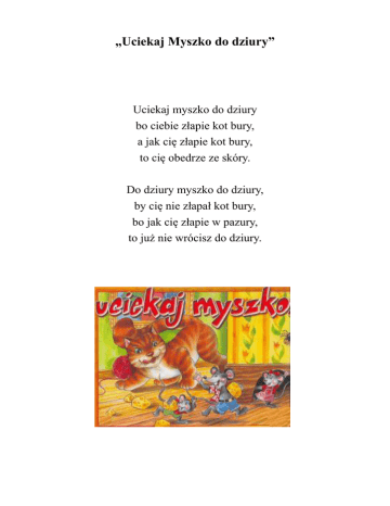 „Uciekaj Myszko do dziury” Uciekaj myszko do dziury bo ciebie złapie kot bury, a jak cię złapie kot bury, to cię obedrze ze skóry. Do dziury myszko do dziury, by cię nie złapał kot bury, bo jak cię złapie w pazury, to już nie wrócisz do dziury.