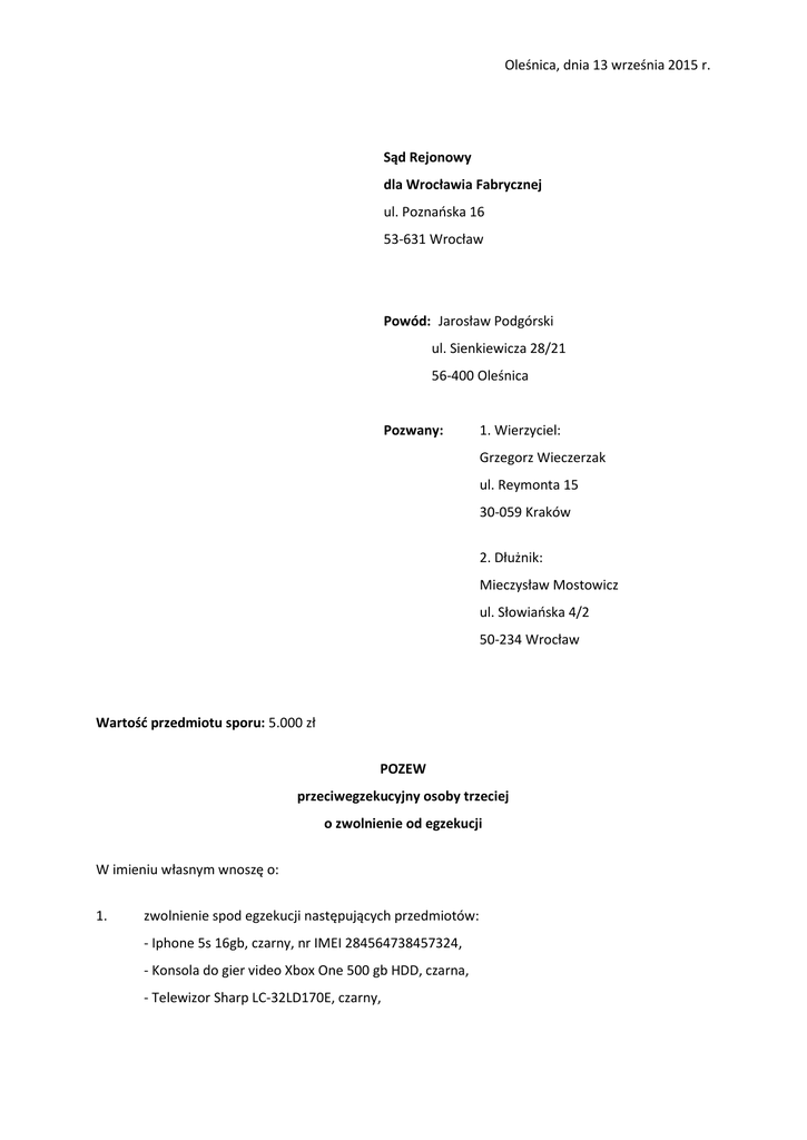Oleśnica, dnia 13 września 2015 r. Sąd Rejonowy dla Wrocławia Fabrycznej ul. Poznaoska 16 53-631 Wrocław Powód: Jarosław Podgórski ul. Sienkiewicza 28/21 56-400 Oleśnica Pozwany: 1. Wierzyciel: Grzegorz Wieczerzak ul. Reymonta 15 30-059 Kraków 2. Dłużnik: Mieczysław Mostowicz ul. Słowiaoska 4/2 50-234 Wrocław Wartośd przedmiotu sporu: 5.000 zł POZEW przeciwegzekucyjny osoby trzeciej o zwolnienie od egzekucji W imieniu własnym wnoszę o: 1. zwolnienie spod egzekucji następujących przedmiotów: - Iphone 5s 16gb, czarny, nr IMEI 284564738457324, - Konsola do gier video Xbox One 500 gb HDD, czarna, - Telewizor Sharp LC-32LD170E, czarny, zajętych u pozwanego-dłużnika Mieczysława Mostowicza przez Komornika Sądu Rejonowego we Wrocławiu w dniu 5 września 2015 r. w sprawie egzekucyjnej o sygn. KM 234/15 2. przeprowadzenie dowodu z przesłuchania stron na okoliczności wskazane w uzasadnieniu, 3. przeprowadzenie dowodu z zeznao świadków, na okoliczności wskazane w uzasadnieniu, 4. dopuszczenie dowodu z dokumentów, na okoliczności wskazane w uzasadnieniu, 5. zażądanie od komornika Sądu Rejonowego we Wrocławiu akt egzekucyjnych o sygn. KM 234/15 i dopuszczenie ich, jako dowodów w przedmiotowej sprawie, 6. zasądzenie od pozwanego na rzecz powoda kosztów procesu według norm przepisanych, 7. przeprowadzenie rozprawy także pod nieobecnośd powoda, 8. zabezpieczenie powództwa przez zawieszenie postępowania egzekucyjnego we wskazanej powyżej sprawie, w części dotyczącej egzekucji z ruchomości wskazanych w pkt 1. Uzasadnienie W dniu 5 września 2015 r. Komornik Sądu Rejonowego we Wrocławiu wszczął na wniosek pozwanego-wierzyciela Grzegorza Wieczerzaka egzekucję przez zajęcie ruchomości w mieszkaniu/lokalu/na posesji pozwanego-dłużnika Mieczysława Mostowicza przy ul. Słowiaoskiej 4/2 we Wrocławiu Dowód: Akta komornika Sądu Rejonowego we Wrocławiu, sygn. KM 234/15 na okolicznośd ustalenia daty oraz sposobu wszczęcia egzekucji, a także jej zakresu. W dniu 6 września 2015 r. powód otrzymał wiadomośd o zajęciu u pozwanego-dłużnika przez Komornika Sądu Rejonowego we Wrocławiu następujących ruchomości: Iphone 5s 16gb, czarny, nr IMEI 284564738457324, Konsola do gier video Xbox One 500 gb HDD, czarna, Telewizor Sharp LC32LD170E, czarny. Wyżej wymienione ruchomości stanowią własnośd powoda, ponieważ dokonał ich zakupu miesiąc czasu przed dokonaniem zajęcia przez komornika. Natomiast dłużnik korzystał z nich tylko na zasadzie koleżeoskiego wypożyczenia. Dowód: 1. Zawiadomienie o zajęciu ruchomości z dnia 5 września 2015r. 2. Przesłuchanie stron na okolicznośd określenia właściciela spornych ruchomości 3. Rachunek z zakupu z sieci sklepów Media Markt z dnia 5 sierpnia na zakup wskazanych ruchomości. Wobec powyższego w dniu 9 września 2015 r. powód wysłał do pozwanego-wierzyciela jak również do pozwanego-dłużnika listem poleconym pismo, w którym wskazał, że do powyższych ruchomości przysługuje mu prawo własności i wezwał pozwanego-dłużnika do zwolnienia ich od egzekucji. Dowód: Odpis pisma z dnia 9 września 2015 r. wraz ze zwrotnymi potwierdzeniami odbioru. Mimo wykazania, iż zajęte przedmioty nie stanowią własności pozwanego-dłużnika, do zwolnienia od egzekucji nie doszło. Trzeba wobec tego uznad, iż wobec zaistniałych okoliczności pozew jest w pełni zasadny, wobec tego wnoszę jak na wstępie. ……………………………………………… Jarosław Podgórski (własnoręczny podpis) Załączniki: 1. Zawiadomienie o zajęciu ruchomości z dnia 5 września 2015 r. 2. Przesłuchanie stron na okolicznośd określenia właściciela spornych ruchomości 3. Rachunek z zakupu z sieci sklepów Media Markt z dnia 5 sierpnia na zakup wskazanych ruchomości. 4. Odpis pisma z dnia 9 września 2015 r. wraz ze zwrotnymi potwierdzeniami odbioru. 5. Odpis pozwu razem z załącznikami.