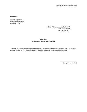 Poznao 24 września 2015 roku Pracownik: Jadwiga Ziębioska ul. Orzechowa 23/12 61-447 Poznao Sklep Wielobranżowy „Pasikonik” ul. Skórzewska 21 66-446 Poznao WNIOSEK o udzielenie opieki nad dzieckiem Zwracam się z uprzejmą prośbą o udzielenie mi 2 dni opieki nad dzieckiem zgodnie z art.188 kodeksu pracy w dniach 20 i 21 października 2015 roku zachowaniem prawa do wynagrodzenia. ......................................... (podpis pracownika)