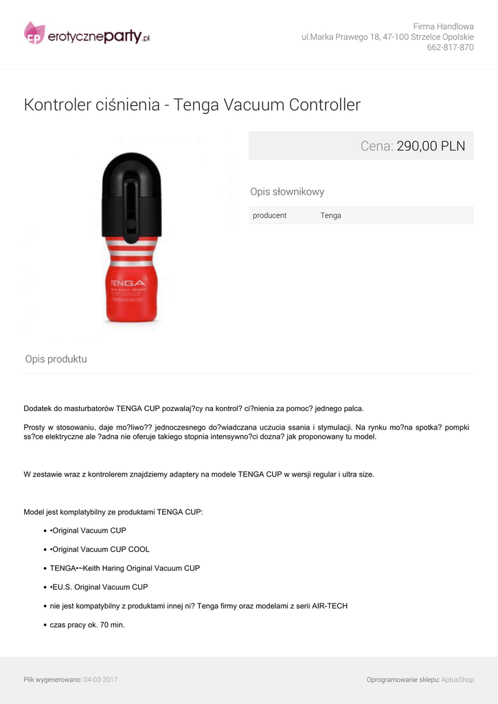Firma Handlowa ul.Marka Prawego 18, 47-100 Strzelce Opolskie 662-817-870 Kontroler ciśnienia - Tenga Vacuum Controller Cena: 290,00 PLN Opis słownikowy producent Tenga Opis produktu Dodatek do masturbatorów TENGA CUP pozwalaj?cy na kontrol? ci?nienia za pomoc? jednego palca. Prosty w stosowaniu, daje mo?liwo?? jednoczesnego do?wiadczana uczucia ssania i stymulacji. Na rynku mo?na spotka? pompki ss?ce elektryczne ale ?adna nie oferuje takiego stopnia intensywno?ci dozna? jak proponowany tu model. W zestawie wraz z kontrolerem znajdziemy adaptery na modele TENGA CUP w wersji regular i ultra size. Model jest komplatybilny ze produktami TENGA CUP: •Original Vacuum CUP •Original Vacuum CUP COOL TENGA•~Keith Haring Original Vacuum CUP •EU.S. Original Vacuum CUP nie jest kompatybilny z produktami innej ni? Tenga firmy oraz modelami z serii AIR-TECH czas pracy ok. 70 min. Plik wygenerowano: 04-03-2017 Oprogramowanie sklepu: AptusShop Firma Handlowa ul.Marka Prawego 18, 47-100 Strzelce Opolskie 662-817-870 zasilanie 4xAAA Plik wygenerowano: 04-03-2017 Powered by TCPDF (www.tcpdf.org) Oprogramowanie sklepu: AptusShop