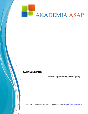 SZKOLENIE Etykieta i protokół dyplomatyczny tel.: +48 22 100-48-96; fax: +48 22 300-52-79 ; e-mail: [email protected] TRENERZY i KONSULTANCI NASZA MISJA DOSTARCZENIE RZETELNEJ INFORMACJI POZWALAJĄCEJ NA ROZWÓJ I PODNIESIENIE POZIOMU DOJRZAŁOŚCI ORGANIZACJI. Stawiamy na kompetencje, jakość i wiarygodność. Mamy doświadczenia praktyczne i aktualną wiedzę. Działamy rzetelnie, szybko i profesjonalnie. DORADCY WIEDZA I UMIEJĘTNOŚCI TO NAJCENNIEJSZY KAPITAŁ KAŻDEJ ORGANIZACJI. to kilkadziesiąt osób z wybitnymi osiągnięciami zarówno w pracy zawodowej (kadra menadżerska, dyrektorzy, osoby zarządzające firmami) jak i przedstawiciele nauki (doktorzy, adiunkci znanych polskich uczelni, szefowie katedr finansów, ekonomii, zarządzania i strategii). W swoich szeregach mamy także osoby znające z własnego doświadczenia instytucje przyznające środki europejskie – one najlepiej wiedzą jak pisać wnioski o dotacje. TRENERZY 2 KONSULTANCI to nasz najbardziej zróżnicowany wiekowo zespół. Mamy analityków, asystentów – ludzi młodych i pełnych energii, całkowicie poświęcających się pracy, która jest ich pasją. Budują oni wciąż swoje kompetencje pod opieką naszych ekspertów czerpiących inspirację z dziesiątek projektów i firm, którym pomagali zrozumieć zachodzące procesy i wdrożyć pożądane zmiany. Cieszymy się także doświadczonym zespołem Kierowników Projektu oraz osób zarządzających Portfelami Projektów – wszyscy mają certyfikaty największą radość sprawiają nam te chwile, kiedy Klient mówi, że chce nasze szkolenie, ale „koniecznie z tym, wybranym trenerem” – to znacznie więcej niż dobre oceny w ankietach. My z takimi ludźmi właśnie współpracujemy, a osobowości wybitne zatrudniamy na stałe. Atmosfera w Akademii sprzyja wymianie wiedzy, czerpiemy inspiracje z projektów do szkoleń, zaś ze szkoleń przenosimy wiedzę do projektów. To naprawdę działa i nasi Klienci to dostrzegają i z tego korzystają. OFERTA SZKOLENIA PROBLEMY I POTRZEBY ZASPOKAJANE PRZEZ SZKOLENIE Celem szkolenia jest przedstawienie oraz przepracowanie kluczowych zasad savoir vivre przy jednoczesnym uwzględnieniu etykiety towarzyskiej jak i biznesowej. Profesjonalny wizerunek to przede wszystkim znajomość i umiejętne wykorzystywanie zasad savoir vivre. Szkolenie obejmuje normy obowiązujące w etykiecie towarzyskiej oraz biznesowej, co stanowi unikalne rozwiązanie na współczesnym rynku szkoleniowym. INFORMACJE PODSTAWOWE Forma treningu: Wykład prowadzony w oparciu o liczne przykłady z praktyki Wymiar czasowy: 2 dni (16 godzin lekcyjnych) Cena za grupę: (dotyczy szkoleń zamkniętych do 10 osób): 4.900* zł Cena za Uczestnika: (dotyczy szkoleń otwartych): 960* zł * Cena bez laptopa. Szkolenie z Laptopem: + 990zł/osoba CELE SZKOLENIA Szkolenie prowadzone metodą warsztatową oraz ożywionej dyskusji, odgrywanych scenek pozwala uczestnikom zgłębić tajniki m.in..: przedstawiania i prezentacji innych oraz tytułowania w życiu zawodowym, przygotowania i prowadzenia korespondencji biznesowej, jak sprawnie zorganizować spotkanie, przyjęcie, konferencję, jakie są elementy międzynarodowego savoir-vivre, jakie „gafy” popełniamy i jak ich uniknąć? METODY PRACY Metody pracy jakie stosujemy podczas szkolenia to przede wszystkim aktywny warsztat pozwalający na zdobycie praktycznych umiejętności, case study oraz elementy wykładu. Dzięki takiej formie dodatkowo wzbogaconej o pracę indywidualną i w małych grupach przekazujemy uczestnikom wiedzę pozwalającą na kompetentną realizację zadań, z którymi spotykają się w swojej pracy zawodowej. www.akademiaasap.pl 3 PROGRAM TRENINGU Zakres szkolenia PROTOKÓŁ DYPLOMATYCZN Y DYPLOMACJA W POLSCE ETYKIETA I DOBRE OBYCZAJE Pojęcie protokołu dyplomatycznego Zasady, zakres i funkcję protokołu dyplomatycznego Akredytacje Korpus dyplomatyczny i konsularny Sprawy starszeństwa Etykieta, czyli dobre maniery Pojęcia i zasady rządzące dobrym wychowaniem Zasady właściwego zachowania się Pojęcie precedencji Precedencja państwowa, dyplomatyczna, biznesowa Prawa strona – lewa strona Zasada alternatu Rozsadzanie gości przy stole – „zarządzanie pierwszeństwem”, „zarządzanie przestrzenią” USTALANIE PIERWSZEŃSTW A PRZERWA NA OBIAD STÓŁ I NAKRYCIA – INSTRUKCJA OBSŁUGI Rodzaje i funkcje; zasady używania wizytówek Korespondencja za pomocą wizytówek Wizytówki przy kwiatach i upominkach BILETY WIZYTOWE UNIA EUROPEJSKA NAWIĄZYWANIE KONTAKTÓW 4 Symbole UE Protokół UE Kalendarz Prezydencji Tytułowanie Pozdrawianie: powitania i pożegnania Przestawianie siebie i innych Prezentacja Uścisk dłoni, podawanie rąk, całowanie w rękę Mowa ciała Zakres szkolenia - cd PRZYJĘCIA ORGANIZACJA I UCZESTNICZENI E WIZYTY ZAGRANICZNE ZASADY PROWADZENIA KORESPONDEN CJI OKAZJA A UBIÓR – DRESS CODE TEST Z OMÓWIENIEM PYTAŃ I ODPOWIEDZI Rola i formy przyjęć Zaproszenia Obowiązki gospodarza i gości Toasty Dobre maniery Gafy Rodzaje i formy wizyt Zasadnicze elementy i przebieg wizyty Redakcja i przygotowanie programu Podstawowe zasady korespondencji Zasadnicze części listu oficjalnego, służbowego i prywatnego Układ listu Poczta elektroniczna Zasady ogólne Zasady ubierania się mężczyzn Zasady ubierania się kobiet Ubiór niestosowny – podstawowe uchybienia pań i panów Przykłady ubiorów męskich i damskich Test Dyskusja www.akademiaasap.pl 5 www.akademiaasap.pl