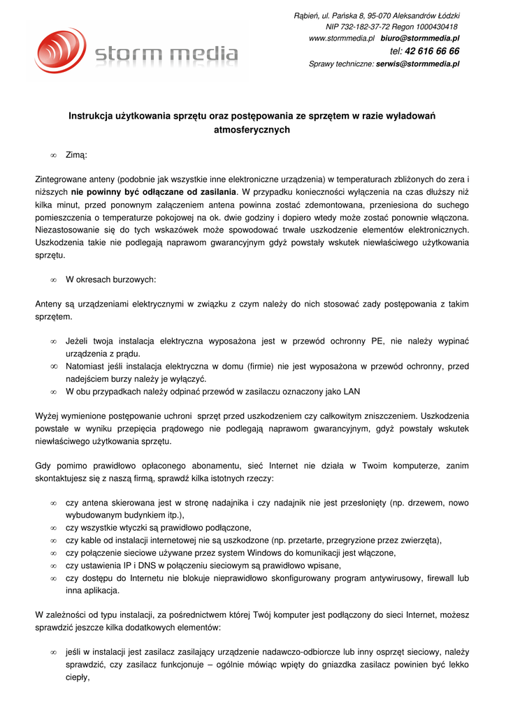 Rąbień, ul. Pańska 8, 95070 Aleksandrów Łódzki NIP 7321823772 Regon 1000430418 www.stormmedia.pl [email protected] tel: 42 616 66 66 Sprawy techniczne: [email protected] Instrukcja użytkowania sprzętu oraz postępowania ze sprzętem w razie wyładowań atmosferycznych • Zimą: Zintegrowane anteny (podobnie jak wszystkie inne elektroniczne urządzenia) w temperaturach zbliżonych do zera i niższych nie powinny być odłączane od zasilania. W przypadku konieczności wyłączenia na czas dłuższy niż kilka minut, przed ponownym załączeniem antena powinna zostać zdemontowana, przeniesiona do suchego pomieszczenia o temperaturze pokojowej na ok. dwie godziny i dopiero wtedy może zostać ponownie włączona. Niezastosowanie się do tych wskazówek może spowodować trwałe uszkodzenie elementów elektronicznych. Uszkodzenia takie nie podlegają naprawom gwarancyjnym gdyż powstały wskutek niewłaściwego użytkowania sprzętu. • W okresach burzowych: Anteny są urządzeniami elektrycznymi w związku z czym należy do nich stosować zady postępowania z takim sprzętem. • Jeżeli twoja instalacja elektryczna wyposażona jest w przewód ochronny PE, nie należy wypinać urządzenia z prądu. • Natomiast jeśli instalacja elektryczna w domu (firmie) nie jest wyposażona w przewód ochronny, przed nadejściem burzy należy je wyłączyć. W obu przypadkach należy odpinać przewód w zasilaczu oznaczony jako LAN • Wyżej wymienione postępowanie uchroni sprzęt przed uszkodzeniem czy całkowitym zniszczeniem. Uszkodzenia powstałe w wyniku przepięcia prądowego nie podlegają naprawom gwarancyjnym, gdyż powstały wskutek niewłaściwego użytkowania sprzętu. Gdy pomimo prawidłowo opłaconego abonamentu, sieć Internet nie działa w Twoim komputerze, zanim skontaktujesz się z naszą firmą, sprawdź kilka istotnych rzeczy: • • • • • • czy antena skierowana jest w stronę nadajnika i czy nadajnik nie jest przesłonięty (np. drzewem, nowo wybudowanym budynkiem itp.), czy wszystkie wtyczki są prawidłowo podłączone, czy kable od instalacji internetowej nie są uszkodzone (np. przetarte, przegryzione przez zwierzęta), czy połączenie sieciowe używane przez system Windows do komunikacji jest włączone, czy ustawienia IP i DNS w połączeniu sieciowym są prawidłowo wpisane, czy dostępu do Internetu nie blokuje nieprawidłowo skonfigurowany program antywirusowy, firewall lub inna aplikacja. W zależności od typu instalacji, za pośrednictwem której Twój komputer jest podłączony do sieci Internet, możesz sprawdzić jeszcze kilka dodatkowych elementów: • jeśli w instalacji jest zasilacz zasilający urządzenie nadawczoodbiorcze lub inny osprzęt sieciowy, należy sprawdzić, czy zasilacz funkcjonuje – ogólnie mówiąc wpięty do gniazdka zasilacz powinien być lekko ciepły, Rąbień, ul. Pańska 8, 95070 Aleksandrów Łódzki NIP 7321823772 Regon 1000430418 www.stormmedia.pl [email protected] tel: 42 616 66 66 Sprawy techniczne: [email protected] • zasilacz, o którym mowa we wcześniejszym punkcie, można na kilkanaście sekund wyłączyć z prądu, po czym włączyć ponownie – po restarcie urządzenie powinno samoczynnie nawiązać połączenie i rozpocząć prawidłową pracę, • jeśli w gospodarstwie domowym do Internetu podłączonych jest więcej komputerów, należy sprawdzić czy problem występuje na wszystkich komputerach, czy dotyczy tylko jednego, jeśli antena posiada diody sygnalizujące pracę (nie wszystkie anteny je mają), należy sprawdzić, czy diody te nadal świecą. • Zgłaszanie awarii UWAGA! Każde zgłoszenie usterki powinno zawierać imię, nazwisko oraz adres osoby, na którą jest zawarta umowa, opis problemu oraz informację jak długo dany problem występuje. Zgłoszenia anonimowe lub zawierające niepełne dane mogą uniemożliwić nam zidentyfikowanie abonenta, a tym samym określenie występującego problemu. Przy zgłoszeniu niskich prędkości transmisji w Internecie, prosimy dołączyć wyniki z testera prędkości umieszczonego pod adresem: http://speedtest.net/ Zgłoszenia telefoniczne przyjmowane są w godzinach pracy biura obsługi klienta. Zgłoszenia poprzez email przyjmowane są całodobowo. Zgłoszenia poprzez SMS odbierane są poza godzinami pracy BOK. Aby zgłosić usterkę, skontaktuj się z nami: • Wyślij SMS na numer 697 138 158 Z przyczyn technicznych (np. awaria rozległa lub niemożność szybkiej identyfikacji problemu), zastrzegamy sobie nie odpowiadać indywidualnie na przysłane wiadomości. O statusie zgłoszonej usterki można dowiedzieć się telefonicznie lub osobiście. Zgłoszenie SMS nie jest jednoznaczne z zamówieniem serwisu. Nie ma również możliwości zamówienia serwisu poprzez SMS. Aby zamówić serwis należy kontaktować się z telefonicznie w godzinach pracy ponpiątek od 8 do 19 • Zadzwoń pod numer 42 616 66 66 wew. 3 • Wyślij email na adres [email protected] Podobnie jak podczas kontaktu smsowego, proszę pamiętać o podaniu dokładnych danych, dzięki którym będziemy mogli Państwa zidentyfikować. Odpowiedzi na kontakt poprzez email wysyłamy dopiero po zidentyfikowaniu ewentualnego problemu (ze względu na weekend lub godziny nocne, czas reakcji może się odpowiednio wydłużyć). • Zgłoś usterkę osobiście w biurze obsługi klienta Rąbień ul. Pańska 8 Biuro czynne jest w godzinach pon pt od 9 do 17