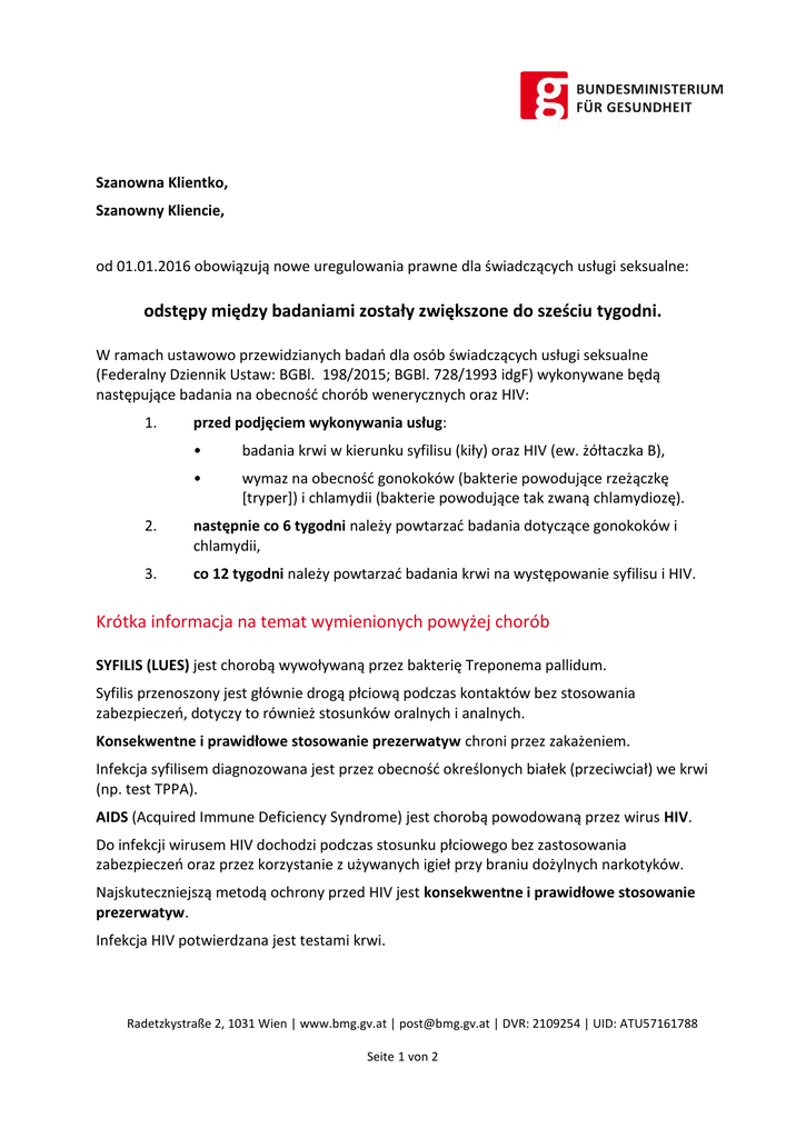 Szanowna Klientko, Szanowny Kliencie, od 01.01.2016 obowiązują nowe uregulowania prawne dla świadczących usługi seksualne: odstępy między badaniami zostały zwiększone do sześciu tygodni. W ramach ustawowo przewidzianych badań dla osób świadczących usługi seksualne (Federalny Dziennik Ustaw: BGBl. 198/2015; BGBl. 728/1993 idgF) wykonywane będą następujące badania na obecność chorób wenerycznych oraz HIV: 1. przed podjęciem wykonywania usług: • badania krwi w kierunku syfilisu (kiły) oraz HIV (ew. żółtaczka B), • wymaz na obecność gonokoków (bakterie powodujące rzeżączkę [tryper]) i chlamydii (bakterie powodujące tak zwaną chlamydiozę). 2. następnie co 6 tygodni należy powtarzać badania dotyczące gonokoków i chlamydii, 3. co 12 tygodni należy powtarzać badania krwi na występowanie syfilisu i HIV. Krótka informacja na temat wymienionych powyżej chorób SYFILIS (LUES) jest chorobą wywoływaną przez bakterię Treponema pallidum. Syfilis przenoszony jest głównie drogą płciową podczas kontaktów bez stosowania zabezpieczeń, dotyczy to również stosunków oralnych i analnych. Konsekwentne i prawidłowe stosowanie prezerwatyw chroni przez zakażeniem. Infekcja syfilisem diagnozowana jest przez obecność określonych białek (przeciwciał) we krwi (np. test TPPA). AIDS (Acquired Immune Deficiency Syndrome) jest chorobą powodowaną przez wirus HIV. Do infekcji wirusem HIV dochodzi podczas stosunku płciowego bez zastosowania zabezpieczeń oraz przez korzystanie z używanych igieł przy braniu dożylnych narkotyków. Najskuteczniejszą metodą ochrony przed HIV jest konsekwentne i prawidłowe stosowanie prezerwatyw. Infekcja HIV potwierdzana jest testami krwi. Radetzkystraße 2, 1031 Wien | www.bmg.gv.at | [email protected] | DVR: 2109254 | UID: ATU57161788 Seite 1 von 2 ŻÓŁTACZKA B jest zapaleniem wątroby wywołanym wirusem Hepatitis-B (HBV). Typową drogą przenoszenia wirusa Hepatitis B w wieku dorosłym są kontakty seksualne bez stosowania zabezpieczeń. Ochroną przed infekcją są szczepienia (podstawowe składa się z trzech szczepień częściowych, odświeżenie szczepienia po kontroli ilości przeciwciał we krwi). Infekcję HBV stwierdza się badaniem krwi. RZEŻĄCZKA (TRYPER) jest chorobą powodowaną przez bakterie o nazwie Neisseriae gonorrhoeae (gonokoki). Rzeżączka przenoszona jest prawie wyłącznie przez kontakt seksualny bez zabezpieczeń. Konsekwentne i prawidłowe stosowanie prezerwatyw chroni przez zakażeniem. U osób, u których brak jest objawów chorobowych, infekcję stwierdza się przez pobranie wymazu z gardła, cewki lub pochwy i odbytu (tak zwany test PCR). Przy występowaniu objawów możliwe jest bezpośrednie stwierdzenie bakterii w wymazie. CHLAMYDIOZA organów płciowych wywoływana jest przez bakterię Chlamydia trachomatis. Chlamydioza organów płciowych przenoszona jest drogą płciową podczas kontaktów bez stosowania zabezpieczeń. Konsekwentne i prawidłowe stosowanie prezerwatyw chroni przez zakażeniem. Chlamydiozę organów płciowych stwierdza się przez pobranie wymazu z cewki moczowej lub pochwy. WAŻNE Jeśli występują dolegliwości wskazujące na infekcję przenoszoną drogą płciową, należy niezwłocznie przyjść do kontroli, niezależnie od momentu ostatniego badania i ustawowo ustalonych odstępów między badaniami, tak by jak najszybciej postawić diagnozę i rozpocząć konieczne leczenie. Regularne badania na choroby płciowe i HIV nie zastępują wizyty kontrolnej u ginekologa i badań profilaktycznych wczesnego rozpoznawania raka szyjki macicy i piersi. Lekarz specjalista ginekolog i położnik doradza również w sprawie antykoncepcji. Zur Verfügung gestellt vom Referat für sexuelle Gesundheit und Prostitution, Gesundheitsdienst der Stadt Wien im Jänner 2016. Radetzkystraße 2, 1031 Wien | www.bmg.gv.at | [email protected] | DVR: 2109254 | UID: ATU57161788 Seite 2 von 2