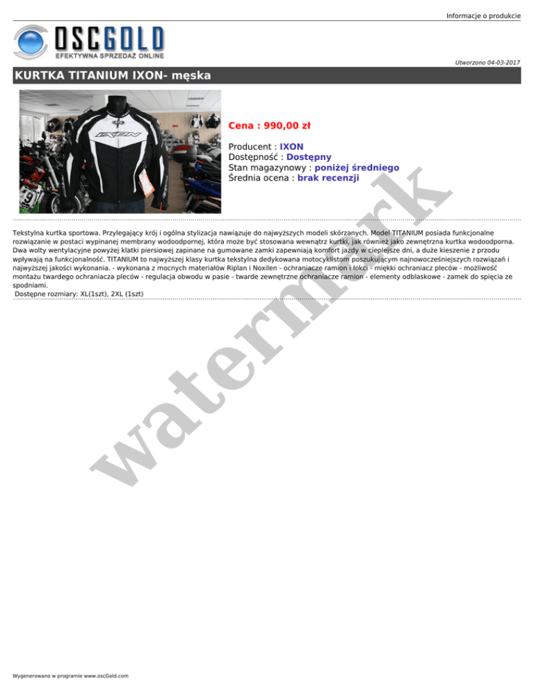 Informacje o produkcie Utworzono 04-03-2017 KURTKA TITANIUM IXON- męska Cena : 990,00 zł er m ar k Producent : IXON Dostępność : Dostępny Stan magazynowy : poniżej średniego Średnia ocena : brak recenzji w at Tekstylna kurtka sportowa. Przylegający krój i ogólna stylizacja nawiązuje do najwyższych modeli skórzanych. Model TITANIUM posiada funkcjonalne rozwiązanie w postaci wypinanej membrany wodoodpornej, która może być stosowana wewnątrz kurtki, jak również jako zewnętrzna kurtka wodoodporna. Dwa wolty wentylacyjne powyżej klatki piersiowej zapinane na gumowane zamki zapewniają komfort jazdy w cieplejsze dni, a duże kieszenie z przodu wpływają na funkcjonalność. TITANIUM to najwyższej klasy kurtka tekstylna dedykowana motocyklistom poszukującym najnowocześniejszych rozwiązań i najwyższej jakości wykonania. - wykonana z mocnych materiałów Riplan i Noxilen - ochraniacze ramion i łokci - miękki ochraniacz pleców - możliwość montażu twardego ochraniacza pleców - regulacja obwodu w pasie - twarde zewnętrzne ochraniacze ramion - elementy odblaskowe - zamek do spięcia ze spodniami. Dostępne rozmiary: XL(1szt), 2XL (1szt) Wygenerowano w programie www.oscGold.com