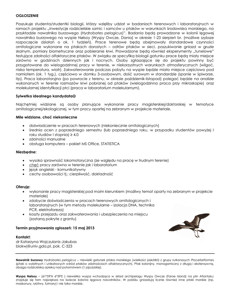 OGŁOSZENIE Poszukuje studenta/studentki biologii, którzy wzięliby udział w badaniach terenowych i laboratoryjnych w ramach projektu „Inwestycje rodzicielskie samic i samców u ptaków w warunkach środowiska morskiego, na przykładzie nawałnika burzowego (Hydrobates pelagicus)”. Badania będą prowadzone w kolonii lęgowej nawałnika burzowego na wyspie Nølsoy (Wyspy Owcze, Dania) w okresie 1-23 sierpień br. (możliwe szybsze rozpoczęcie działań o ok. 1 tydzień). Prace terenowe będą obejmowały standardowe czynności ornitologiczne wykonane na ptakach dorosłych – odłów ptaków w sieci, poszukiwanie gniazd w gruzie skalnym, pomiary biometryczne oraz pobieranie krwi. Prowadzone będą również eksperymenty „tunelowe” testujące zdolności olfaktoryczne ptaków. W związku ze specyfiką biologii gatunku prace będą miały miejsce zarówno w godzinach dziennych jak i nocnych. Osoby zgłaszające się do projektu powinny być przygotowane do wielogodzinnej pracy w terenie, w niekorzystnych warunkach atmosferycznych (wilgoć, niska temperatura, wiatr). Zakwaterowanie podczas pobytu na wyspie będzie miało miejsce częściowo pod namiotem (ok. 1 tyg.), częściowo w domku 3-osobowym, dość surowym w standardzie (spanie w śpiworze, itp). Praca laboratoryjna (po powrocie z terenu, w okresie październik-listopad) polegać będzie na analizie wykonanych w terenie rozmazów krwi pobranej od ptaków (wielogodzinna praca przy mikroskopie) oraz molekularnej identyfikacji płci (praca w laboratorium molekularnym). Sylwetka idealnego kandydata Najchętniej widziane są osoby planujące wykonanie pracy magisterskiej/doktorskiej ornitologicznej/ekologicznej, w tym pracy opartej na zebranym w projekcie materiale. w tematyce Mile widziane, choć niekonieczne doświadczenie w pracach terenowych (niekoniecznie ornitologicznych) średnia ocen z poprzedniego semestru (lub poprzedniego roku, w przypadku studentów powyżej I roku studiów I stopnia) ≥ 4.0 zdolności manualne obsługa komputera – pakiet MS Office, STATISTICA Niezbędne: wysoka sprawność lokomotoryczna (ze względu na pracę w trudnym terenie) chęć pracy zarówno w terenie jak i laboratorium język angielski - komunikatywny cechy osobowości tj.: cierpliwość, dokładność Oferuję: wykonanie pracy magisterskiej pod moim kierunkiem (możliwy temat oparty na zebranym w projekcie materiale) zdobycie doświadczenia w pracach terenowych ornitologicznych i laboratoryjnych (w tym metody molekularne – izolacja DNA, technika PCR, elektroforeza) koszty przejazdu oraz zakwaterowania i ubezpieczenia na miejscu (zostaną pokryte z grantu) Termin przyjmowania zgłoszeń: 15 maj 2013 Kontakt: dr Katarzyna Wojczulanis-Jakubas [email protected], pok. C-323 Nawałnik burzowy Hydrobates pelagicus – niewielki gatunek ptaka morskiego (wielkości jaskółki!) z grupy rurkonosych Procellariformes (ptaki o wybitnych i unikatowych wśród ptaków zdolnościach olfaktorycznych). Ptak kolonijny, monogamiczny z długą i ekstensywną, obojga rodzicielską opieką nad potomstwem (1 jajo/pisklę). Wyspa Nølsoy – (61°59′N 6°39′E ) niewielka wyspa wchodząca w skład archipelagu Wyspy Owcze (Faroe Island) na płn Atlantyku; znajduje się tam największa na świecie kolonia lęgowa nawałników. W pobliżu gniazdują licznie również inne ptaki morskie (np. maskonury, rybitwy, fulmary) i nie tylko morskie.