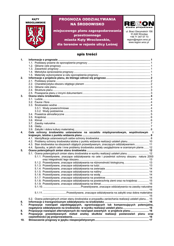 KĄTY WROCŁAWSKIE PROGNOZA ODDZIAŁYWANIA NA ŚRODOWISKO studio projektowe miejscowego planu zagospodarowania przestrzennego miasta Kąty Wrocławskie, dla terenów w rejonie ulicy Leśnej ul. Braci Gierymskich 156 51-640 Wrocław +48 71 347 57 73 [email protected] www.region.wroc.pl spis treści 1. 2. 3. 4. 5. 6. 7. 8. 9. 10. Informacje o prognozie ............................................................................................................................. 1 1.1. Podstawy prawne do sporządzenia prognozy ..................................................................................... 1 1.2. Główne cele prognozy ......................................................................................................................... 1 1.3. Zawartość prognozy ............................................................................................................................ 1 1.4. Metodyka opracowania prognozy ........................................................................................................ 1 1.5. Materiały wykorzystane w celu sporządzenia prognozy ...................................................................... 1 Informacje o projekcie planu, do którego odnosi się prognoza ............................................................ 2 2.1. Podstawy prawne ................................................................................................................................ 2 2.2. Charakterystyka obszaru objętego planem ......................................................................................... 2 2.3. Główne cele planu ............................................................................................................................... 3 2.4. Struktura planu .................................................................................................................................... 3 2.5. Powiązania planu z innymi dokumentami............................................................................................ 3 Ocena stanu środowiska........................................................................................................................... 4 3.1. Ludzie.................................................................................................................................................. 4 3.2. Fauna i flora ........................................................................................................................................ 4 3.3. Środowisko wodne .............................................................................................................................. 4 3.3.1. Wody powierzchniowe .............................................................................................................. 4 3.3.2. Wody podziemne ...................................................................................................................... 5 3.4. Powietrze atmosferyczne .................................................................................................................... 5 3.5. Krajobraz ............................................................................................................................................. 6 3.6. Klimat .................................................................................................................................................. 6 3.7. Zasoby naturalne................................................................................................................................. 7 3.8. Gleby ................................................................................................................................................... 7 3.9. Zabytki i dobra kultury materialnej ....................................................................................................... 8 Cele ochrony środowiska ustanowione na szczeblu międzynarodowym, wspólnotowym i krajowym, istotne z punktu widzenia planu ............................................................................................ 8 4.1. Identyfikacja ustanowionych celów ochrony środowiska ..................................................................... 8 4.2. Problemy ochrony środowiska istotne z punktu widzenia realizacji ustaleń planu............................. 10 4.3. Stan środowiska na obszarach objętych przewidywanym, znaczącym oddziaływaniem................... 11 4.4. Sposoby, w jakich cele i inne problemy środowiska zostały uwzględnione w ocenianym planie....... 12 Ocena potencjalnych zmian stanu środowiska .................................................................................... 12 5.1. Ocena potencjalnych zmian stanu środowiska w wyniku realizacji ustaleń planu ............................. 12 5.1.1. Przewidywane, znaczące oddziaływania na cele i przedmiot ochrony obszaru natura 2000 oraz integralność tego obszaru............................................................................................... 13 5.1.2. Przewidywane, znaczące oddziaływania na róŜnorodność biologiczną.................................. 13 5.1.3. Przewidywane, znaczące oddziaływania na ludzi................................................................... 13 5.1.4. Przewidywane, znaczące oddziaływania na zwierzęta ........................................................... 14 5.1.5. Przewidywane, znaczące oddziaływania na rośliny................................................................ 14 5.1.6. Przewidywane, znaczące oddziaływania na wodę.................................................................. 14 5.1.7. Przewidywane, znaczące oddziaływania na powietrze........................................................... 14 5.1.8. Przewidywane, znaczące oddziaływania na powierzchnię ziemi oraz na krajobraz ............... 15 5.1.9. Przewidywane, znaczące oddziaływania na klimat.....................................................