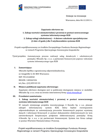 Dotacje na innowacje Warszawa, dnia 06.12.2013 r. Zapytanie ofertowe na: 1. Zakup wartości niematerialnej i prawnej w postaci nowoczesnego systemu informatycznego B2B 2. Zakup usługi szkoleniowej – 4 dniowe szkolenie specjalistyczne (4 dni x 8 godz.) dla 9 użytkowników systemu B2B Projekt współfinansowany ze środków Europejskiego Funduszu Rozwoju Regionalnego w ramach Programu Operacyjnego Innowacyjna Gospodarka Tytuł projektu: Automatyzacja procesu realizacji usług doradczych i szkoleniowych pomiędzy 4Results Sp. z o.o. a partnerami biznesowymi poprzez wdrożenie systemu informatycznego typu B2B I. Zamawiający: 4Results Spółka z ograniczoną odpowiedzialnością ul. Gżegżółki 4, 02-804 Warszawa NIP: 9512160042 REGON: 140262326 tel./fax.: (22) 859 03 33 II. Miejsce publikacji zapytania ofertowego: Zapytanie ofertowe dostępne jest w publicznie dostępnym miejscu w siedzibie 4Results Sp. z o.o. oraz na stronie internetowej firmy www.4results.pl III. Przedmiot zamówienia: 1. Zakup wartości niematerialnej i prawnej w postaci nowoczesnego systemu informatycznego B2B W ramach niniejszego projektu inwestycyjnego 4 Results Sp. z o.o. planuje zakupić informatyczny system B2B, który będzie rozwiązaniem odpowiedzialnym za automatyzację procesów biznesowych poprzez wymianę danych i informacji firmowych w postaci dokumentów elektronicznych (w tym zatwierdzonych bezpiecznym podpisem elektronicznym) pomiędzy firmą 4 Results Sp. z o.o. a jej partnerami biznesowymi. System ten firma zakupi w postaci Wartości Niematerialnej i Prawnej. Projekt współfinansowany ze środków Europejskiego Funduszu Rozwoju Regionalnego w ramach Programu Operacyjnego Innowacyjna Gospodarka Dotacje na innowacje Zakup Wartości Niematerialnej i Prawnej w postaci innowacyjnego systemu B2B pozwoli Wnioskodawcy na znaczące uproszczenie wymiany danych z partnerami, jak również umożliwi automatyzację i szybkie udostępnianie niezbędnych informacji jakie powstają w trakcie działalności operacyjnej. W ramach systemu informatycznego automatyzowane będą następujące procesy B2B: 1) Komunikacja z partnerami; 2) Ofertowanie; 3) Zawieranie umów; 4) Fakturowanie. Projekt przewiduje wdrożenie technologii podpisu elektronicznego. Podpis elektroniczny w relacjach B2B ma być wykorzystywany w następujących procesach B2B: 1) ofertowanie (oferta wystawiona na zgłoszenie zapotrzebowania na dodatkowe funkcjonalności), 2) zawieranie umów (od pierwszej umowy na opracowanie i wdrożenie systemu, po wszystkie aneksy i umowy dot. realizowanych dodatkowych prac w trakcie aktualizacji/rozbudowy systemu), 3) fakturowanie (dokonywanie rozliczenia za wykonane prace, naliczanie kosztów obsługi projektów). Planowany do zakupu system B2B ma być rozwiązaniem o budowie modułowej, dzięki czemu w zależności od potrzeb będzie mógł być indywidualnie dopasowywany do specyfiki działalności firmy. System oparty ma być na zarządzaniu obiegiem dokumentów i spraw. System B2B posiadać ma moduł usprawniający współpracę między partnerami oraz elementy Business Intelligence. System B2B musi posiadać następujące główne funkcjonalności: - obieg faktur i innych dokumentów finansowych (dzięki wprowadzeniu formalnych ścieżek przetwarzania dokumentów finansowych każdy dokument przejdzie właściwe dla niego etapy oceny merytorycznej, akceptacji i księgowania; dzięki scentralizowanemu przetwarzaniu wszystkich dokumentów system może stać się podstawą dla mechanizmu kontrolingu finansowego i procesów konsolidacji budżetów); - wsparcie systemów jakości (systemy wspierania jakości cechują się daleko idącą formalizacją procedur, za czym idzie konieczność kontroli przepływu dokumentów, elektroniczny system zarządzania obiegiem dokumentów umożliwi automatyzację procesów oraz zredukuje uciążliwe manualne czynności związane z zarządzaniem dokumentacją); Projekt współfinansowany ze środków Europejskiego Funduszu Rozwoju Regionalnego w ramach Programu Operacyjnego Innowacyjna Gospodarka Dotacje na innowacje - zarządzanie kontaktami z klientami (formalizacja procesów związanych z przetwarzaniem zapytań ofertowych, projektowaniem ofert i umów, programów szkoleń, harmonogramów) może przyczynić się do podniesienia jakości obsługi klienta. W automatyczny sposób w systemie gromadzona będzie historia kontaktów i wszystkich pozyskanych informacji, co pozwoli na lepsze planowanie dalszych działań). System B2B musi posiadać następujące funkcjonalności szczegółowe: - możliwość wprowadzenia pełnych danych o partnerach biznesowych (nadawanie kategorii wg określonych kryteriów, historia współpracy, tworzenie szablonów dokumentów dla klienta); - przypisanie osób odpowiedzialnych za określone zadania realizowane z partnerem i dla partnera biznesowego; - możliwość tworzenia i wysyłania zindywidualizowanej korespondencji seryjnej z elementami graficznymi do partnera oraz jej odbioru (zapis w historii konkretnego partnera biznesowego); - planowanie czynności, robienie notatek z rozmowy w systemie, tworzenie zadań do zrealizowania przez Wnioskodawcę/partnera niezbędnych do realizacji usługi szkoleniowej; - rejestracja zapytań ofertowych wraz z kluczowymi parametrami (ilość uczestników, grup szkoleniowych, przewidywany termin szkolenia, rodzaj szkoleń, data zapytania itp.); - przygotowanie oferty (zaplanowanie czynności zw. z przygotowaniem oferty, tworzenie oferty w systemie, w określonym layoucie graficznym, dołączanie z bazy kolejnych modułów oferty dot. danego szkolenia: opis programu, program szkolenia, CV trenera, wycena szkolenia, możliwość edycji oferty przed wysłaniem); - rejestracja wysłanej oferty (oferta zapisuje się w zestawieniu wysłanych ofert wraz z kluczowymi parametrami - ilość dni szkoleniowych, cena jednego dnia, cena łącznie, data wysłania, osoba wysyłająca); - możliwość zarządzania ofertami w pr