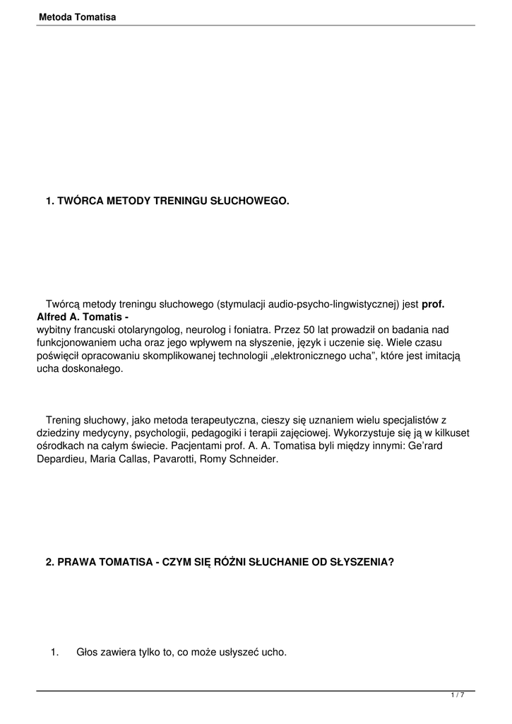 Metoda Tomatisa 1. TWÓRCA METODY TRENINGU SŁUCHOWEGO. Twórcą metody treningu słuchowego (stymulacji audio-psycho-lingwistycznej) jest prof. Alfred A. Tomatis wybitny francuski otolaryngolog, neurolog i foniatra. Przez 50 lat prowadził on badania nad funkcjonowaniem ucha oraz jego wpływem na słyszenie, język i uczenie się. Wiele czasu poświęcił opracowaniu skomplikowanej technologii „elektronicznego ucha”, które jest imitacją ucha doskonałego. Trening słuchowy, jako metoda terapeutyczna, cieszy się uznaniem wielu specjalistów z dziedziny medycyny, psychologii, pedagogiki i terapii zajęciowej. Wykorzystuje się ją w kilkuset ośrodkach na całym świecie. Pacjentami prof. A. A. Tomatisa byli między innymi: Ge’rard Depardieu, Maria Callas, Pavarotti, Romy Schneider. 2. PRAWA TOMATISA - CZYM SIĘ RÓŻNI SŁUCHANIE OD SŁYSZENIA? 1. Głos zawiera tylko to, co może usłyszeć ucho. 1/7 Metoda Tomatisa 2. Jeżeli uszkodzonemu uchu umożliwi się ponownie prawidłowe słyszenie utraconych lub stłumionych częstotliwości natychmiast zostają one w sposób nieświadomy zrekonstruowane w emitowanym głosie. 3. Odpowiednia stymulacja słuchowa spowoduje trwałą poprawę zdolności słuchania i w konsekwencji polepszenie odtwarzania dźwięku. Profesor A. A. Tomatis wyodrębnił słyszenie i słuchanie jako dwa odrębne procesy. Słyszenie jest procesem biernym, a słuchanie aktywnym. Kiedy się zamyślimy nie słuchamy, tylko słyszymy. Odbieranie bodźców słuchowych odbywa się wówczas poza naszą świadomością. Nie analizujemy świadomie docierających do nas komunikatów. Słuchanie wymaga zaś skupienia i zaangażowania. Trudności ze słuchaniem powodują problemy, między innymi, z koncentracją uwagi, mową i czytaniem. Na słuchanie składa się nie tylko zdolność przyswajania informacji z otoczenia, ale także umiejętność ich filtrowania, czyli eliminacji tych bodźców, które są dla nas w danej chwili zbędne i nieistotne. Tak przefiltrowaną informację mózg może przetworzyć i posegregować. Zdolność tą określamy mianem uwagi słuchowej. Gdy jest ona zaburzona dziecko postrzegane jest jako niegrzeczne, a nawet agresywne. Jego zachowanie nie wynika ze złej woli. Jest efektem braku umiejętności radzenia sobie z natłokiem docierających do niego w każdej chwili bodźców z otoczenia. Możemy dobrze słyszeć (wskazują na to badania audiologiczne), a jednocześnie mieć problemy z syntezą i analizą słyszanych dźwięków oraz trudności ze skojarzeniem znaków graficznych z odpowiednimi dźwiękami, co ma szczególne znaczenie w procesach poprawnego czytania i pisania. Odbudowanie świadomej potrzeby słuchania jest kluczem do odtworzenia komunikacji, a co za tym idzie potrzeby mówienia. Prof. A.A.Tomatis wykazał, że aby wytworzyć dźwięk, musimy go najpierw usłyszeć. Odkrycie tzw. "efektu Tomatisa", tj. zasady mówiącej, że możemy powiedzieć tylko to, co może usłyszeć ucho oraz, że modyfikacja słyszenia prowadzi do zmian w głosie zostało ogłoszone przez Francuską Akademię Nauk Ścisłych i Medycyny oraz stało się podwaliną nowej interdyscyplinarnej nauki zwanej audio-psycho-fonologią. 2/7 Metoda Tomatisa 3. DLA KOGO METODA JEST PRZEZNACZONA Metoda treningu słuchowego przeznaczona jest dla : Dzieci z problemami szkolnymi: zaburzeniami pamięci, uwagi, koncentracji, dysleksją, dysortografią, trudnościami w czytaniu, nauce języków obcych. Dzieci 6-7 letnich niedojrzałych emocjonalnie i społecznie do rozpoczęcia nauki szkolnej. Dzieci i młodzieży autystycznej, z nadpobudliwością psychoruchową (ADHD), zespołem Downa, mózgowym porażeniem dziecięcym, wcześniaków. Dzieci i młodzieży z zaburzoną koordynacją i integracją sensomotoryczną (zaburzenia integracji sensorycznej). Osób chcących doskonalić swój potencjał. Osób z opóźnionym lub nieprawidłowym rozwojem mowy (również dorosłych). Dzieci, młodzieży i dorosłych z problemami emocjonalnymi, żyjących w stresie, mających trudności w kontaktach społecznych. Dorosłych z zaburzeniami głosu spowodowanymi jego niewłaściwym używaniem (nauczyciele, śpiewacy, lektorzy, aktorzy) Osób uczących się języków, jako przygotowanie ucha do nauki języków obcych . 4. NA CZYM POLEGA METODA TRENINGU SŁUCHOWEGO? Trening słuchowy według metody prof. A.A. Tomatisa polega na słuchaniu odpowiednio przetworzonych dźwięków, w ściśle określonym czasie, przy ustawieniu odpowiednich parametrów. Specjalistyczne urządzenie zwane „elektronicznym uchem”, jako idealny model ucha ludzkiego, umożliwia stworzenie odpowiednich warunków terapeutycznych. Mięśnie ucha środkowego przez dwie godziny dziennie są zmuszane do ciągłej pracy, co w warunkach 3/7 Metoda Tomatisa naturalnych nie jest możliwe. Prowadzi to do zwiększenia zdolności i precyzyjności analizy dźwięku. Umożliwia również pooprawę zdolności radzenia sobie z natłokiem bodźców słuchowych na które jesteśmy narażeni każdego dnia (zmniejsza się lub eliminuje nadwrażliwość słuchowa). Prof .A.A. Tomatis wiele czasu poświęcił wybraniu odpowiedniej muzyki, która umożliwiłaby realizację założeń metody. Podczas terapii centrum procesów myślenia – kora mózgowa (CUN) – stymulowane jest przez odpowiednio dobrane dźwięki o określonej i zróżnicowanej częstotliwości. W ykorzystuje się między innymi dźwięki mające dużo wysokich częstotliwości, które są szczególnie korzystne dla ludzkiego organizmu. Takie kryterium spełnia przede wszystkim muzyka Mozarta. Wykorzystywane są również chorały gregoriańskie, walce oraz filtrowany głos matki. Efekt Tomatisa : - powoduje gimnastykę ucha, wzbudza pragnienie komunikacji, ogranicza lęki i stres. 5. PROCES DIAGNOZY Trening uwagi słuchowej poprzedzony jest szczegółową diagnozą określającą rodzaj i zakres problemów dziecka. Składa się na nią: 4/7 Metoda Tomatisa 1. Wy