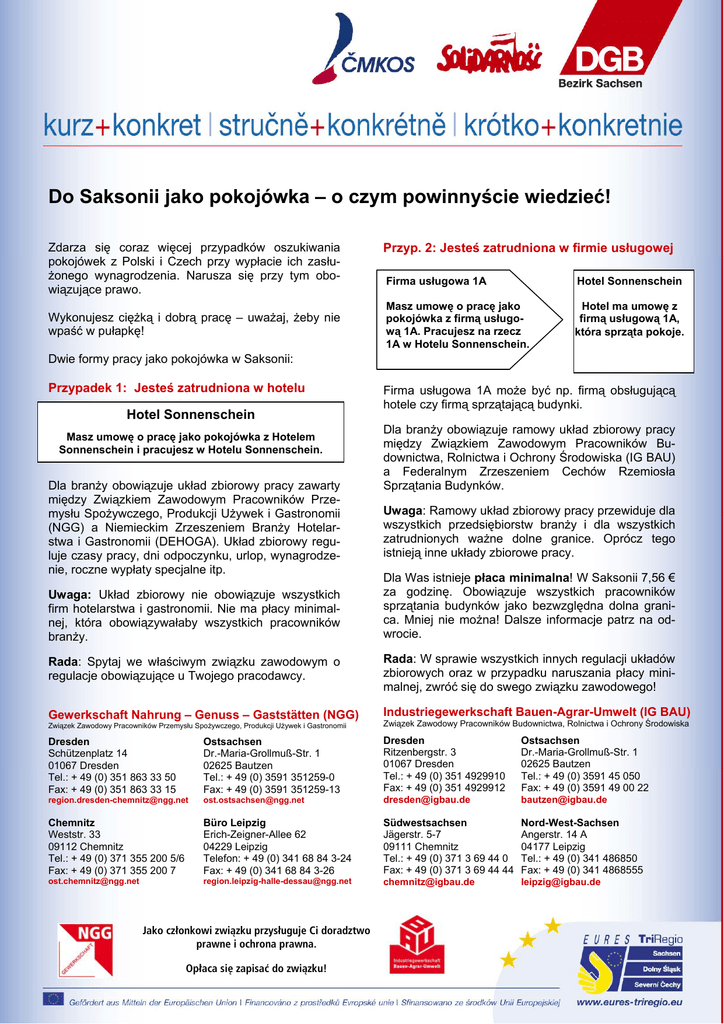 Do Saksonii jako pokojówka – o czym powinnyście wiedzieć! Zdarza się coraz więcej przypadków oszukiwania pokojówek z Polski i Czech przy wypłacie ich zasłużonego wynagrodzenia. Narusza się przy tym obowiązujące prawo. Wykonujesz ciężką i dobrą pracę – uważaj, żeby nie wpaść w pułapkę! Przyp. 2: Jesteś zatrudniona w firmie usługowej Firma usługowa 1A Hotel Sonnenschein Masz umowę o pracę jako pokojówka z firmą usługową 1A. Pracujesz na rzecz 1A w Hotelu Sonnenschein. Hotel ma umowę z firmą usługową 1A, która sprząta pokoje. Dwie formy pracy jako pokojówka w Saksonii: Przypadek 1: Jesteś zatrudniona w hotelu Hotel Sonnenschein Masz umowę o pracę jako pokojówka z Hotelem Sonnenschein i pracujesz w Hotelu Sonnenschein. Dla branży obowiązuje układ zbiorowy pracy zawarty między Związkiem Zawodowym Pracowników Przemysłu Spożywczego, Produkcji Używek i Gastronomii (NGG) a Niemieckim Zrzeszeniem Branży Hotelarstwa i Gastronomii (DEHOGA). Układ zbiorowy reguluje czasy pracy, dni odpoczynku, urlop, wynagrodzenie, roczne wypłaty specjalne itp. Uwaga: Układ zbiorowy nie obowiązuje wszystkich firm hotelarstwa i gastronomii. Nie ma płacy minimalnej, która obowiązywałaby wszystkich pracowników branży. Firma usługowa 1A może być np. firmą obsługującą hotele czy firmą sprzątającą budynki. Dla branży obowiązuje ramowy układ zbiorowy pracy między Związkiem Zawodowym Pracowników Budownictwa, Rolnictwa i Ochrony Środowiska (IG BAU) a Federalnym Zrzeszeniem Cechów Rzemiosła Sprzątania Budynków. Uwaga: Ramowy układ zbiorowy pracy przewiduje dla wszystkich przedsiębiorstw branży i dla wszystkich zatrudnionych ważne dolne granice. Oprócz tego istnieją inne układy zbiorowe pracy. Dla Was istnieje płaca minimalna! W Saksonii 7,56 € za godzinę. Obowiązuje wszystkich pracowników sprzątania budynków jako bezwzględna dolna granica. Mniej nie można! Dalsze informacje patrz na odwrocie. Rada: Spytaj we właściwym związku zawodowym o regulacje obowiązujące u Twojego pracodawcy. Rada: W sprawie wszystkich innych regulacji układów zbiorowych oraz w przypadku naruszania płacy minimalnej, zwróć się do swego związku zawodowego! Gewerkschaft Nahrung – Genuss – Gaststätten (NGG) Industriegewerkschaft Bauen-Agrar-Umwelt (IG BAU) Związek Zawodowy Pracowników Przemysłu Spożywczego, Produkcji Używek i Gastronomii Związek Zawodowy Pracowników Budownictwa, Rolnictwa i Ochrony Środowiska Dresden Schützenplatz 14 01067 Dresden Tel.: + 49 (0) 351 863 33 50 Fax: + 49 (0) 351 863 33 15 Ostsachsen Dr.-Maria-Grollmuß-Str. 1 02625 Bautzen Tel.: + 49 (0) 3591 351259-0 Fax: + 49 (0) 3591 351259-13 Dresden Ritzenbergstr. 3 01067 Dresden Tel.: + 49 (0) 351 4929910 Fax: + 49 (0) 351 4929912 Ostsachsen Dr.-Maria-Grollmuß-Str. 1 02625 Bautzen Tel.: + 49 (0) 3591 45 050 Fax: + 49 (0) 3591 49 00 22 [email protected] [email protected] [email protected] [email protected] Chemnitz Weststr. 33 09112 Chemnitz Tel.: + 49 (0) 371 355 200 5/6 Fax: + 49 (0) 371 355 200 7 Büro Leipzig Erich-Zeigner-Allee 62 04229 Leipzig Telefon: + 49 (0) 341 68 84 3-24 Fax: + 49 (0) 341 68 84 3-26 Südwestsachsen Jägerstr. 5-7 09111 Chemnitz Tel.: + 49 (0) 371 3 69 44 0 Fax: + 49 (0) 371 3 69 44 44 Nord-West-Sachsen Angerstr. 14 A 04177 Leipzig Tel.: + 49 (0) 341 486850 Fax: + 49 (0) 341 4868555 [email protected] [email protected] [email protected] [email protected] Jako członkowi związku przysługuje Ci doradztwo prawne i ochrona prawna. Opłaca się zapisać do związku! Czy można obliczać wynagrodzenie na podstawie liczby posprzątanych pokoi? W umowie o pracę uzgadnia się wynagrodzenie za godzinę. W Saksonii musi ono wynosić co najmniej 7,56 €. Jednak często istnieje zapis, że stawka godzinowa bazuje na tak zwanej normalnej wydajności (Normalleistung). Co to jest normalna wydajność? Normalna wydajność określa, ile pokoi trzeba posprzątać w ciągu godziny. Informacje o liczbie pokoi stanowią często załącznik do umowy o pracę. Liczba ta jest różna w zależności od miejsca pracy, czyli w zależności od hotelu. Pracodawca może jako normalną wydajność podać liczbę pokoi na godzinę. Przykład: Normalna wydajność w liczbie pokoi na godzinę: 3 ¾ Jeżeli robisz więcej niż 3 pokoje, otrzymujesz dodatkowe wynagrodzenie. ¾ Jeżeli robisz dokładnie 3 pokoje, otrzymujesz uzgodnioną stawkę godzinową. ¾ Jeżeli robisz mniej niż 3 pokoje, pracodawca obetnie Ci stawkę godzinową. Normalna wydajność jest zazwyczaj tak wyśrubowana, że jest nie do osiągnięcia. Uwaga: Pracodawca nie może płacić mniej, niż płaca minimalna w wysokości 7,56 € za godzinę. Jak mogę kontrolować przestrzeganie przepisów? Sprawdź swoje rozliczenie wynagrodzenia. Pracodawca zobowiązany jest do podania Ci na rozliczeniu dokładnego pisemnego zestawienia wynagrodzenia łącznego, godzinowego, dodatków i potrąceń. Rozliczenie musi nastąpić najpóźniej do 15. dnia kolejnego miesiąca. Jak niektóre firmy próbują się wykręcić? Twierdzą, że praca pokojówki w większości nie polega na sprzątaniu, tylko np. na uzupełnianiu minibaru. Dlatego rzekomo nie muszą przestrzegać płacy minimalnej branży sprzątania budynków. To nieprawda! Co mówią pracodawcy i związki zawodowe? Przedstawiciele branży sprzątania budynków: pracodawcy i związki zawodowe są zgodni: trzeba koniecznie przestrzegać płac minimalnych. Urząd Celny kontroluje przestrzeganie płac minimalnych w Niemczech. Czy płaca minimalna obowiązuje też w przypadku tzw. miniprac (minijobs)? Tak, płacę minimalną w wysokości 7,56 € w Saksonii należy stosować także w przypadku minijobs. Jak mogę dochodzić swych prac? Ważne jest, by dokumentować swą pracę i dochodzić swych praw. Jako pracownik musisz działać: - zapisuj przepracowane godziny i jak tylko możliwe daj pracodawcy ten dokument do podpisu, na rozliczeniu wynagrodzeni