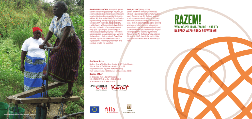 One World Action (OWA) jest organizacją społeczeństwa obywatelskiego założoną w 1989 roku, by podejmować współpracę z organizacjami i koalicjami organizacji kobiet z obszarów wiejskich i miejskich w Afryce, Azji, Ameryce Łacińskiej i Europie Środkowej i Wschodniej. Dostrzegamy przyczyny ubóstwa i związanej z tym bezsilności, dlatego pracujemy z najuboższymi i wykluczonymi po to, by zyskali oni głos, siłę i możliwości, które pozwolą im zmienić swoje życie. Zajmujemy się problematyką praw kobiet, zarządzania partycypacyjnego i wykluczenia społecznego przez budowanie potencjału, tworzenie sieci współpracy i sieci rzeczniczych. Prowadzimy w Wielkiej Brytanii i Europie kampanie kwestionujące założenia polityk międzynarodowych, które powodują, że ludzie żyją w ubóstwie. Koalicja KARAT (główny partner): Od 1997 roku KARAT funkcjonuje jako koalicja kobiecych organizacji pozarządowych z Europy Środkowej i Wschodniej oraz Azji Centralnej mających na celu zapewnienie równości płci przez monitorowanie realizacji międzynarodowych umów i polityk. KARAT działa na rzecz przestrzegania praw człowieka w stosunku do kobiet, społecznej i ekonomicznej sprawiedliwości oraz współpracy rozwojowej opartej na równouprawnieniu płci, ze szczególnym uwzględnieniem perspektywy krajów Europy ŚrodkowoWschodniej oraz Azji Centralnej. W ciągu ostatnich dziesięciu lat KARAT stworzył silną koalicję, która skupia obecnie około 60 członków, w tym 58 organizacji. One World Action Bradleys Close, White Lion Street, London N1 9PF United Kingdom Tel: + 44 (0)20 7833 4075, Fax: + 44 (0)20 7833 4102 [email protected] ; www.oneworldaction.org Charity registration number: 1022298; Company registration number: 2822893 Koalicja KARAT ul. Rakowiecka 39A/14, 02-521 Warszawa Tel. +48 22 849 16 47, tel./fax +48 22 628 20 03 [email protected] ; www.karat.org Członkini wspólnoty rolniczej, Women for Change , Zambia 2010 RAZEM! WSCHÓD/POŁUDNIE/ZACHÓD – KOBIETY NA RZECZ WSPÓŁPRACY ROZWOJOWEJ „UE uznaje równość płci jako prawo i uznaje zarazem, że jest ona zarówno celem rozwoju, jak i fundamentem walki z ubóstwem. UE powinna zapewnić systematyczne wdrażanie zobowiązań podjętych w ramach polityki równości płci, a także wykazać wolę polityczną i objąć przywództwo w stałej walce o równość płci oraz wzmocnienie pozycji kobiet i dziewcząt”. KOBIETY W RAMACH OGÓLNOEUROPEJSKIEJ WSPÓŁPRACY NA RZECZ POMOCY ROZWOJOWEJ OPARTEJ NA RÓWNOUPRAWNIENIU PŁCI. (CONCORD, 2009) Koalicja kobiet żyjących z HIV/AIDS. Malawi 2008 (Fot. Tara Brace- John) Równość płci na rzecz sprawiedliwego rozwoju W ciągu ostatnich 30. lat aktywistki i aktywiści działający na rzecz praw kobiet podejmowali starania o uznanie równości płci za nieodłączną część strategii rozwoju. W Unii Europejskiej (UE) działania te doprowadziły do przyjęcia znaczących zobowiązań, łącznie z uznaniem „Praw kobiet i równouprawnienia płci” za jedną z pięciu kluczowych zasad Europejskiego Konsensusu Rozwoju. Czechy, Polska i Słowacja przystąpiły do Unii Europejskiej w 2004 roku, podpisując te same zobowiązania na rzecz równości płci oraz rozwoju, co Bułgaria i Rumunia w 2007. Pomimo stopniowego realizowania strategii rozwoju, w Europie widać duże zróżnicowanie jeśli chodzi o wdrażanie jej założeń, zwłaszcza w zakresie równości płci i praw kobiet. Wynika to zarówno z braku dostatecznej woli politycznej, z ograniczonej znajomości problematyki równości płci, jak i z systemu alokacji zasobów oraz niespójnej polityki współpracy rozwojowej. W nowych państwach członkowskich wyzwania przy wdrażaniu tej strategii są jeszcze większe, ze względu na ograniczone doświadczenia i wiedzę w tym zakresie. Projekt „Razem!” ma być katalizatorem i zapełniać lukę pomiędzy założeniami polityki rozwojowej a praktyką ich wdrażania na poziomie Unii Europejskiej. O projekcie: Razem! Wschód/Południe/Zachód – Kobiety na rzecz współpracy rozwojowej „Razem!” to nowatorska inicjatywa mająca na celu wspieranie organizacji kobiecych i innych organizacji pozarządowych w Bułgarii, Czechach, Polsce, Rumunii i na Słowacji, aby mogły one skutecznie wpływać na rządy tych państw po to, by w programach współpracy rozwojowej państwa te w pełni wdrożyły politykę UE w zakresie równości płci i równouprawnienia kobiet. Celem projektu jest budowanie współpracy między organizacjami kobiecymi (a zarazem partnerkami One World Action) z Afryki Wschodniej i organizacjami kobiecymi z nowych państw członkowskich UE. Współpraca daje okazję do poznania podobnych doświadczeń i uczenia się na podstawie różnic, co przyczyni się do lepszego zrozumienia różnorodnych wyzwań i sukcesów w walce o prawa kobiet. Patrząc szerzej, działania projektu zmierzają do konsolidacji i rozwoju nowych Południowo-Wschodnio-Zachodnich perspektyw w obszarze praw kobiet, równouprawnienia płci oraz polityki rozwojowej. „Razem!” to trzyletni projekt współfinansowany przez Komisję Europejską. Działania koordynowane są wspólnie przez One World Action z Wielkiej Brytanii oraz Koalicję KARAT – koalicję organizacji kobiecych z Europy Środkowej i Wschodniej oraz Azji Central- nej z siedzibą w Polsce. W projekcie biorą udział następujące organizacje członkowskie KARATu: • AUR - The National Association of Human Resources Specialists, Rumunia • Gender, Education, Research and Technologies (GERT), Bułgaria • Gender Studies and the Association for Equal Opportunities, Czechy • Slovak Centre for Communication and Development, Słowacja Cele projektu Projekt ma na celu zbudowanie silnego, obejmującego całą UE poparcia na rzecz optymalnej współpracy rozwojowej opartej na zasadzie równouprawnienia płci. W ramach projektu chcemy zwłaszcza: • Budować potencjał organizacji kobiecych i organizacji pozarządo