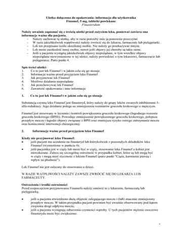 Ulotka dołączona do opakowania: informacja dla użytkownika Finamef, 5 mg, tabletki powlekane Finasteridum Należy uważnie zapoznać się z treścią ulotki przed zażyciem leku, ponieważ zawiera ona informacje ważne dla pacjenta. - Należy zachować tę ulotkę, aby w razie potrzeby móc ją ponownie przeczytać. - W razie jakichkolwiek wątpliwości należy zwrócić się do lekarza, farmaceuty lub pielęgniarki. - Lek ten przepisano ściśle określonej osobie. Nie należy go przekazywać innym. - Lek może zaszkodzić innej osobie, nawet jeśli objawy jej choroby są takie same. - Jeśli u pacjenta wystąpią jakiekolwiek objawy niepożądane, w tym wszelkie objawy niepożądane niewymienione w tej ulotce, należy powiedzieć o tym lekarzowi, farmaceucie lub pielęgniarce. Patrz punkt 4. Spis treści ulotki: 1. Co to jest lek Finamef i w jakim celu się go stosuje 2. Informacje ważne przed przyjęciem leku Finamef 3. Jak przyjmować lek Finamef 4. Możliwe działania niepożądane 5. Jak przechowywać lek Finamef 6. Zawartość opakowania i inne informacje 1. Co to jest lek Finamef i w jakim celu się go stosuje Substancją czynną leku Finamef jest finasteryd, który należy do grupy leków zwanych inhibitorami 5alfa-reduktazy. Jego działanie polega na zmniejszeniu rozmiarów gruczołu krokowego u mężczyzn. Finamef jest stosowany w leczeniu i kontroli powiększenia gruczołu krokowego (łagodnego rozrostu gruczołu krokowego (BPH)). Powoduje zmniejszenie powiększonego gruczołu krokowego, polepsza przepływ moczu i łagodzi objawy związane z BPH oraz zmniejsza ryzyko ostrego zatrzymania moczu oraz konieczność interwencji chirurgicznej. 2. Informacje ważne przed przyjęciem leku Finamef Kiedy nie przyjmować leku Finamef: jeśli pacjent ma uczulenie na finasteryd lub którykolwiek z pozostałych składników leku Finamef (wymienione w punkcie 6). jeśli pacjentka jest w ciąży lub może być w ciąży, stosowanie leku Finamef u kobiet jest niewskazane. Zaleca się szczególną ostrożność w przypadku kobiet, które są lub mogą być w ciąży i mogą mieć styczność z lekiem Finamef (patrz punkt "Ciąża, karmienie piersią i wpływ na płodność"). Lek Finamef nie jest zalecany do stosowania u dzieci. W RAZIE WĄTPLIWOŚCI NALEŻY ZAWSZE ZWRÓCIĆ SIĘ DO LEKARZA LUB FARMACEUTY. Ostrzeżenia i środki ostrożności Przed rozpoczęciem przyjmowania Finamefu należy omówić to z lekarzem, farmaceutą lub pielęgniarką. jeśli u pacjenta stwierdzono dużą objętość zalegającego moczu i (lub) znacznie zmniejszony przepływ moczu. W takim przypadku pacjent powinien być uważnie obserwowany pod kątem zwężenia drogi odpływu moczu; jeśli u pacjenta występują zaburzenia czynności wątroby. U tych pacjentów stężenie osoczowe finasterydu może być zwiększone; 1 jeśli partnerka seksualna jest w ciąży lub może być w ciąży, należy unikać narażenia jej na nasienie, które może zawierać niewielkie ilości leku. Należy niezwłocznie poinformować lekarza w razie stwierdzenia zmian w tkance piersiowej, takich jak guzki, ból lub wydzielina z sutka, jako że mogą to być objawy poważnego stanu jakim jest rak piersi. Przed zastosowaniem leku Finamef oraz w trakcie trwania leczenia pacjent powinien być poddawany badaniu podmiotowemu i przedmiotowemu (w tym badaniu per rectum) oraz powinien mieć wykonane oznaczenie w surowicy stężenia swoistego antygenu sterczowego (ang. PSA). Lek Finamef a inne leki Nie stwierdzono istotnych klinicznie interakcji. Należy powiedzieć lekarzowi lub farmaceucie o wszystkich lekach przyjmowanych przez pacjenta obecnie lub ostatnio, a także o lekach, które pacjent planuje przyjmować. Ciąża, karmienie piersią i wpływ na płodność Lek Finamef przeznaczony jest wyłącznie dla mężczyzn. Jeśli pacjentka jest w ciąży lub może być w ciąży nie może dotykać rozkruszonych lub przełamanych tabletek leku Finamef. Jeśli u kobiety w ciąży z płodem płci męskiej nastąpiło wchłonięcie finasterydu przez skórę lub kobieta przyjęła finasteryd doustnie, istnieje ryzyko, że dziecko urodzi się ze zdeformowanymi narządami płciowymi. Tabletki leku Finamef są powlekane, dzięki czemu nie ma kontaktu z substancją czynną, chyba że dojdzie do przełamania lub rozkruszenia tabletki. Jeśli partnerka seksualna pacjenta jest lub może być w ciąży, należy unikać narażania jej na kontakt z nasieniem (np. poprzez używanie prezerwatywy) lub zaprzestać przyjmowania finasterydu. Prowadzenie pojazdów i obsługiwanie maszyn Brak danych wskazujących na wpływ leku Finamef na zdolność prowadzenia pojazdów i obsługiwania maszyn. Lek Finamef zawiera laktozę jednowodną Ten lek zawiera laktozę jednowodną. Jeżeli stwierdzono wcześniej u pacjenta nietolerancję niektórych cukrów, pacjent powinien skontaktować się z lekarzem przed przyjęciem leku. 3. Jak przyjmować lek Fianmef Ten lek należy zawsze przyjmować zgodnie z zaleceniami lekarza lub farmaceuty. W razie wątpliwości należy zwrócić się do lekarza lub farmaceuty. Zalecana dawka leku to 1 tabletka na dobę (co odpowiada dawce 5 mg finasterydu). Tabletki powlekane można przyjmować z posiłkiem lub bez. Tabletki powlekane należy połykać w całości, nie należy ich dzielić ani rozkruszać. Pomimo możliwości wystąpienia szybkiej poprawy klinicznej, w celu należytej oceny skuteczności leczenia, przyjmowanie leku należy kontynuować przez okres co najmniej 6 miesięcy. Lekarz udzieli informacji jak długo należy stosować lek Finamef. Nie należy samemu wcześniej przerywać leczenia, ponieważ objawy choroby mogą powrócić. Zaburzenia czynności wątroby 2 Brak doświadczenia w stosowaniu leku Finamef u pacjentów z zaburzeniami czynności wątroby (patrz także punkt „Ostrzeżenia i środki ostrożności”). Zaburzenia czynności nerek Nie jest konieczne dostosowywanie dawkowania. Jak dotąd nie prowadzono badań dot
