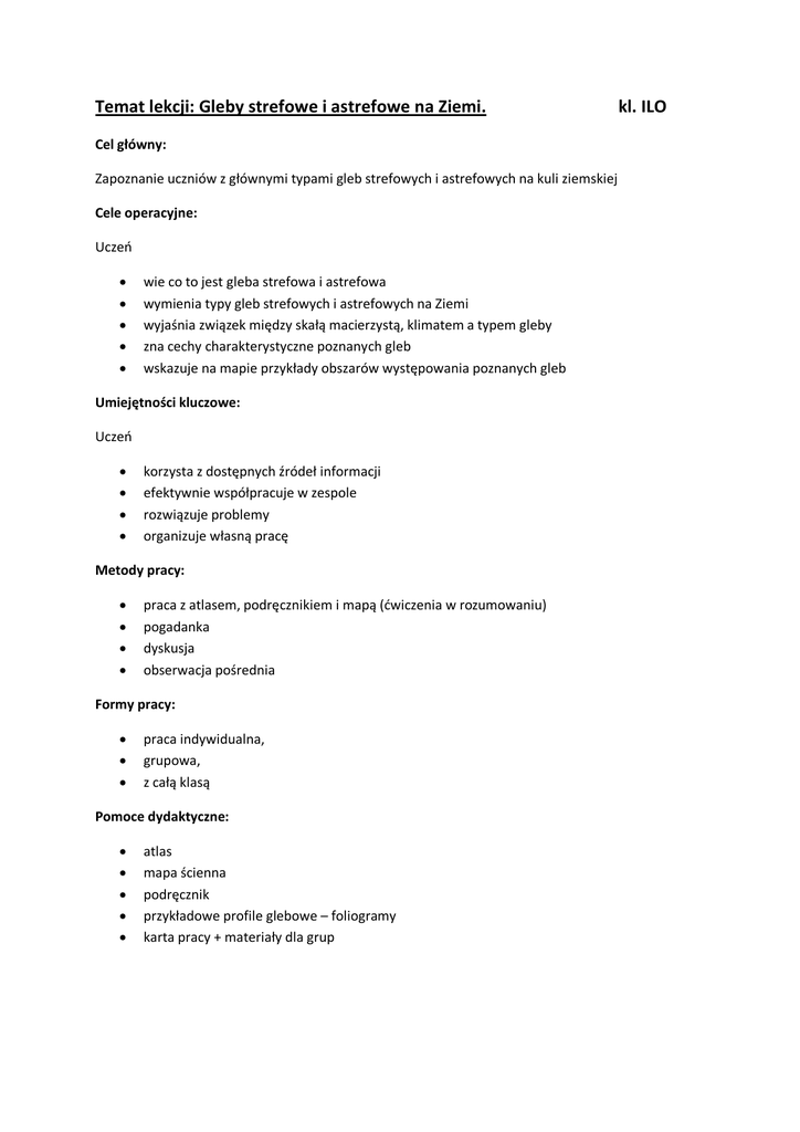 Temat lekcji: Gleby strefowe i astrefowe na Ziemi. Cel główny: Zapoznanie uczniów z głównymi typami gleb strefowych i astrefowych na kuli ziemskiej Cele operacyjne: Uczeń wie co to jest gleba strefowa i astrefowa wymienia typy gleb strefowych i astrefowych na Ziemi wyjaśnia związek między skałą macierzystą, klimatem a typem gleby zna cechy charakterystyczne poznanych gleb wskazuje na mapie przykłady obszarów występowania poznanych gleb Umiejętności kluczowe: Uczeń korzysta z dostępnych źródeł informacji efektywnie współpracuje w zespole rozwiązuje problemy organizuje własną pracę Metody pracy: praca z atlasem, podręcznikiem i mapą (ćwiczenia w rozumowaniu) pogadanka dyskusja obserwacja pośrednia Formy pracy: praca indywidualna, grupowa, z całą klasą Pomoce dydaktyczne: atlas mapa ścienna podręcznik przykładowe profile glebowe – foliogramy karta pracy + materiały dla grup kl. ILO Zarys przebiegu lekcji 1. Czynności organizacyjne 2. Podanie tematu lekcji i przedstawienie celów lekcji 3. Przypomnienie pojęć gleba i proces glebotwórczy 4. Praca z atlasem - przypomnienie stref klimatycznych na kuli ziemskiej, dopasowanie typów gleb dla każdej z podanych stref 5. Praca z atlasem - typy gleb w Polsce (charakterystyczne dla naszej strefy klimatycznej i inne) 6. Praca w grupach z wykorzystaniem podręcznika, atlasu i podanych materiałów – wypełnienie karty pracy 7. Omówienie pracy grup (przez przedstawiciela grupy) z wykorzystaniem foliogramów z profilami glebowymi różnych typów gleb 8. Ocena pracy grup (co zostało omówione w sposób wyczerpujący, co można uzupełnić, pytania do grupy…) 9. Podsumowanie lekcji (z uwzględnieniem czynników powodujących degradacje gleb) 10. Praca domowa (skserowane zadania do wklejenia do zeszytu) ---------------------------------------------------------------------------------------------------------------- KARTA PRACY DLA GRUP 1. Uzupełnij tabelę na podstawie informacji zawartych w podręczniku, atlasie, oraz w podanych materiałach: Typ gleby Skała macierzysta Strefa klimatyczna, w której występuje Przykład obszaru występowania gleby Żyzność gleby Czerwonoziemy /KAŻDA GRUPA MA INNY TYP GLEB DO OPRACOWANIA/ 2. Znajdź w podręczniku właściwy danym glebom profil i przygotuj się do jego omówienia. 3. Wpisz numer rozpoznanego na foliogramie profilu glebowego na mapie konturowej świata w miejscu występowania gleby. Wskaż to miejsce na mapie fizycznej świata, określ wyraźnie czy jest to gleba strefowa, czy astrefowa. 4. Podaj przykłady czynników degradujących gleby. .............................................................. .............................................................. Praca domowa 1. Rozpoznaj i podpisz typy gleb przedstawione na profilach glebowych. a - ............................ b - ........................... c - ........................... 2. Wyjaśnij na czym polegają, zachodzące w glebach, procesy wymywania i wmywania. ………………………………………………………………………………………………….. ………………………………………………………………………………………………….. 3. Poniżej podano nazwy gleb. Pojedynczą, ciągłą linią podkreśl nazwy gleb strefowych, a przerywaną linią – nazwy gleb astrefowych. bielica, czarna ziemia, mada, brunatna, górska (inicjalna), czarnoziem, rędzina, laterytowa 4. Na podstawie własnej wiedzy uzupełnij tabelę. Przydatność rolniczą gleb określ w skali ocen: niska, średnia, wysoka, bardzo wysoka. Numer profilu glebowego Typ gleby Podłoże geologiczne (skały) brunatna wapienie bielicowa less Przydatność rolnicza Materiały dla grup uczniów do wykorzystania na lekcji Do gleb strefowych należą: gleby bielicowe - powstają w klimacie umiarkowanym chłodnym pod formacją lasu iglastego. Charakteryzują się słabo rozwiniętym, zakwaszonym poziomem próchnicznym o ciemnoszarej barwie, bardzo wyraźnym poziomem wymywania o jasnej barwie składającym się niemal wyłącznie z pyłu i piasku kwarcowego oraz wyraźnym rdzawym poziomem wmywania. W dolnej części profilu bielicy może występować poziom glejowy. Żyzność tych gleb jest niewielka. gleby brunatne - charakterystyczne dla klimatu umiarkowanego ciepłego. Powstają pod lasami liściastymi i mieszanymi. W profilu gleb brunatnych pod poziomem próchnicznym występuje poziom brunatnienia. Gleby te posiadają odczyn słabo kwaśny lub obojętny. Są glebami żyznymi. gleby płowe - należą do tej samej grupy co gleby brunatne. Powstają na utworach pylastych. W ich profilu nad poziomem brunatnienia występuje jasny poziom pozbawiony części ilastych. Gleby płowe są. dość żyzne. czerwonoziemy - tworzą się pod wilgotnymi sawannami i lasami monsunowymi strefy równikowej i podrównikowej. Ich czerwona barwa wynika z utleniania związków żelaza w skale laterytowej. Duża ilość substancji organicznej szybko ulega procesowi mineralizacji. Mimo że poziom próchniczny ma małą miąższość, gleby te charakteryzują się znaczną żyznością. czarne gleby tropikalne - powstają w klimacie podrównikowym na zwietrzelinie skał magmowych. Mają bardzo dobrze rozwinięty poziom próchniczny o czarnej barwie. Są to gleby żyzne, silnie zasadowe. gleby tundrowe - tworzące się w klimacie subpolamym na wiecznej zmarzlinie przy współudziale roślinności tundrowej. Charakteryzują się słabo rozłożoną próchnicą o niewielkiej miąższości. Może w nich występować słabo zaznaczony poziom wymywania i poziom glejowy zalegający na wiecznej zmarzlinie. Gleby tundrowe najczęściej są kwaśne i mało żyzne. Na skutek wielokrotnego zamarzania i rozmarzania dochodzi do przesuwania ku górze większych okruchów skalnych, co na powierzchni powoduje powstawanie sieci wielobocznych, kamienistych szczelin. czarnoziemy - gleby tworzące się w strefie umiarkowanej, w