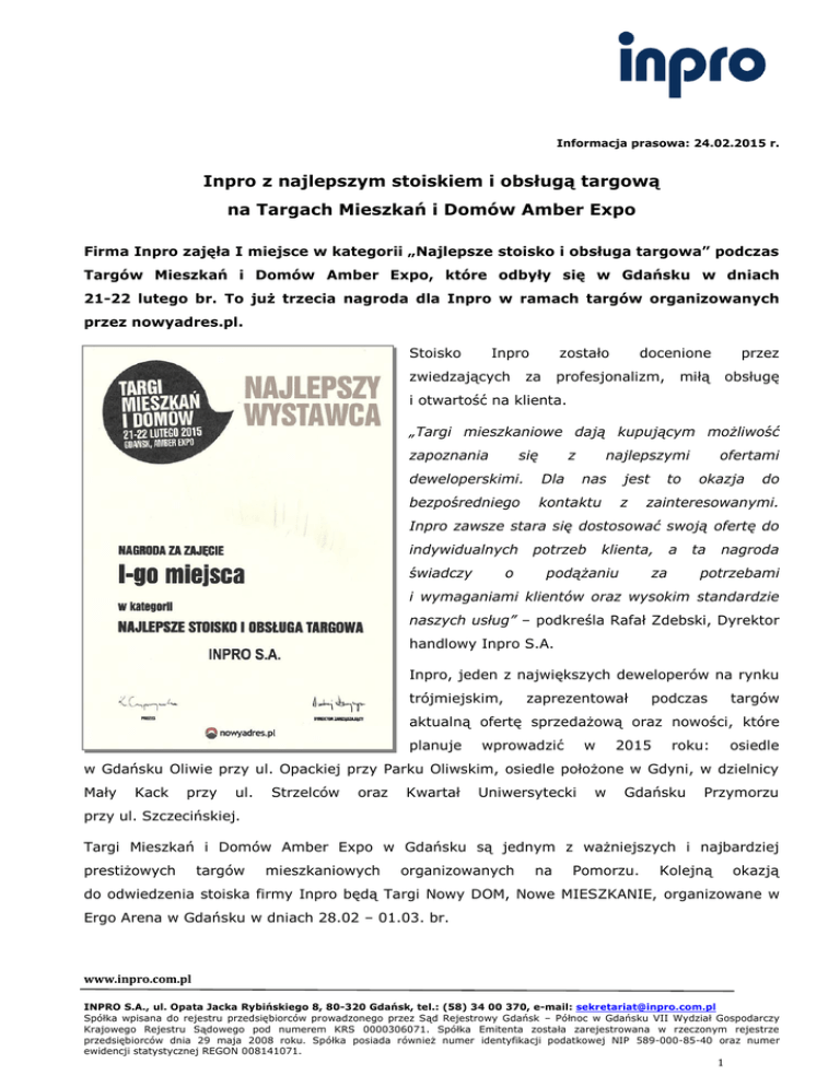 Informacja prasowa: 24.02.2015 r. Inpro z najlepszym stoiskiem i obsługą targową na Targach Mieszkań i Domów Amber Expo Firma Inpro zajęła I miejsce w kategorii „Najlepsze stoisko i obsługa targowa” podczas Targów Mieszkań i Domów Amber Expo, które odbyły się w Gdańsku w dniach 21-22 lutego br. To już trzecia nagroda dla Inpro w ramach targów organizowanych przez nowyadres.pl. Stoisko Inpro zwiedzających zostało za docenione profesjonalizm, przez miłą obsługę i otwartość na klienta. „Targi mieszkaniowe dają kupującym możliwość zapoznania się z najlepszymi deweloperskimi. Dla nas bezpośredniego kontaktu jest z to ofertami okazja do zainteresowanymi. Inpro zawsze stara się dostosować swoją ofertę do indywidualnych świadczy o potrzeb klienta, podążaniu a za ta nagroda potrzebami i wymaganiami klientów oraz wysokim standardzie naszych usług” – podkreśla Rafał Zdebski, Dyrektor handlowy Inpro S.A. Inpro, jeden z największych deweloperów na rynku trójmiejskim, zaprezentował podczas targów aktualną ofertę sprzedażową oraz nowości, które planuje wprowadzić w 2015 roku: osiedle w Gdańsku Oliwie przy ul. Opackiej przy Parku Oliwskim, osiedle położone w Gdyni, w dzielnicy Mały Kack przy ul. Strzelców oraz Kwartał Uniwersytecki w Gdańsku Przymorzu przy ul. Szczecińskiej. Targi Mieszkań i Domów Amber Expo w Gdańsku są jednym z ważniejszych i najbardziej prestiżowych targów mieszkaniowych organizowanych na Pomorzu. Kolejną okazją do odwiedzenia stoiska firmy Inpro będą Targi Nowy DOM, Nowe MIESZKANIE, organizowane w Ergo Arena w Gdańsku w dniach 28.02 – 01.03. br. www.inpro.com.pl INPRO S.A., ul. Opata Jacka Rybińskiego 8, 80-320 Gdańsk, tel.: (58) 34 00 370, e-mail: [email protected] Spółka wpisana do rejestru przedsiębiorców prowadzonego przez Sąd Rejestrowy Gdańsk – Północ w Gdańsku VII Wydział Gospodarczy Krajowego Rejestru Sądowego pod numerem KRS 0000306071. Spółka Emitenta została zarejestrowana w rzeczonym rejestrze przedsiębiorców dnia 29 maja 2008 roku. Spółka posiada również numer identyfikacji podatkowej NIP 589-000-85-40 oraz numer ewidencji statystycznej REGON 008141071. 1 *** Firma Inpro powstała w 1987 roku. Jest jedną z najbardziej uznanych i liczących się firm deweloperskich działających na rynku trójmiejskim. W swojej ofercie ma przede wszystkim apartamenty i mieszkania o podwyższonym standardzie oraz domy jednorodzinne. Spółka realizuje także inwestycje komercyjne, takie jak hotele apartamentowe i biurowce oraz świadczy usługi budowlane. Inpro kładzie nacisk przede wszystkim na doskonałe lokalizacje swoich inwestycji oraz wysoką jakość wykonania, dzięki czemu od wielu lat zajmuje wysokie miejsce w pierwszej piątce firm deweloperskich na rynku trójmiejskim. Grupa Inpro posiada wykwalifikowaną kadrę budowlaną. Firma szczególną uwagę przykłada do stosowania nowoczesnych technologii oraz nowatorskich rozwiązań technicznych i organizacyjnych. Inpro jest również w czołówce pod względem liczby sprzedanych lokali dzięki odpowiedniemu dopasowaniu oferty do wymagań klientów. Dodatkowych informacji udziela: Tauber Promotion Mariusz Skowronek tel. 22 833 35 02 w. 101, mobile: 698 612 866 [email protected] www.inpro.com.pl INPRO S.A., ul. Opata Jacka Rybińskiego 8, 80-320 Gdańsk, tel.: (58) 34 00 370, e-mail: [email protected] Spółka wpisana do rejestru przedsiębiorców prowadzonego przez Sąd Rejestrowy Gdańsk – Północ w Gdańsku VII Wydział Gospodarczy Krajowego Rejestru Sądowego pod numerem KRS 0000306071. Spółka Emitenta została zarejestrowana w rzeczonym rejestrze przedsiębiorców dnia 29 maja 2008 roku. Spółka posiada również numer identyfikacji podatkowej NIP 589-000-85-40 oraz numer ewidencji statystycznej REGON 008141071. 2