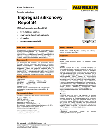 Karta Techniczna Technika BAT_S4 budowlana Impregnat silikonowy Repol S4 (Silikonimpragnierung Repol S 4) > hydrofobizuje podłoŜe > gwarantuje długotrwałe działanie > dyfuzyjny > zawiera rozpuszczalniki Właściwości produktu Badany zgodnie z Gotowy do uŜytku, jednoskładnikowy, paroprzepuszczalny, rozpuszczalnikowy preparat do hydrofobizacji podłoŜy mineralnych. Preparat na bazie siloksanów oligomerycznych, charakteryzuje się duŜą odpornością na alkaliczne podłoŜa. UniemoŜliwia wnikanie wilgoci w podłoŜe, zmniejszają intensywność wykwitów soli. PN-EN 1504-2:2006 Wyroby i systemy do ochrony i napraw konstrukcji betonowych. Stosowanie Narzędzia: Zastosowanie Pędzel, wałek malarski, pompa do natrysku powłok malarskich. Do stosowania na zewnątrz. Do impregnacji betonu licowego, betonu płukanego, gazobetonu, chłonnych kamieni naturalnych oraz sztucznych, wszelkiego rodzaju tynków mineralnych, murów z cegły ceramicznej oraz klinkierowej. Repol S4 ogranicza wnikanie wody w strukturę podłoŜa oraz wnikanie zawartych w niej pyłów, zanieczyszczeń. Zaimpregnowana powierzchnia uzyskuje więc odporność na zabrudzenia. ObniŜa zawilgocenie podłoŜa, zwiększając izolacyjność termiczną przegrody. PodłoŜe: PodłoŜe powinno być suche, elementy betonowe po demontaŜu deskowań moŜna impregnować po upływie min 24 godzin. Wilgotność podłoŜa ma wpływ na głębokość wnikania preparatu Repol S4, im bardziej suche podłoŜe tym większa skuteczność impregnacji. Szczeliny, rysy w podłoŜy o szerokości pow. 3 mm powinny zostać zaszpachlowane. NaleŜy usunąć z impregnowanej powierzchni wszelkie zanieczyszczenia, zabrudzenia, poraŜenia biologiczne - glony, pleśnie. Zaleca się zmywać powierzchnie za pomocą wody pod ciśnieniem. Powierzchnie sąsiadujące z powierzchnią impregnowaną naleŜy zabezpieczyć przez osłonięcie np.: folią PCV. Repol S4 moŜe bowiem zmniejszyć przyczepność nakładanych później powłok malarskich. Powierzchnie okien, powierzchnie drewniane oraz rośliny znajdujące się w pobliŜu impregnowanej fasady budynku powinny być osłonięte. Dane produktu Opakowanie: 1 l Puszka 6 sztuk karton - 378 sztuk paleta 5 l Puszka 4 sztuk karton - 72 sztuk paleta 25 l Puszka 16 sztuk paleta Magazynowanie: PowyŜej +5° C w suchych warunkach, w oryginalnym opakowaniach moŜna przechowywać przez ok. 12 miesięcy. Parametry techniczne Mieszanie: Impregnat silikonowy Repol S4 nakładać za pomocą pędzla, wałka malarskiego lub metodą natrysku. Preparat nakładać tak długo, aŜ podłoŜe przestanie go wchłaniać, nie dopuszczać do spływania preparatu Repol S4 po powierzchni fasady. Ciśnienie natrysku naleŜy ustawić w taki sposób aby zuŜycie preparatu było jak najmniejsze. PodłoŜa porowate o duŜej chłonności naleŜy impregnować w dwóch cyklach roboczych. Temperatura obróbki: ponad +5°C temperatura podło Ŝa oraz powietrza. Dane dotyczą warunków: 20oC i 55% wilgotność względna powietrza ZuŜycie: :* 0,2-0,5 l/m² Gęstość: 0,9 g/cm³ Zawartość cz. lotnych: 87 % Zawartość cz. stałych: 3 % Zmniejszenie nasiąkliwość: ok. 7,5 % Zmniejszenie nasiąkliwości podłoŜy alkalicznych: ok.10 % Wsp. szybkości wysychania: ponad. 10 % Głębokość wnikania: poniŜej 10 mm Czyszczenie : Ewentualne zabrudzenia usuwać benzyny przed upływem 24 godzin. *ZaleŜy od chłonności i wilgotności podłoŜa. na szorstkich chłonnych podłoŜach 1l = 2 do 3 m² na gładkich betonach 1l = 4 do 5 m² S01 4, waŜna od: 01.06.2009, MAN, strona 1 z 2 Murexin Polska Sp. z o.o. Biuro Zarządu 03-236 Warszawa, ul. Annopol 4A Tel.: +48 22 / 884 77 55, Fax: +48 22 / 814 53 31 e-mail: [email protected], Internet: www.murexin.pl 1 za pomocą Karta Techniczna Technika BAT_S4 budowlana Perfekcyjny system WaŜne informacje Iniekcja rys: Pakery REPOL IP 10, Poliuretanowa pianka uszczelniająca REPOL W-PU 14, śywica epoksydowa REPOL EP 16, śywica poliuretanowa REPOL PU 18 Przygotowanie podłoŜa: Powłoka antykorozyjna REPOL BS 7, Warstwa sczepna REPOL HS 1, Powłoka paroszczelna REPOL EP 70 BI Zaprawy naprawcze do betonu: Zaprawa Repol SM 20 / REPOL SM 40 / REPOL LM 20 Light, SzybkowiąŜąca zaprawa REPOL FM 20 H / REPOL FM 20 TS, Szpachla szara REPOL BS 05 G, Szpachla biała REPOL BS 10 W, Szpachla elastyczna REPOL ES 03 / REPOL ES 10, Szpachla drobnoziarnista REPOL BK 05, Podlewka REPOL VM 30 Powłoki ochronne, impregnacja, hydrofobizacja: Ochrona przed parowaniem Repol CS 1, Impregnacja REPOL EP1, Hydrofobizacja REPOL S4, Farba do betonu REPOL BF 1 Przestrzegać norm, obowiązujących przepisów oraz zaleceń podanych w niniejszej karcie technicznej! Nie prowadzić prac w temperaturze niŜszej niŜ +5oC. Wysoka wilgotność oraz niskie temperatury mogą być przyczyną wydłuŜenia czasu wiązania. Wysoka temperatura produktu moŜe przyczynić się do przyśpieszenia wiązania. Nie dodawać Ŝadnych obcych materiałów. S01 4, waŜna od: 01.06.2009, MAN, strona 2 z 2 Murexin Polska Sp. z o.o. Biuro Zarządu 03-236 Warszawa, ul. Annopol 4A Tel.: +48 22 / 884 77 55, Fax: +48 22 / 814 53 31 e-mail: [email protected], Internet: www.murexin.pl Bezpieczeństwo i higiena pracy BHP: przestrzegać specyfikacji oraz informacji o stosowaniu, czyszczeniu i usuwaniu podanych w karcie charakterystyki produktu. Niniejsza karta techniczna bazuje na rozległym doświadczeniu, została stworzona z najlepszej woli, nie jest prawnie wiąŜąca i nie jest ofertą w rozumieniu prawa czy teŜ gwarancją wynikającą z zamówienia lub umowy sprzedaŜy. Dla dobra naszych materiałów dołączamy ją w ramach warunków sprzedaŜy i dostawy. Aby zapobiegać ryzyku popełnienia błędów zawarto równieŜ określone (ograniczone) informacje. Naturalnie nie mogą być tam dokładnie opisane wszystkie dotychczasowe i moŜliwe zastosowania produktu. Zrezygnowano z danych, które dla fachowców są oczywiste. UŜytkownik moŜe w przypadku niejasności prze
