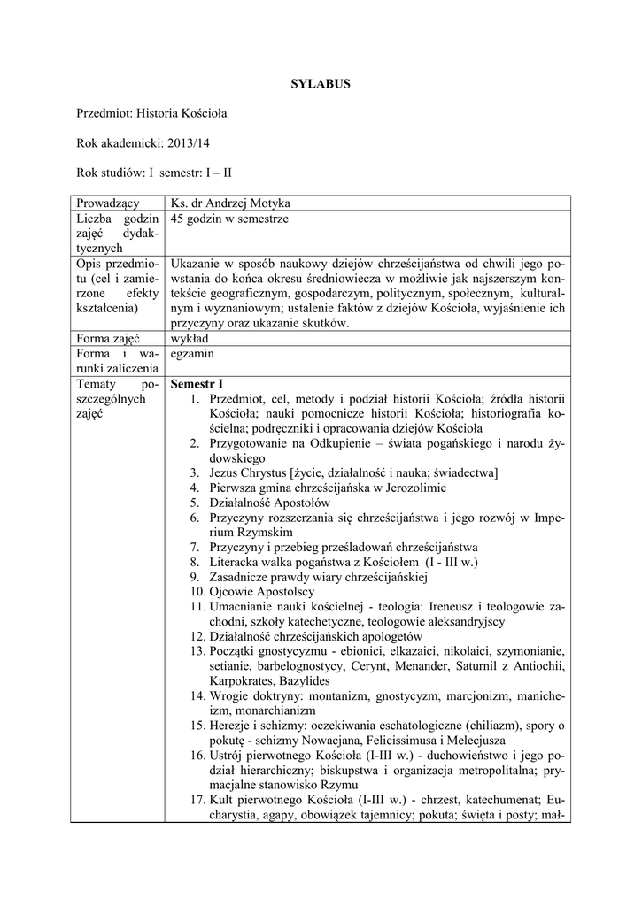 SYLABUS Przedmiot: Historia Kościoła Rok akademicki: 2013/14 Rok studiów: I semestr: I – II Prowadzący Liczba godzin zajęć dydaktycznych Opis przedmiotu (cel i zamierzone efekty kształcenia) Ks. dr Andrzej Motyka 45 godzin w semestrze Ukazanie w sposób naukowy dziejów chrześcijaństwa od chwili jego powstania do końca okresu średniowiecza w możliwie jak najszerszym kontekście geograficznym, gospodarczym, politycznym, społecznym, kulturalnym i wyznaniowym; ustalenie faktów z dziejów Kościoła, wyjaśnienie ich przyczyny oraz ukazanie skutków. Forma zajęć wykład Forma i wa- egzamin runki zaliczenia Tematy po- Semestr I szczególnych 1. Przedmiot, cel, metody i podział historii Kościoła; źródła historii zajęć Kościoła; nauki pomocnicze historii Kościoła; historiografia kościelna; podręczniki i opracowania dziejów Kościoła 2. Przygotowanie na Odkupienie – świata pogańskiego i narodu żydowskiego 3. Jezus Chrystus [życie, działalność i nauka; świadectwa] 4. Pierwsza gmina chrześcijańska w Jerozolimie 5. Działalność Apostołów 6. Przyczyny rozszerzania się chrześcijaństwa i jego rozwój w Imperium Rzymskim 7. Przyczyny i przebieg prześladowań chrześcijaństwa 8. Literacka walka pogaństwa z Kościołem (I - III w.) 9. Zasadnicze prawdy wiary chrześcijańskiej 10. Ojcowie Apostolscy 11. Umacnianie nauki kościelnej - teologia: Ireneusz i teologowie zachodni, szkoły katechetyczne, teologowie aleksandryjscy 12. Działalność chrześcijańskich apologetów 13. Początki gnostycyzmu - ebionici, elkazaici, nikolaici, szymonianie, setianie, barbelognostycy, Cerynt, Menander, Saturnil z Antiochii, Karpokrates, Bazylides 14. Wrogie doktryny: montanizm, gnostycyzm, marcjonizm, manicheizm, monarchianizm 15. Herezje i schizmy: oczekiwania eschatologiczne (chiliazm), spory o pokutę - schizmy Nowacjana, Felicissimusa i Melecjusza 16. Ustrój pierwotnego Kościoła (I-III w.) - duchowieństwo i jego podział hierarchiczny; biskupstwa i organizacja metropolitalna; prymacjalne stanowisko Rzymu 17. Kult pierwotnego Kościoła (I-III w.) - chrzest, katechumenat; Eucharystia, agapy, obowiązek tajemnicy; pokuta; święta i posty; mał- żeństwo; spór o ważność chrztu heretyków, spór o datę święcenia Wielkanocy 18. Rozprzestrzenianie się chrześcijaństwa poza granicami Imperium Rzymskiego - Cesarstwo Sassanidzkie, Armenia, kraje kaukaskie, kraje arabskie, Etiopia 19. Polityka kościelna Konstantyna Wielkiego i jego następców 20. Polityka kościelna cesarzy rzymskich (2 poł. IV w. - 1 poł. V w.) 21. Rozwój chrześcijaństwa w Cesarstwie Rzymskim - chrystianizacja łacińskiego Zachodu, ewangelizacja arystokracji i inteligencji, nawrócenie wsi 22. Złoty wiek Ojców Kościoła 23. Życie chrześcijańskie przy końcu czwartego stulecia - organizacja Kościoła; liturgia i sakramenty; formy pobożności; kult męczenników; pielgrzymki. Wpływ chrześcijaństwa na życie publiczne (prawodawstwo, obyczaje, dobroczynność) 24. Początki i rozwój życia zakonnego 25. Arianizm. I Sobór Powszechny w Nicei (325) 26. Spór o bóstwo Ducha Świętego. II Sobór Powszechny 27. Donatyzm. Apolinaryzm. Pelagianizm 28. Nestorianizm. III Sobór Powszechny 29. Monofizytyzm. IV Sobór Powszechny 30. Schizma akacjańska 31. Dzieje Kościoła poza granicami Cesarstwa (V-VI w.): a) Kościół w Persji b) Armenia i kraje kaukaskie c) Kościół etiopski d) Rozwój chrześcijaństwa w Nubii i Arabii Południowej 32. Chrześcijaństwo wśród Germanów podczas i po okresie wędrówek ludów 33. Chrześcijaństwo wśród Celtów i Anglosasów na Wyspach Brytyjskich (do XI w.) 34. Hierarchia kościelna (IV-VIII w.) - nowe urzędy kościelne; wykształcenie, utrzymanie, kwalifikacje i przywileje stanowe kleru 35. Ustrój Kościoła (IV-VIII w.) - powstanie parafii, prywatne kościoły na Zachodzie, organizacja patriarchatów, synody 36. Papiestwo i prymat Rzymu. Leon Wielki i Grzegorz Wielki. Stosunek państwa i Kościoła. 37. Kościół merowiński i Kościół frankoński (604-888). 38. Kościół niemiecki (754-1039) 39. Kościół na półwyspie iberyjskim (711-800) 40. Chrystianizacja ludów północnych: Dania, Norwegia, Islandia, Szwecja 41. Chrystianizacja Słowian i Węgrów: Chorwaci, Czesi (Św. Wojciech), Wieleci (metropolia magdeburska), Rusini, Węgrzy 42. Kult publiczny i życie religijne (VII-XI w.) Semestr II 1. Obrazoburstwo. VII Sobór Powszechny 2. Islam – geneza, nauka i rozwój 3. Powstanie Państwa Kościelnego 4. Polityka kościelna Karolingów. Renesans Karoliński 5. Spór Focjański. VIII Sobór Powszechny 6. Apostołowie Europy: św. Bonifacy, św. Cyryl-Konstantyn i św. Metody-Michał 7. Kryzys papiestwa w IX i X wieku. „Saeculum obscurum”. Legenda o Joannie Papieżycy 8. Cesarstwo Rzymskie Narodu Niemieckiego. Działalność polityczno-kościelna Ottona Wielkiego, Ottona II i Ottona III 9. Kościół bizantyjski w przededniu Wielkiej Schizmy. Wielka Schizma z 1054 r. 10. Reforma Kościoła w XI w. (gregoriańska) a) Sytuacja społeczno-demograficzna Europy w dobie reformy gregoriańskiej b) Reformatorski ruch kluniacki c) Wypracowanie programu reform d) Działalność reformatorska papieża Grzegorza VII (10731085) 11. Dzieje reformy kościelnej za pontyfikatów następców Grzegorza VII a) Wiktor III (1086-1087), Urban II (1088-1099), Paschalis II (1099-1118), Gelazy II (1118-1119), Kalikst II (1119-1124); cesarz Henryk V (1106-1125) b) Konkordat wormacki - 1122 c) I i II Sobór Laterański d) Schizma Anakleta 12. Konfrontacja powszechnego papiestwa z powszechnym cesarstwem a) Polityka kościelna cesarza Fryderyka Barbarossy (11521190) b) Pontyfikat papieża Aleksandra III (1159-1181) c) XI Sobór Powszechny (Laterański III) w 1179 d) Cesarstwo i papiestwo w latach 1181-1198 13. Dzieje papiestwa od pontyfikatu Innocentego III do pontyfikatu Bonifacego VIII a) Papież Innocenty III (1198-1216) b) Sobór Laterański IV