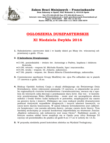 Zakon Braci Mniejszych – Franciszkanów Dom Zakonny w Opolu, Plac Wolności 2, 45-018 Opole Tel: (77) 454-89-09 Fax: (77) 454-89-09 wew.11 Internet: www.opole.franciszkanie.pl; e-mail: [email protected] Regon: 040015944 NIP: 754 13 06 412 Konto: PKO SA, nr 45 1240 1633 1111 0010 1505 9579 OGŁOSZENIA DUSZPASTERSKIE XI Niedziela Zwykła 2016 1. Nabożeństwo czerwcowe dziś i w każdy dzień po Mszy św. wieczornej odprawianej o godz. 19.oo. 2. Z kalendarza liturgicznego: ●13.06. poniedziałek – święto św. Antoniego z Padwy, kapłana i doktora Kościoła ●14.06. wtorek – wspom bł. Michała Kozala, bpa i męczennika. ●15.06. środa – wspom. bł. Jolanty, zakonnicy. ●17.06. piątek – wspom. św. Brata Alberta Chmielowskiego, zakonnika. 3. Comiesięczne spotkanie Grupy Modlitwy św. ojca Pio odbędzie się w piątek 17 czerwca o godz. 18.oo. 4. Biskup Opolski Andrzej Czaja z okazji zbliżającego się Światowego Dnia Krwiodawcy, który rokrocznie przypada 14 czerwca, w odpowiedzi na prośbę regionalnych centrów krwiodawstwa i krwiolecznictwa, zwraca się z apelem do wiernych całej diecezji o przekazanie daru krwi. Dar ten - w kontekście przeżywanego Roku Miłosierdzia - może stać się szczególnym aktem miłości i troski wobec ludzi będących w potrzebie, znajdujących się często na granicy życia i śmierci. Zbliżający się czas wakacji zwykle dramatycznie podnosi statystyki wypadków drogowych i innych zdarzeń losowych, co czyni krew darem bezcennym. W opinii lekarzy krwiodawstwo jest całkowicie bezpieczne i nie naraża zdrowia dawcy, ratując często życie biorcy. Tym bardziej zechciejmy je uczynić konkretną odpowiedzią na wezwanie Jezusa: „Bądźcie miłosierni, jak miłosierny jest wasz Ojciec”. Najbliższy punkt, w którym można oddać krew znajduje się w Opolu przy ulicy Kośnego 55 czynny od poniedziałku do piątku od godź 8.oo-17.oo w soboty do 13.3o. 5. W przyszłą niedzielę przed kościołem zbiórka na Wydział Teologiczny.