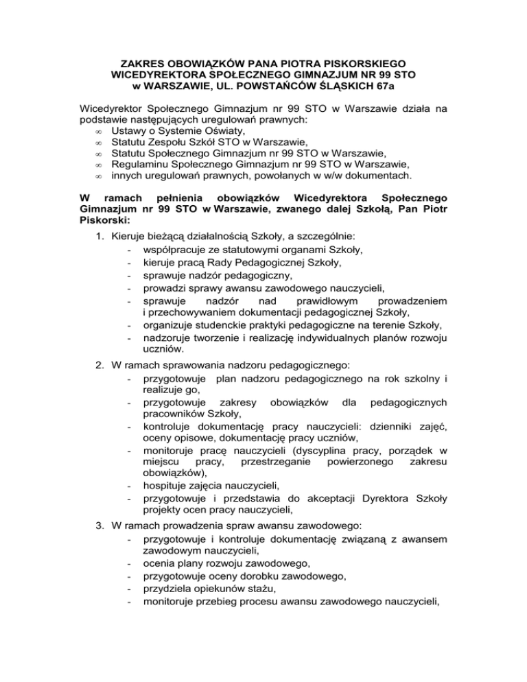 ZAKRES OBOWIĄZKÓW PANA PIOTRA PISKORSKIEGO WICEDYREKTORA SPOŁECZNEGO GIMNAZJUM NR 99 STO w WARSZAWIE, UL. POWSTAŃCÓW ŚLĄSKICH 67a Wicedyrektor Społecznego Gimnazjum nr 99 STO w Warszawie działa na podstawie następujących uregulowań prawnych: • Ustawy o Systemie Oświaty, • Statutu Zespołu Szkół STO w Warszawie, • Statutu Społecznego Gimnazjum nr 99 STO w Warszawie, • Regulaminu Społecznego Gimnazjum nr 99 STO w Warszawie, • innych uregulowań prawnych, powołanych w w/w dokumentach. W ramach pełnienia obowiązków Wicedyrektora Społecznego Gimnazjum nr 99 STO w Warszawie, zwanego dalej Szkołą, Pan Piotr Piskorski: 1. Kieruje bieŜącą działalnością Szkoły, a szczególnie: - współpracuje ze statutowymi organami Szkoły, - kieruje pracą Rady Pedagogicznej Szkoły, - sprawuje nadzór pedagogiczny, - prowadzi sprawy awansu zawodowego nauczycieli, - sprawuje nadzór nad prawidłowym prowadzeniem i przechowywaniem dokumentacji pedagogicznej Szkoły, - organizuje studenckie praktyki pedagogiczne na terenie Szkoły, - nadzoruje tworzenie i realizację indywidualnych planów rozwoju uczniów. 2. W ramach sprawowania nadzoru pedagogicznego: - przygotowuje plan nadzoru pedagogicznego na rok szkolny i realizuje go, - przygotowuje zakresy obowiązków dla pedagogicznych pracowników Szkoły, - kontroluje dokumentację pracy nauczycieli: dzienniki zajęć, oceny opisowe, dokumentację pracy uczniów, - monitoruje pracę nauczycieli (dyscyplina pracy, porządek w miejscu pracy, przestrzeganie powierzonego zakresu obowiązków), - hospituje zajęcia nauczycieli, - przygotowuje i przedstawia do akceptacji Dyrektora Szkoły projekty ocen pracy nauczycieli, 3. W ramach prowadzenia spraw awansu zawodowego: - przygotowuje i kontroluje dokumentację związaną z awansem zawodowym nauczycieli, - ocenia plany rozwoju zawodowego, - przygotowuje oceny dorobku zawodowego, - przydziela opiekunów staŜu, - monitoruje przebieg procesu awansu zawodowego nauczycieli, - przygotowuje pracę komisji na stopień nauczyciela kontraktowego i nauczyciela mianowanego, prowadzi korespondencję związaną z awansem zawodowym nauczycieli. 4. Utrzymuje bieŜący kontakt z rodzicami uczniów poprzez:: - pełnienie stałych dyŜurów na terenie szkoły, w wymiarze nie mniejszym niŜ 2 godziny tygodniowo, - pełnienie dyŜuru w terminach dni otwartych oraz klasowych zebrań rodziców, - wyznaczanie terminów spotkań w sytuacjach nagłych, - oddanie do dyspozycji interesantów adresu poczty elektronicznej i odpowiadania na otrzymaną tą drogą korespondencję bez nieuzasadnionej zwłoki.