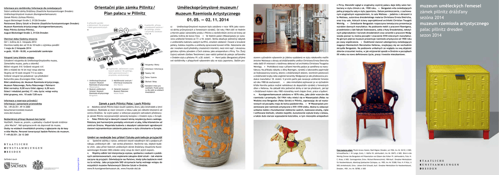 Informace pro návštěvníky / Informacje dla zwiedzających Státní umělecké sbírky Drážďany (Staatliche Kunstsammlungen Dresden) Uměleckoprůmyslové muzeum (Kunstgewerbemuseum) Zámek Pillnitz (Schloss Pillnitz), August-Böckstiegel-Straße 2, 01326 Dresden Państwowe Zbiory Sztuki w Dreźnie (Staatliche Kunstsammlungen Dresden) Muzeum Rzemiosła Artystycznego (Kunstgewerbemuseum), Pałac Pillnitz (Schloss Pillnitz), August-Böckstiegel-Straße 2, 01326 Dresden Orientační plán zámku Pillnitz / Plan pałacu w Pillnitz K přístavišti parníků a občerstvení / Do przystani i lokali gastronomicznych ← 1 K parkovišti, přívozu a autobusové zastávce / Do parkingu, promu i przystanku autobusowego → Elbe Otevírací doba / Godziny otwarcia Od 1. května do 2. listopadu 2014 Otevřeno každý den od 10 do 18 hodin s výjimkou pondělí 1 maja do 2 listopada 2014 w godz. 10.00 – 18.00, w poniedziałki zamknięte 4 2 Vstupné / ceny biletów wstępu Celodenní vstupenka do Uměleckoprůmyslového muzea, Zámeckého muzea, parku a skleníků Běžné vstupné: 8 € / Snížené vstupné: 6 € Děti a mládež do 16 let mají vstup zdarma Skupiny od 10 osob vstupné 7 € na osobu Snížené vstupné lze požadovat i po předložení Kulturního pasu (Euroregion Elbe / Labe) Bilet całodniowy do: Muzeum Rzemiosła Artystycznego, Muzeum Pałacowego, Parku Pałacowego i Palmiarni Bilet normalny: 8,00 euro / bilet ulgowy: 6,00 euro Dzieci i młodzież poniżej 17. roku życia: wstęp wolny bilet grupowy, min. 10 osób 7,00 euro 3 Uměleckoprůmyslové muzeum bylo založeno v roce 1876 jako vzorová sbírka průmyslových a řemeslných výrobků. Od roku 1964 sídlí ve Vodním a Horním paláci zámeckého areálu v Pillnitz a návštěvníkům otvírá své brány od počátku května do konce října. • Ve Vodním paláci (Wasserpalais) je vystaveno umělecké řemeslo ze 17. a 18. století. Sbírka obsahuje jedinečný nábytek z uměleckého kabinetu saských kurfiřtů, emailem zdobené i řezané a broušené poháry, italskou majoliku a umělecky zpracované kované mříže. Nalezneme zde ale i mnohem starší předměty z kostelních interiérů, mezi nimi např. i skvostnou gotickou výšivku původem z Čech známou jako antependium z Pirny. Tzv. Žlutý čajový salónek (Gelbes Teezimmer) zase nabízí pohled do pokoje zařízeného v čínském stylu z přelomu 19. a 20. století. • Horní palác (Bergpalais) přijímá své návštěvníky v přepychově vybaveném sálu ve stylu japonismu. Dalším procz Vstupenky / Bilety ↓ K parkovišti, občerstvení a auto busové zastávce / Do parkingu, lokali gastronomicznych i przystanku autobusowego Informace / Informacja Toalety / WC Šatna / Szatnia 1 2 Informace a rezervace průvodců / Informacja i zamawianie przewodnika Tel. +49 (0) 351 . 49 14 2000 [email protected] www.skd.museum Uměleckoprůmyslové muzeum / Muzeum Rzemiosła Artystycznego Wasserpalais Muzeum uměleckých řemesel / Muzeum Rzemiosła Artystycznego Bergpalais 3 Návštěvnické centrum / Informacja turystyczna Alte Wache 4 Zámecké muzeum / Muzeum Pałacowe Neues Palais Obchod / Sklep Kontaktní místo pro vozíčkáře / Punkt pomocy dla osób na wózkach inwalidzkich Zámek a park Pillnitz / Pałac i park Pillnitz Malebný zámek Pillnitz kdysi sloužil saskému dvoru jako letohrádek a letní rezidence. Rozkládá se mezi vinicemi a řekou Labe jen několik kilometrů od centra Drážďan. Se svými paláci a velkoryse pojatými zahradami představuje zámek Pillnitz nejvýznamnější zámecký komplex v čínském stylu v Evropě. Pałac Pillnitz był w dawnych czasach letnią rezydencją dworu saskiego. pl Położony jest harmonijnie pomiędzy winnicami a Łabą, kilka kilometrów od centrum Drezna. Wspaniała budowla z okazałymi założeniami ogrodowymi stanowi najznamienitsze założenie pałacowe w stylu chinoiserie w Europie. cz Bezbariérový přístup / Muzeum bez barier Vozíčkáři, hlaste se, prosím, u pokladny v budově bývalé strážnice „Alte Wache“. Náš spolupracovník vás doprovodí do muzea. Osoby na wózkach inwalidzkich prosimy o zgłaszanie się do kasy w Alte Wache. Personel towarzyszyć będzie Państwu do muzeum. T +49 (0) 351 . 26 13 260 Umění se neobejde bez přátel / Sztuka potrzebuje przyjaciół Společné zážitky z výstav, setkávání stejně naladěných lidí a podpora při nákupu uměleckých děl – tak vzniká přátelství. Navštivte nás, kdykoli budete chtít. Jako přítel Státních uměleckých sbírek Drážďany (Staatliche Kunstsammlungen Dresden SKD) získáte volný vstup do všech jejích expozic. Wspólny odbiór lub interpretacja wystaw, spotkania z osobami o podobpl nych zainteresowaniach, oraz wspieranie zakupów dzieł sztuki – tak właśnie zaczyna się przyjaźń. Odwiedzajcie nas Państwo, kiedy tylko będziecie mieli na to ochotę. Jako przyjaciele SKD otrzymacie kartę wolnego wstępu do wszystkich muzeów Państwowych Zbiorów Sztuki w Dreźnie. www.fk-kunstgewerbemuseum.de, www.freunde-skd.de z Pirny. Niewielki wgląd w oryginalny wystrój pałacu daje żółty salon herbaciany w stylu chinois z ok. 1900 roku. • Bergpalais wita zwiedzających pełną przepychu salą w stylu japonizmu. Dalsze pomieszczenia, z zachowanym oryginalnym wyposażeniem, to sala Watteau – jadalnia z obrazami à la Watteau, autorstwa drezdeńskiego malarza Christiana Ernsta Dietricha, oraz trzy sale, których ściany zaprojektował architekt Christian Traugott Weinlig. • Zwiedzanie Bergpalais rozpoczyna tematyczna prezentacja wyrobów dawnych manufaktur. Na podstawie mebli z pracowni Roentgena, przedmiotów z laki fabryki Stobwassera, szkła z Huty Drezdeńskiej, tekstylnych półproduktów i koronek drezdeńskich oraz ceramiki z pracowni Wedgwooda poznać tu można początki i znaczenie XVIII-wiecznych manufaktur. Na górnym piętrze muzeum prezentuje rzemiosło arty