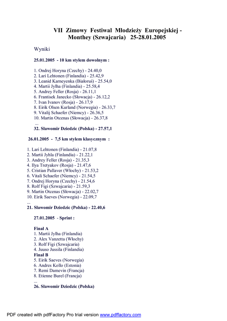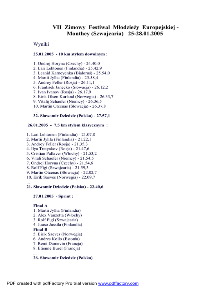 VII Zimowy Festiwal Młodzieży Europejskiej Monthey (Szwajcaria) 25-28.01.2005 Wyniki 25.01.2005 - 10 km stylem dowolnym : 1. Ondrej Horyna (Czechy) - 24.40,0 2. Lari Lehtonen (Finlandia) - 25.42,9 3. Leanid Karneyenka (Białoruś) - 25.54,0 4. Martii Jylha (Finlandia) - 25.58,4 5. Andrey Feller (Rosja) - 26.11,1 6. Frantisek Janecko (Słowacja) - 26.12,2 7. Ivan Ivanov (Rosja) - 26.17,9 8. Eirik Olsen Kurland (Norwegia) - 26.33,7 9. Vitalij Schaefer (Niemcy) - 26.36,5 10. Martin Otcenas (Słowacja) - 26.37,8 ... 32. Sławomir Dziedzic (Polska) - 27.57,1 26.01.2005 - 7,5 km stylem klasycznym : 1. Lari Lehtonen (Finlandia) - 21.07,8 2. Martii Jyhla (Finlandia) - 21.22,1 3. Andrey Feller (Rosja) - 21.35,3 4. Ilya Tretyakov (Rosja) - 21.47,6 5. Cristian Pallaver (Włochy) - 21.53,2 6. Vitali Schaefer (Niemcy) - 21.54,5 7. Ondrej Horyna (Czechy) - 21.54,6 8. Rolf Figi (Szwajcaria) - 21.59,3 9. Martin Otcenas (Słowacja) - 22.02,7 10. Eirik Saeves (Norwegia) - 22.09,7 ... 21. Sławomir Dziedzic (Polska) - 22.40,6 27.01.2005 - Sprint : Finał A 1. Martii Jylha (Finlandia) 2. Alex Vanzetta (Włochy) 3. Rolf Figi (Szwajcaria) 4. Juuso Jussila (Finlandia) Finał B 5. Eirik Saeves (Norwegia) 6. Andres Kollo (Estonia) 7. Remi Damevin (Francja) 8. Etienne Burel (Francja) ... 26. Sławomir Dziedzic (Polska) PDF created with pdfFactory Pro trial version www.pdffactory.com 28.01.2005 - Bieg drużyn mieszanych - 4 x 7,5 km stylem dowolnym : 1. Czechy - 0:57.51,3 (J. Rykr, E. Hajkova, O. Horyna, L. Munclingerova) 2. Rosja - 0:57.54,2 (A. Feller, L. Shaydurova, I. Tretyakov, D. Sapronova) 3. Słowacja - 0:58.11,8 (M. Otcenas, K. Garajova, F. Janecko, B. Blaskova) 4. Finlandia - 0:58.12,5 (L. Lehtonen, T. Taskinen, M. Jylha, A. Kyllonen) 5. Norwegia - 0:58.17,0 (E. Saeves, I. Nilsen, Eirik Olsen-Kurland, M. Fredriksen) 6. Szwajcaria - 0:58.55,9 (R. Figi, T. Stiffler, L. Zemp, M. Roesti) 7. Niemcy - 0:59.19,8 (V. Schafer, D. Herrmann, R. Metze, C. Straube) 8. Białoruś - 0:59,48,3 (U. Semenenka, Y. Hrakovicz, L. Karneyenka, N. Akunevich) 9. Ukraina - 1:00.00,2 (A. Mashko, M. Losyeva, V. Latkovsky, M. Antsybor) 10. Polska - 1:00.31,9 ( S. Dziedzic, A. Prekurat, P. Tkacz, A. Staręga) Gratulujemy zawodnikom wspaniałych wyników. PDF created with pdfFactory Pro trial version www.pdffactory.com