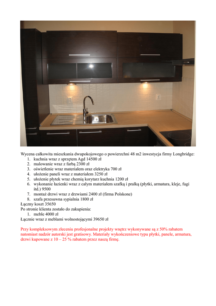 Wycena całkowita mieszkania dwupokojowego o powierzchni 48 m2 inwestycja firmy Longbridge: 1. kuchnia wraz z sprzętem Agd 14500 zł 2. malowanie wraz z farbą 2300 zł 3. oświetlenie wraz materiałem oraz elektryka 700 zł 4. ułożenie paneli wraz z materiałem 3250 zł 5. ułożenie płytek wraz chemią korytarz kuchnia 1200 zł 6. wykonanie łazienki wraz z całym materiałem szafką i pralką (płytki, armatura, kleje, fugi itd.) 9500 7. montaż drzwi wraz z drzwiami 2400 zł (firma Polskone) 8. szafa przesuwna sypialnia 1800 zł Łączny koszt 35650 Po stronie klienta zostało do zakupienia: 1. meble 4000 zł Łącznie wraz z meblami wolnostojącymi 39650 zł Przy kompleksowym zleceniu profesjonalne projekty wnętrz wykonywane są z 50% rabatem natomiast nadzór autorski jest gratisowy. Materiały wykończeniowe typu płytki, panele, armatura, drzwi kupowane z 10 – 25 % rabatem przez naszą firmę. Łazienka: Szafa: