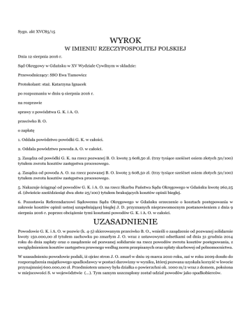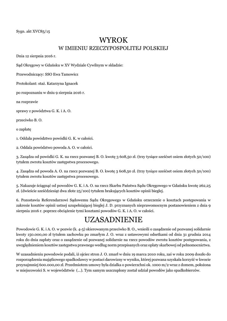 Sygn. akt XVC85/15 WYROK W IMIENIU RZECZYPOSPOLITEJ POLSKIEJ Dnia 12 sierpnia 2016 r. Sąd Okręgowy w Gdańsku w XV Wydziale Cywilnym w składzie: Przewodniczący: SSO Ewa Tamowicz Protokolant: staż. Katarzyna Ignacek po rozpoznaniu w dniu 9 sierpnia 2016 r. na rozprawie sprawy z powództwa G. K. i A. O. przeciwko B. O. o zapłatę 1. Oddala powództwo powódki G. K. w całości. 2. Oddala powództwo powoda A. O. w całości. 3. Zasądza od powódki G. K. na rzecz pozwanej B. O. kwotę 3 608,50 zł. (trzy tysiące sześćset osiem złotych 50/100) tytułem zwrotu kosztów zastępstwa procesowego. 4. Zasądza od powoda A. O. na rzecz pozwanej B. O. kwotę 3 608,50 zł. (trzy tysiące sześćset osiem złotych 50/100) tytułem zwrotu kosztów zastępstwa procesowego. 5. Nakazuje ściągnąć od powodów G. K. i A. O. na rzecz Skarbu Państwa Sądu Okręgowego w Gdańsku kwotę 262,25 zł. (dwieście sześćdziesiąt dwa złote 25/100) tytułem brakujących kosztów opinii biegłej. 6. Pozostawia Referendarzowi Sądowemu Sądu Okręgowego w Gdańsku orzeczenie o kosztach postępowania w zakresie kosztów opinii ustnej uzupełniającej biegłej J. D. przyznanych nieprawomocnym postanowieniem z dnia 9 sierpnia 2016 r. poprzez obciążenie tymi kosztami powodów G. K. i A. O. w całości. UZASADNIENIE Powodowie G. K. i A. O. w pozwie (k. 4-5) skierowanym przeciwko B. O., wnieśli o zasądzenie od pozwanej solidarnie kwoty 150.000,00 zł tytułem zachowku po zmarłym J. O. wraz z ustawowymi odsetkami od dnia 31 grudnia 2014 roku do dnia zapłaty oraz o zasądzenie od pozwanej solidarnie na rzecz powodów zwrotu kosztów postępowania, z uwzględnieniem kosztów zastępstwa prawnego według norm przepisanych oraz opłaty skarbowej od pełnomocnictwa. W uzasadnieniu powodowie podali, iż ojciec stron J. O. zmarł w dniu 19 marca 2010 roku, zaś w roku 2009 doszło do rozporządzenia majątkowego spadkodawcy w postaci darowizny w wyniku, której pozwana uzyskała korzyść w kwocie przynajmniej 600.000,00 zł. Przedmiotem umowy była działka o powierzchni ok. 1000 m/2 wraz z domem, położona w miejscowości S. w województwie (...). Tym samym uszczuplony został udział powodów jako spadkobierców. Pozwana uznała dług wynikający z zachowku, kierując do powodów pismo z dnia 2 stycznia 2015 roku, w którym oświadczyła, że nie uchyla się od zapłaty należnego im zachowku, lecz wskazała, że nie dysponuje środkami pieniężnymi, które mogłaby na ten cel przeznaczyć. W wykonaniu zobowiązania Sądu, powodowie w piśmie z dnia 30 kwietnia 2015 roku sprecyzowali żądanie pozwu, oświadczając, iż żądają zasądzenia na rzecz każdego z nich po 75.000,00 zł. Jednoczenie powodowie wyjaśnili, iż spadkobiercami ustawowymi po zmarłym J. O. są: W. O., A. O., B. O.i G. K.w częściach po ¼ spadku (k. 17). W odpowiedzi na pozew (k. 25-29), pozwana B. O. nie kwestionowała roszczenia powodów, co do zasady, lecz zakwestionowała je, co do wysokości. Wniosła o sprawdzenie podanej przez powodów wartości przedmiotu sporu 150.000,00 zł i ustalenie, że wartość przedmiotu sporu dla roszczenia każdego z powodów to 75.000 zł oraz przekazanie sprawy Sądowi Rejonowemu Gdańsk-Północ w Gdańsku jako właściwemu rzeczowo i miejscowo do jej rozpoznania. Wnosiła także o odstąpienie od obciążania pozwanej kosztami procesu. W uzasadnieniu pozwana wskazała, iż powództwo jest usprawiedliwione, co do zasady, ale nie, co do wysokości, którą zakwestionowała tak, co do roszczenia głównego, jak i co do odsetek ustawowych. W pierwszej kolejności pozwana zarzuciła powodom znaczne zawyżenie wartości przedmiotu darowizny – nieruchomości zabudowanej piętrowym, jednorodzinnym domem mieszkalnym wybudowanym w 1976 roku o powierzchni użytkowej około 100 m2. Wskazała, że posadowiony na nieruchomości budynek mieszkalny ma 40 lat i wymaga generalnego remontu. Po 2007 roku dokonała nakładów na nieruchomość w postaci m. in. remontu łazienki, wykonania instalacji kanalizacyjnej oraz wybudowania kominka. Pozwana podniosła, iż w pozwie błędnie wyliczono wysokość zachowku, albowiem jako substrat zachowku przyjęto wartość całej darowanej nieruchomości, gdy tymczasem darowizna na rzecz pozwanej dokonana została w dniu 21 lipca 2007 roku z majątku wspólnego rodziców stron - ojca J. O. i matki W. O., a zatem substratem zachowku po zmarłym ojcu winna być jedynie połowa wartości darowanej nieruchomości. Pozwana wskazała także, iż darowana nieruchomość nie była jedynym składnikiem majątku spadkodawcy. W dacie otwarcia spadku spadkodawca wraz z małżonką byli współwłaścicielami na prawach wspólności ustawowej majątkowej małżeńskiej nieruchomości położonej w G., stanowiącej grunt w użytkowaniu wieczystym zabudowany budynkiem garażu objętej księgą wieczystą Sądu Rejonowego Gdańsk-Północ w Gdańsku o nr (...). Nadto spadkodawca był właścicielem maszyn, urządzeń i innych ruchomości, stanowiących wyposażenie piekarni, którą prowadził do śmierci razem z powodem. Składniki te po śmierci ojca sprzedane zostały przez powoda, który nie podzielił się uzyskanymi ze sprzedaży pieniędzmi z pozostałymi spadkobiercami. Należny powodowi zachowek powinien zostać pomniejszony o zatrzymane przez niego kwoty. Pozwana zakwestionowała żądanie zapłaty odsetek ustawowych od kwoty 150.000,00 zł od dnia 31 grudnia 2014 roku, gdyż odsetki winny być naliczane dopiero od daty wymagalności roszczenia, zaś roszczenie o zachowek staje się wymagalne z chwilą określenia przez sąd jego wysokości. Na rozprawie w dniu 9 sierpnia 2016 roku (k. 157-158) pełnomocnik pozwanej oświadczyła, że w niniejszej sprawie należy dokonać zaliczenia kwot zatrzymanych przez powoda na zachowek, którego powód się domaga i wniosła o oddalenie powództwa, albowiem powodowie otrzymali zachowek w postaci powołania do spadku i nie przysługuje i